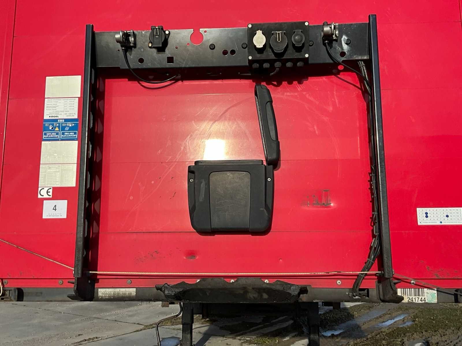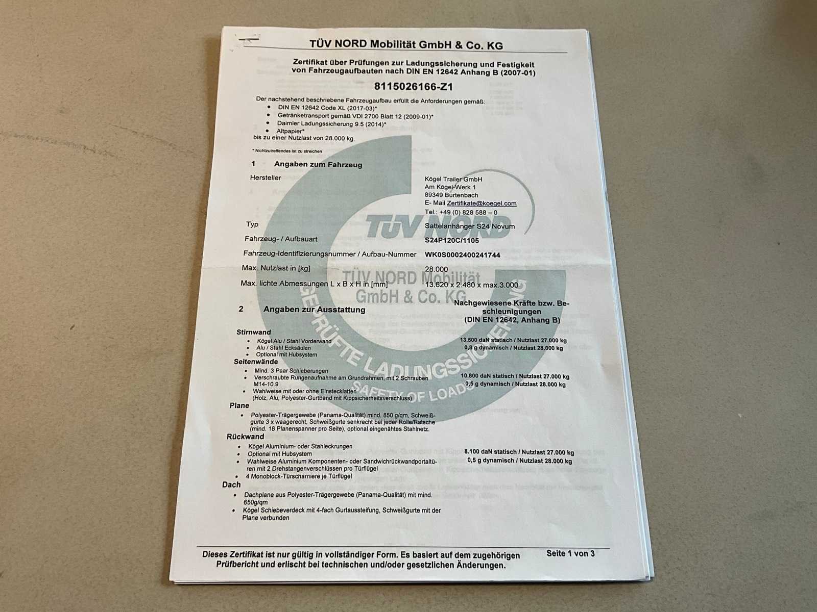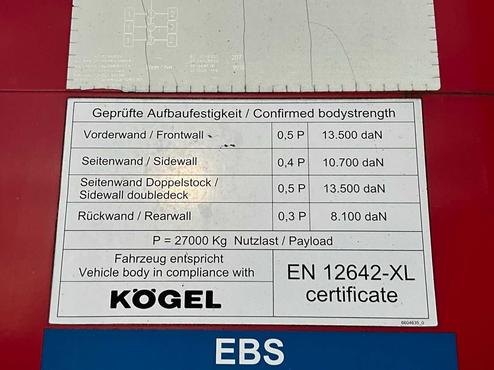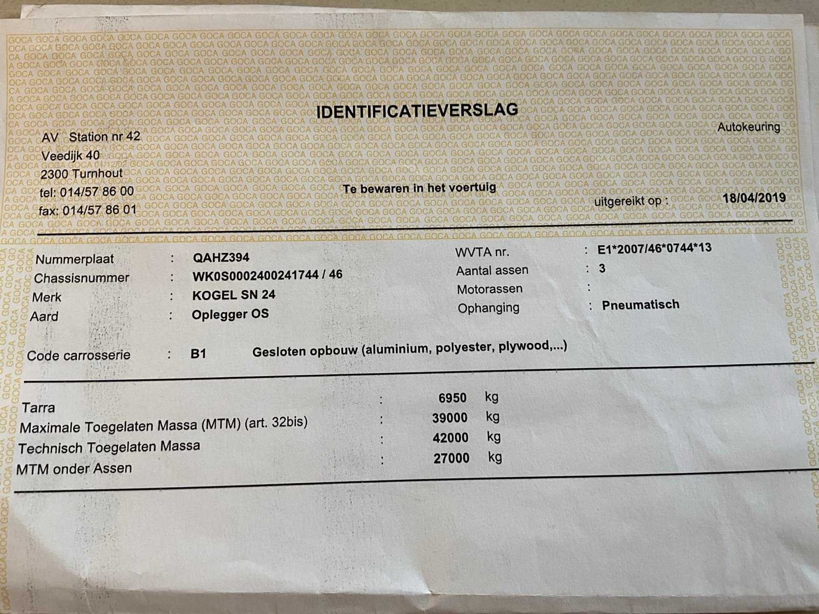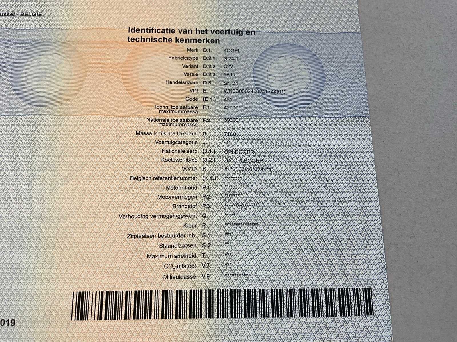 Voorzien van WABCO SmartBoard, liftas, pneumatische ophanging, steunpoten JOST Modul B0402, reserveband. Bandenmaat: 385/65 R22.5. Profieldiepte banden: 6,67mm, 6,52mm, 14,1mm, 5,99mm, 6,85mm, 7,52mm. Aanwezige documenten: Kentekenbewijs deel I, Kentekenbewijs deel II, Identificatieverslag, Gelijkvormigheidsattest, Keuringsbewijs, TÜV Nord certificaat. Merk: KÖGEL Type: SN 24 Type aanhangwagencarrosserie: Schuifzeilaanhangwagen Bouwjaar: 2019 Chassisnummer VIN: WK0S0002400241744 Datum eerste toelating: 8/4/2019 APK vervaldatum: 28/4/2026 Aantal assen: 3 Laadvermogen: 34820kg Eigen gewicht: 7180kg Totale afmeting L: 13950mm Totale afmeting Breedte: 2550mm Totale afmeting Hoogte: 4000mm
