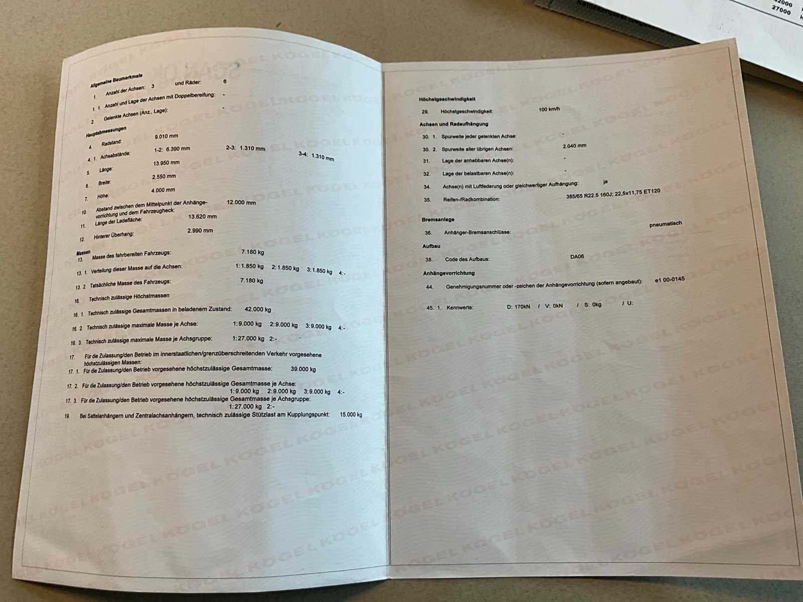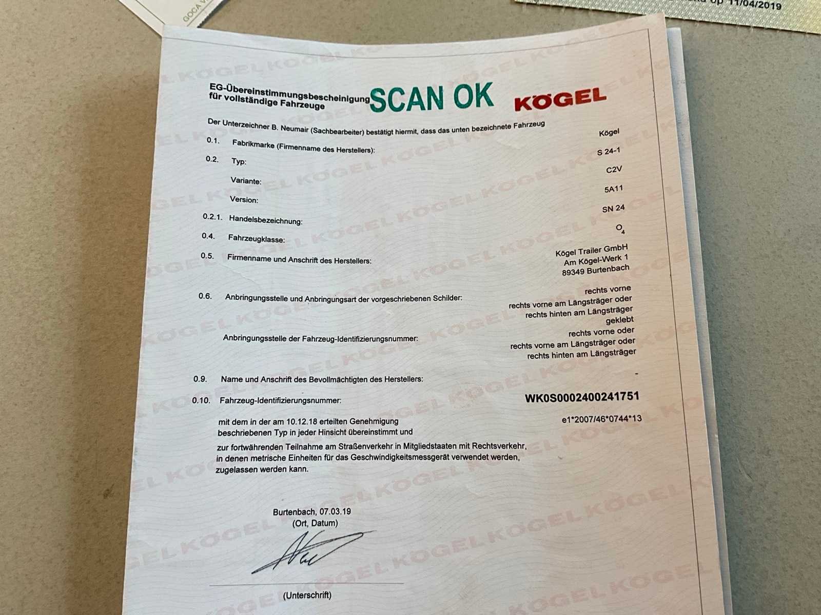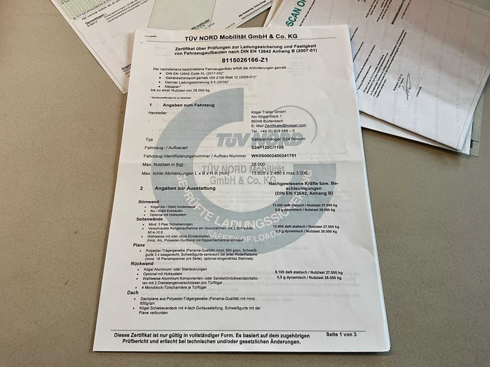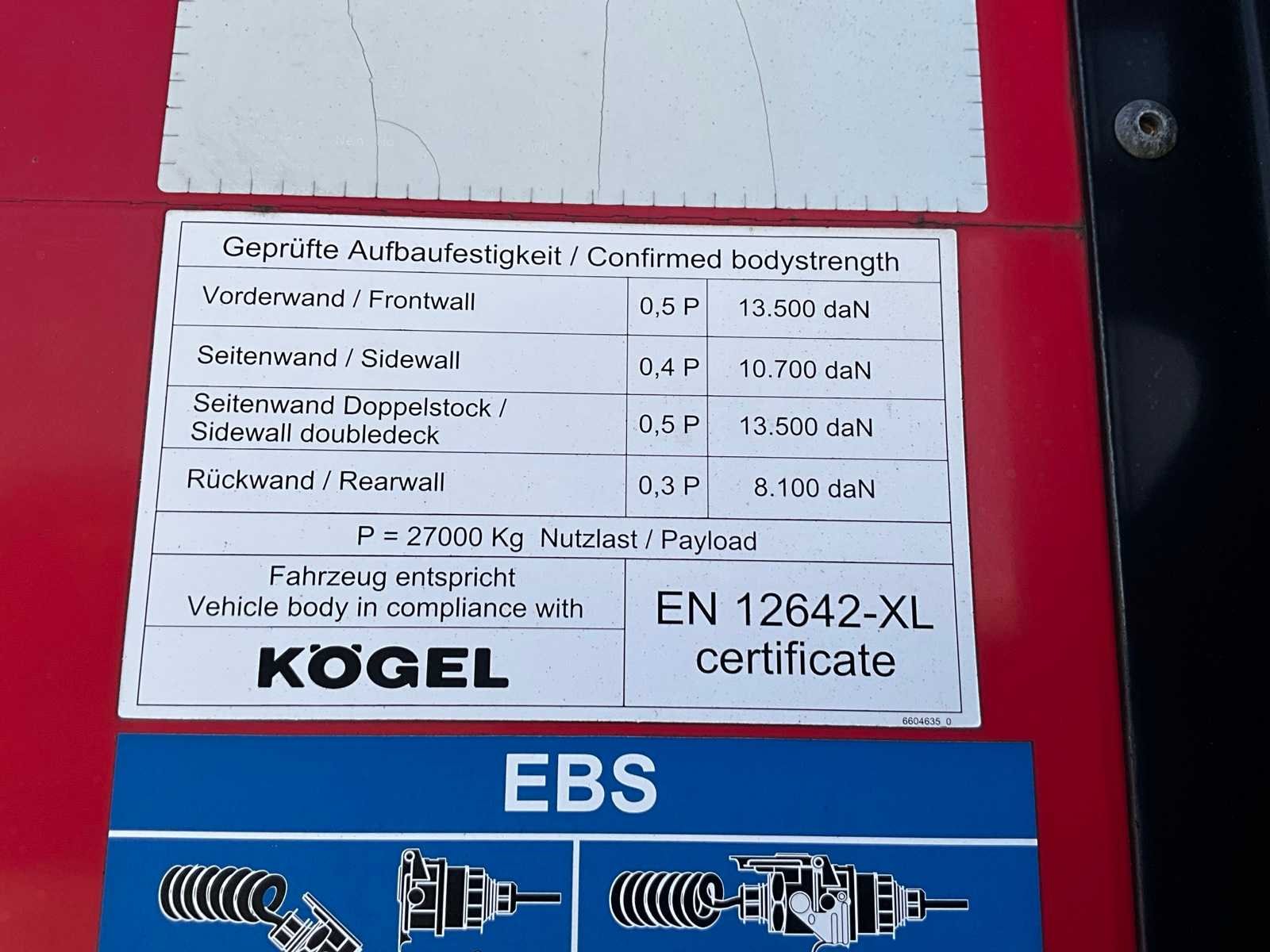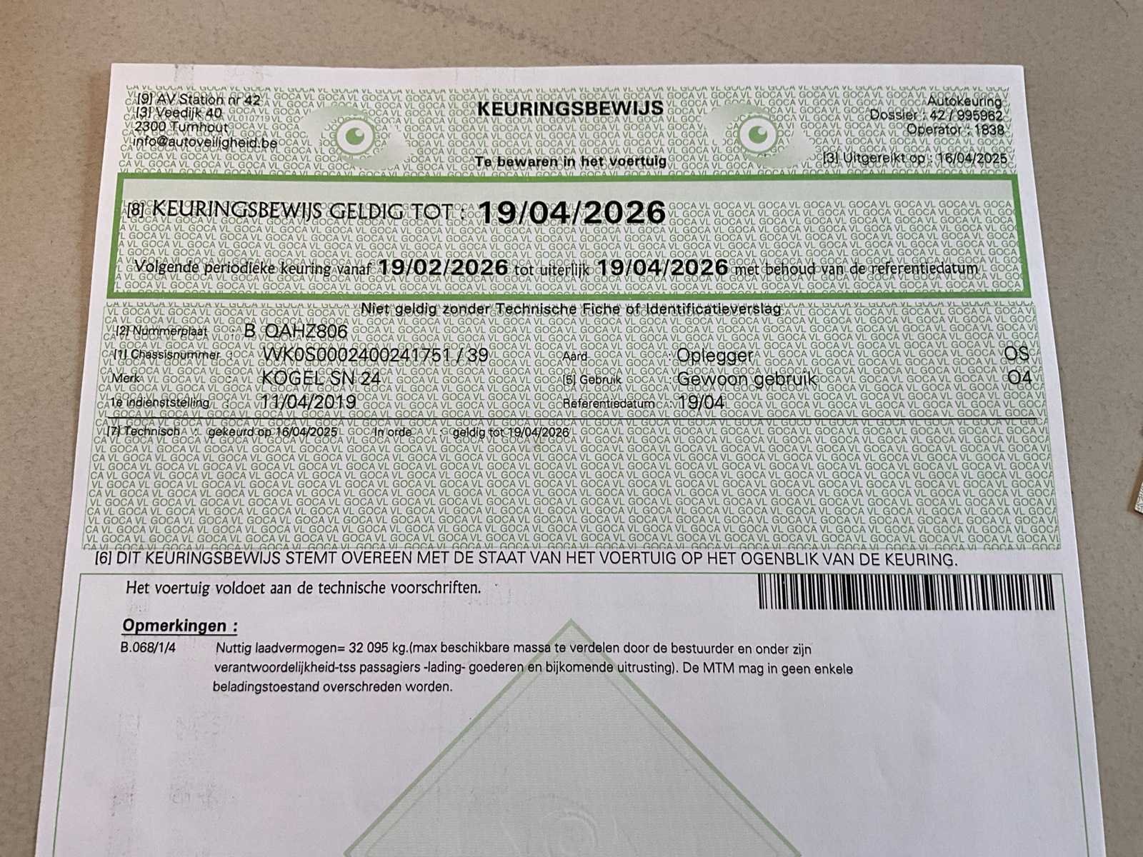 Voorzien van WABCO SmartBoard, liftas, pneumatische ophanging, steunpoten JOST Modul B0402, reserveband. Bandenmaat: 385/65 R22.5. Profieldiepte banden: 5,58mm, 7,65mm, 10,37mm, 9,59mm, 7,69mm, 5,91mm. Aanwezige documenten: Kentekenbewijs deel I, Kentekenbewijs deel II, Identificatieverslag, Gelijkvormigheidsattest, Keuringsbewijs, TÜV Nord certificaat. Aanwezige documenten: Kentekenbewijs deel I, Kentekenbewijs deel II, Identificatieverslag, Gelijkvormigheidsattest, Keuringsbewijs, TÜV Nord certificaat. Merk: KÖGEL Type: SN 24 Type aanhangwagencarrosserie: Schuifzeilaanhangwagen Bouwjaar: 2019 Chassisnummer VIN: WK0S0002400241751 Datum eerste toelating: 8/4/2019 APK vervaldatum: 19/4/2026 Aantal assen: 3 Laadvermogen: 34820kg Eigen gewicht: 7180kg Totale afmeting L: 13950mm Totale afmeting Breedte: 2550mm Totale afmeting Hoogte: 4000mm