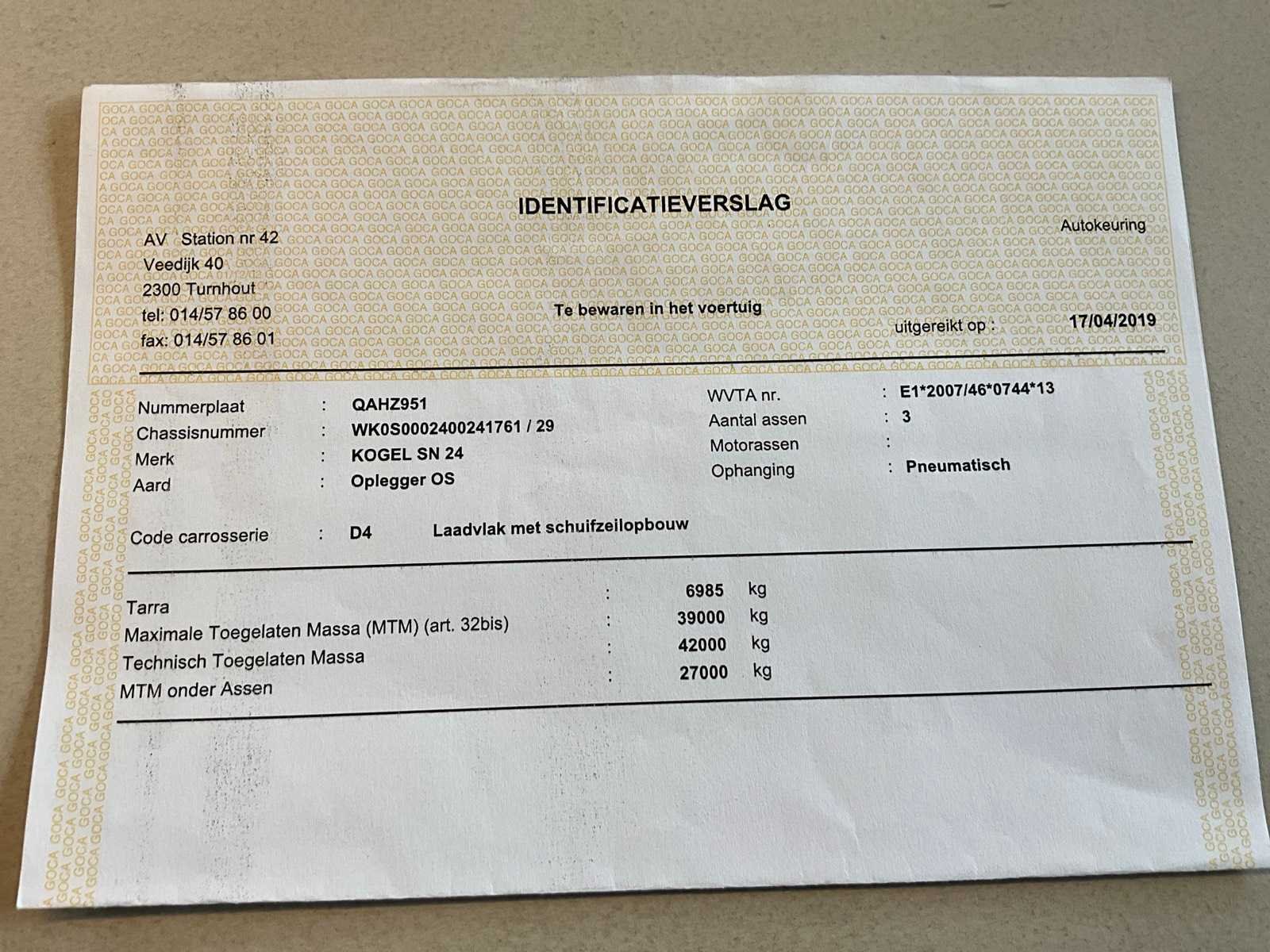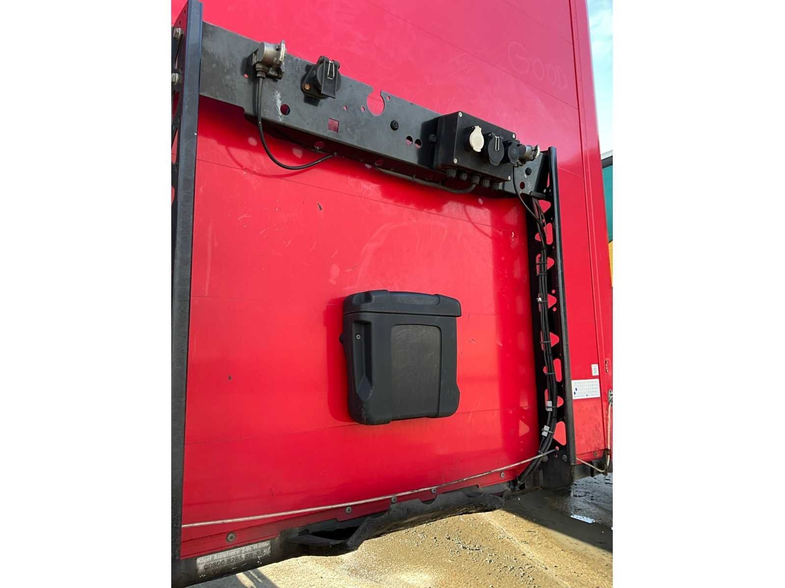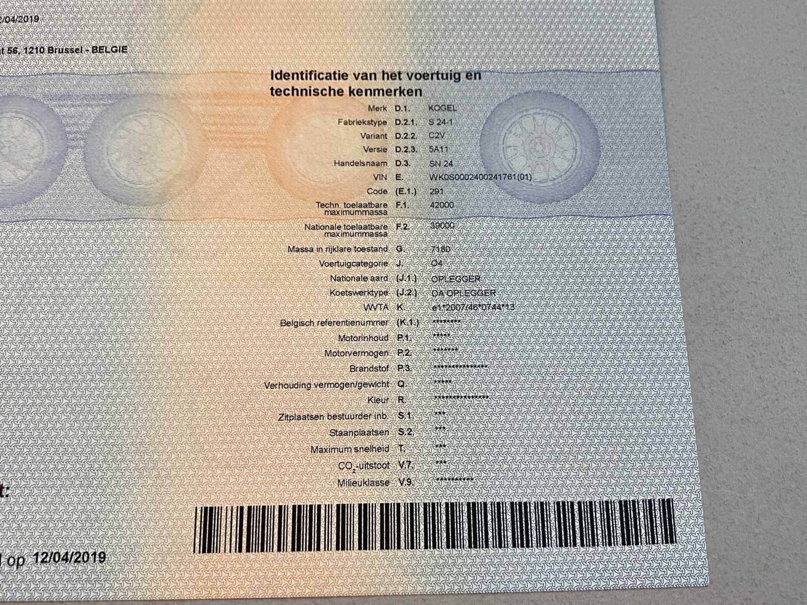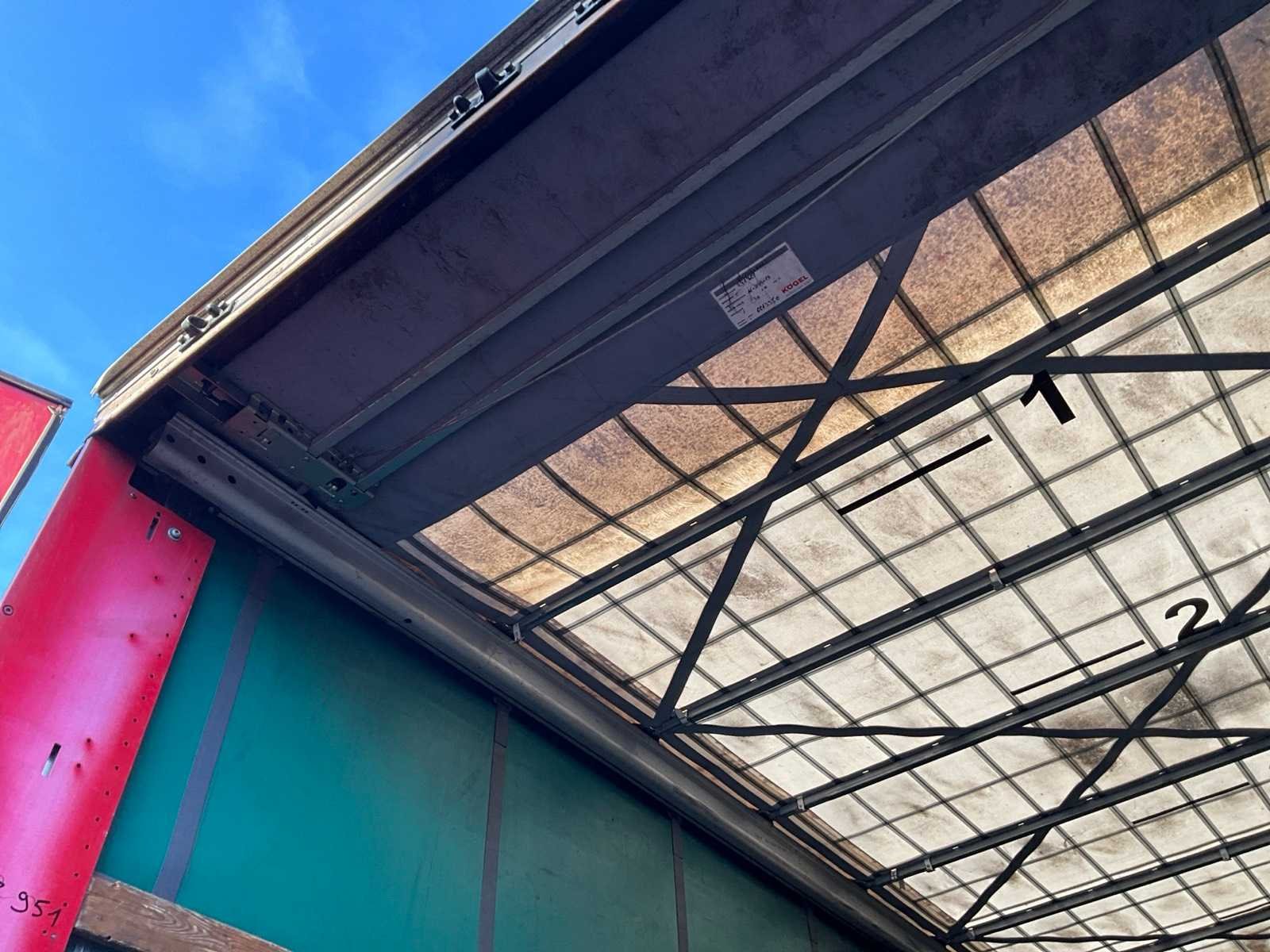 Voorzien van WABCO SmartBoard, liftas, pneumatische ophanging, steunpoten JOST Modul B0402, reserveband. Bandenmaat: 385/65 R22.5. Profieldiepte banden: 6,51mm, 9,15mm, 4,26mm, 4,99mm, 8,13mm, 4,61mm. Aanwezige documenten: Kentekenbewijs deel I, Kentekenbewijs deel II, Identificatieverslag, Gelijkvormigheidsattest, Keuringsbewijs, TÜV Nord certificaat. Merk: KÖGEL Type: SN 24 Type aanhangwagencarrosserie: Schuifzeilaanhangwagen Bouwjaar: 2019 Chassisnummer VIN: WK0S0002400241761 Datum eerste toelating: 8/4/2019 APK vervaldatum: 17/4/2026 Aantal assen: 3 Laadvermogen: 34820kg Eigen gewicht: 7180kg Totale afmeting L: 13950mm Totale afmeting Breedte: 2550mm Totale afmeting Hoogte: 4000mm