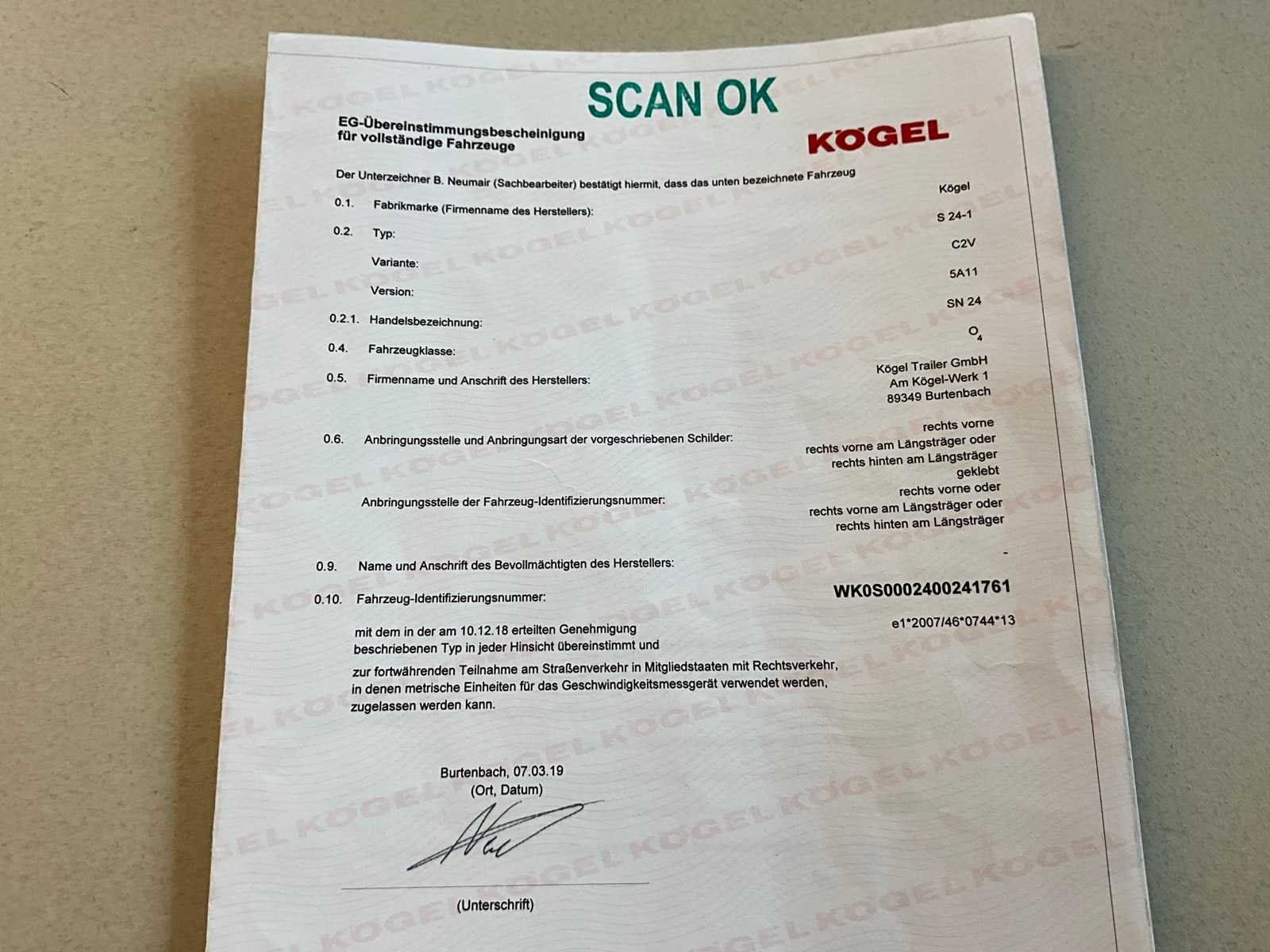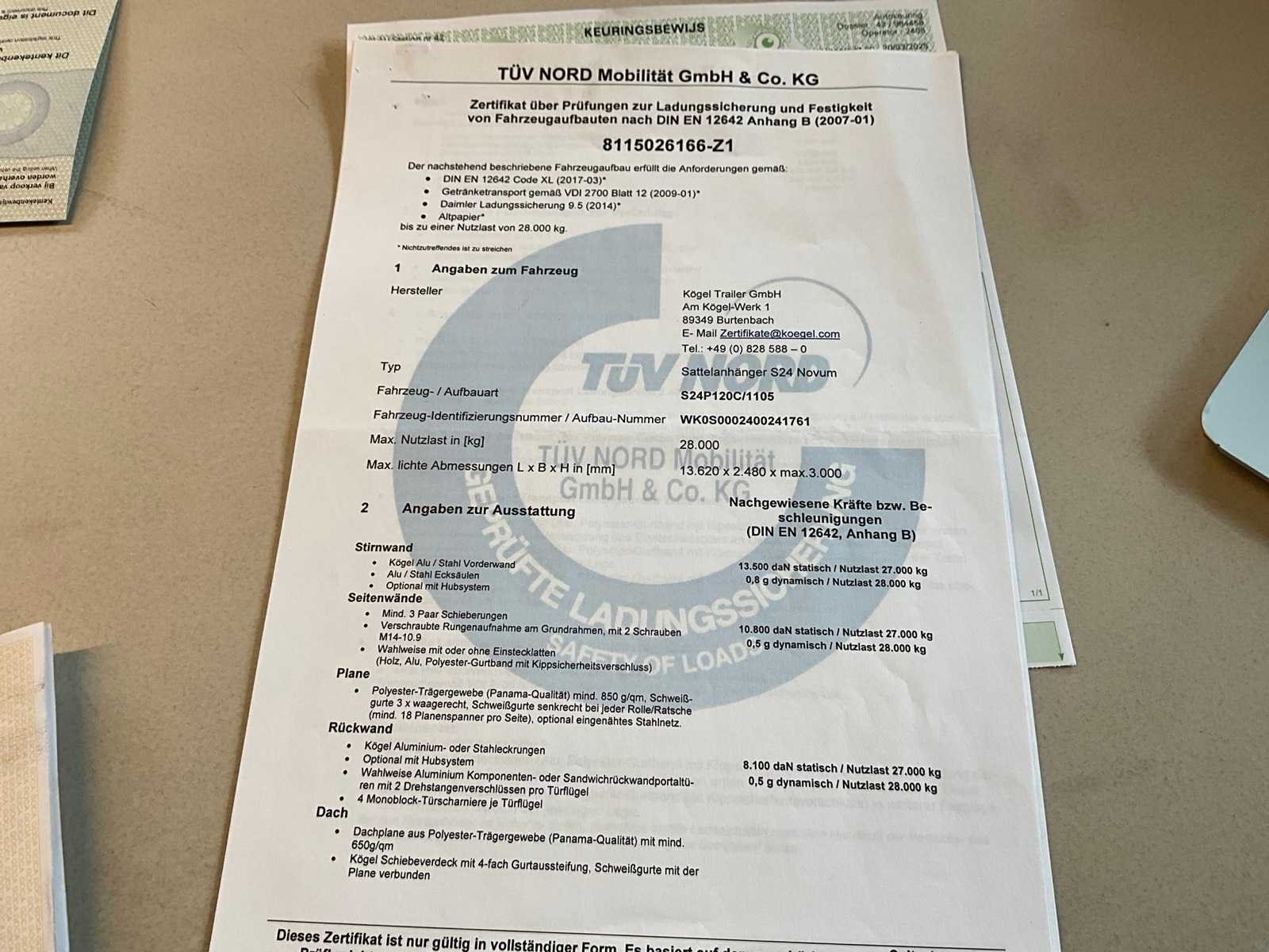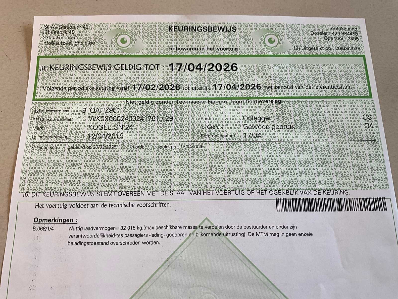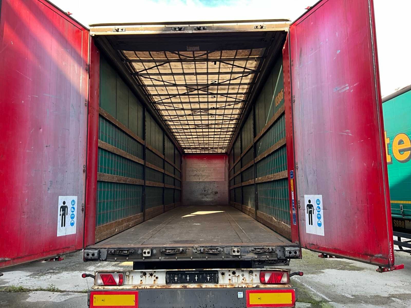 Voorzien van WABCO SmartBoard, liftas, pneumatische ophanging, steunpoten JOST Modul B0402, reserveband. Bandenmaat: 385/65 R22.5. Profieldiepte banden: 6,51mm, 9,15mm, 4,26mm, 4,99mm, 8,13mm, 4,61mm. Aanwezige documenten: Kentekenbewijs deel I, Kentekenbewijs deel II, Identificatieverslag, Gelijkvormigheidsattest, Keuringsbewijs, TÜV Nord certificaat. Merk: KÖGEL Type: SN 24 Type aanhangwagencarrosserie: Schuifzeilaanhangwagen Bouwjaar: 2019 Chassisnummer VIN: WK0S0002400241761 Datum eerste toelating: 8/4/2019 APK vervaldatum: 17/4/2026 Aantal assen: 3 Laadvermogen: 34820kg Eigen gewicht: 7180kg Totale afmeting L: 13950mm Totale afmeting Breedte: 2550mm Totale afmeting Hoogte: 4000mm