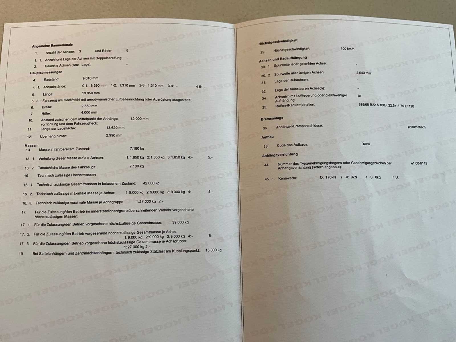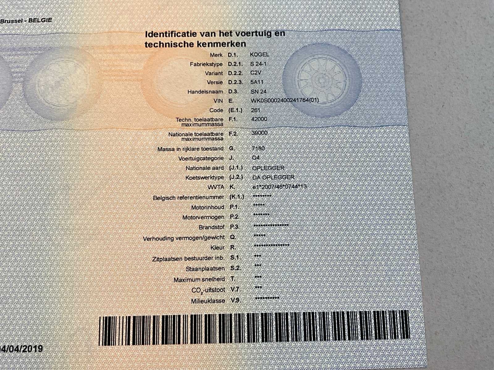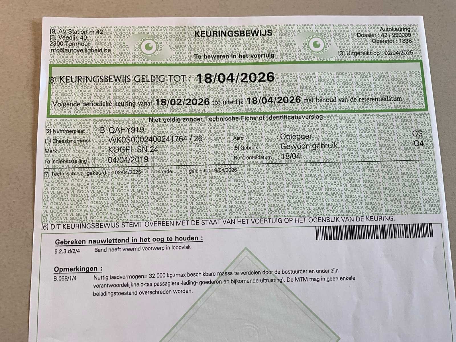 Voorzien van WABCO SmartBoard, liftas, pneumatische ophanging, steunpoten JOST Modul B0402, reserveband. Bandenmaat: 385/65 R22.5. Profieldiepte banden: 13,69mm, 6,15mm, 6,22mm, 8,97mm, 6,21mm, 7,55mm. Aanwezige documenten: Kentekenbewijs deel I, Kentekenbewijs deel II, Identificatieverslag, Gelijkvormigheidsattest, Keuringsbewijs, TÜV Nord certificaat. Merk: KÖGEL Type: SN 24 Type aanhangwagencarrosserie: Schuifzeilaanhangwagen Bouwjaar: 2019 Chassisnummer VIN: WK0S0002400241764 Datum eerste toelating: 8/4/2019 APK vervaldatum: 18/4/2026 Aantal assen: 3 Laadvermogen: 34820kg Eigen gewicht: 7180kg Totale afmeting L: 13950mm Totale afmeting Breedte: 2550mm Totale afmeting Hoogte: 4000mm