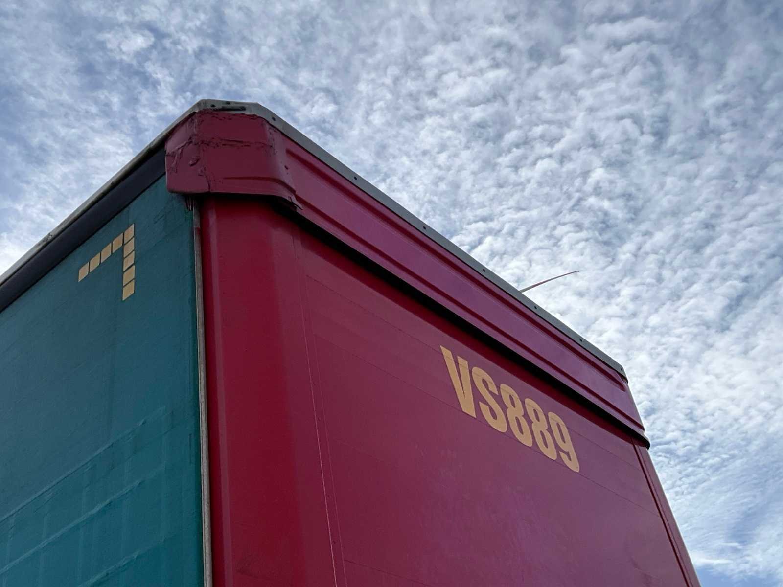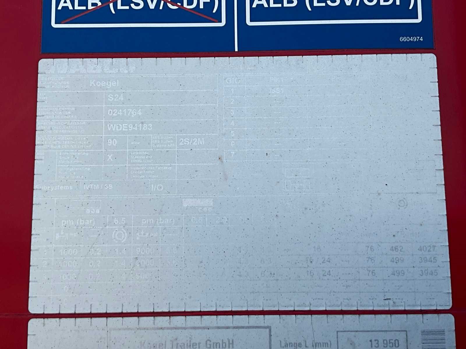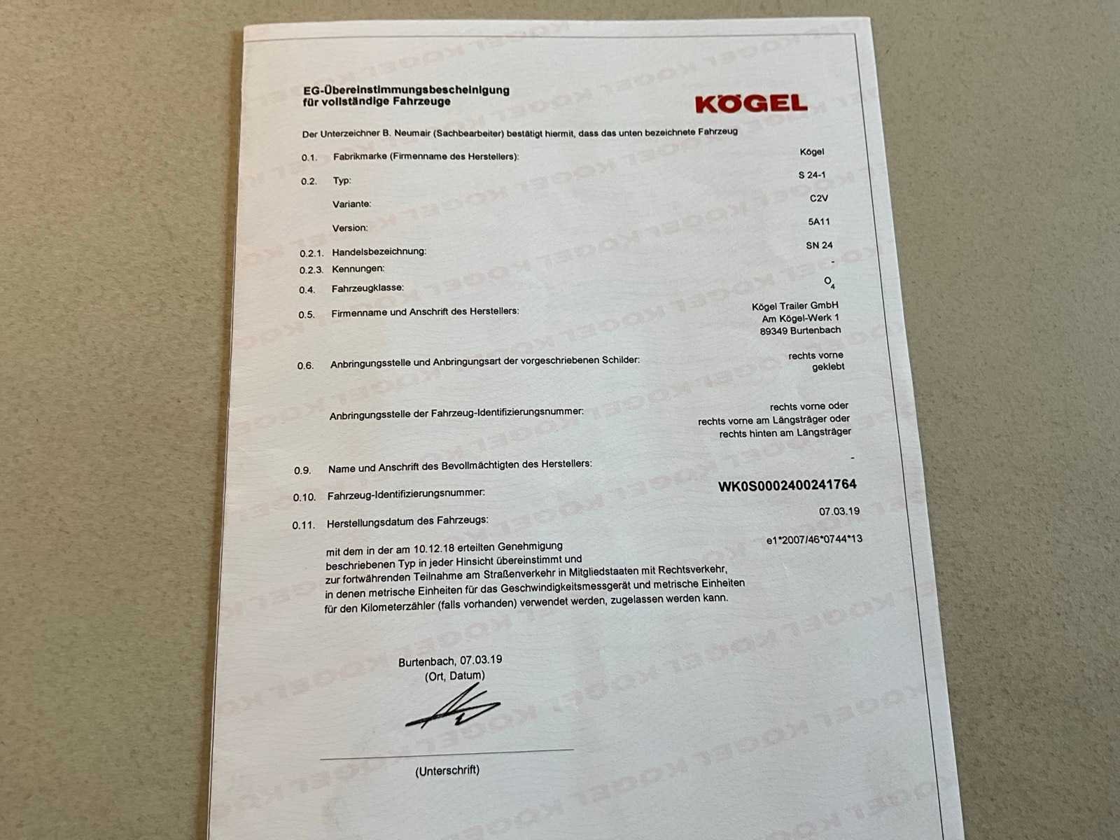 Voorzien van WABCO SmartBoard, liftas, pneumatische ophanging, steunpoten JOST Modul B0402, reserveband. Bandenmaat: 385/65 R22.5. Profieldiepte banden: 13,69mm, 6,15mm, 6,22mm, 8,97mm, 6,21mm, 7,55mm. Aanwezige documenten: Kentekenbewijs deel I, Kentekenbewijs deel II, Identificatieverslag, Gelijkvormigheidsattest, Keuringsbewijs, TÜV Nord certificaat. Merk: KÖGEL Type: SN 24 Type aanhangwagencarrosserie: Schuifzeilaanhangwagen Bouwjaar: 2019 Chassisnummer VIN: WK0S0002400241764 Datum eerste toelating: 8/4/2019 APK vervaldatum: 18/4/2026 Aantal assen: 3 Laadvermogen: 34820kg Eigen gewicht: 7180kg Totale afmeting L: 13950mm Totale afmeting Breedte: 2550mm Totale afmeting Hoogte: 4000mm