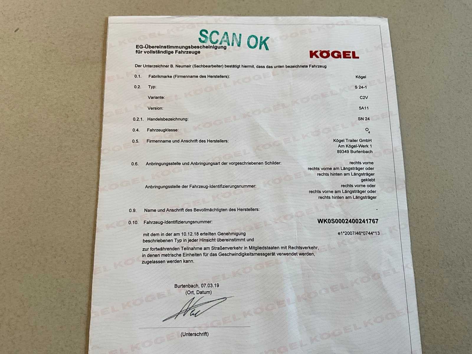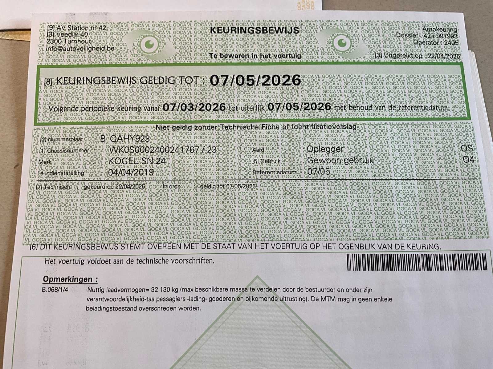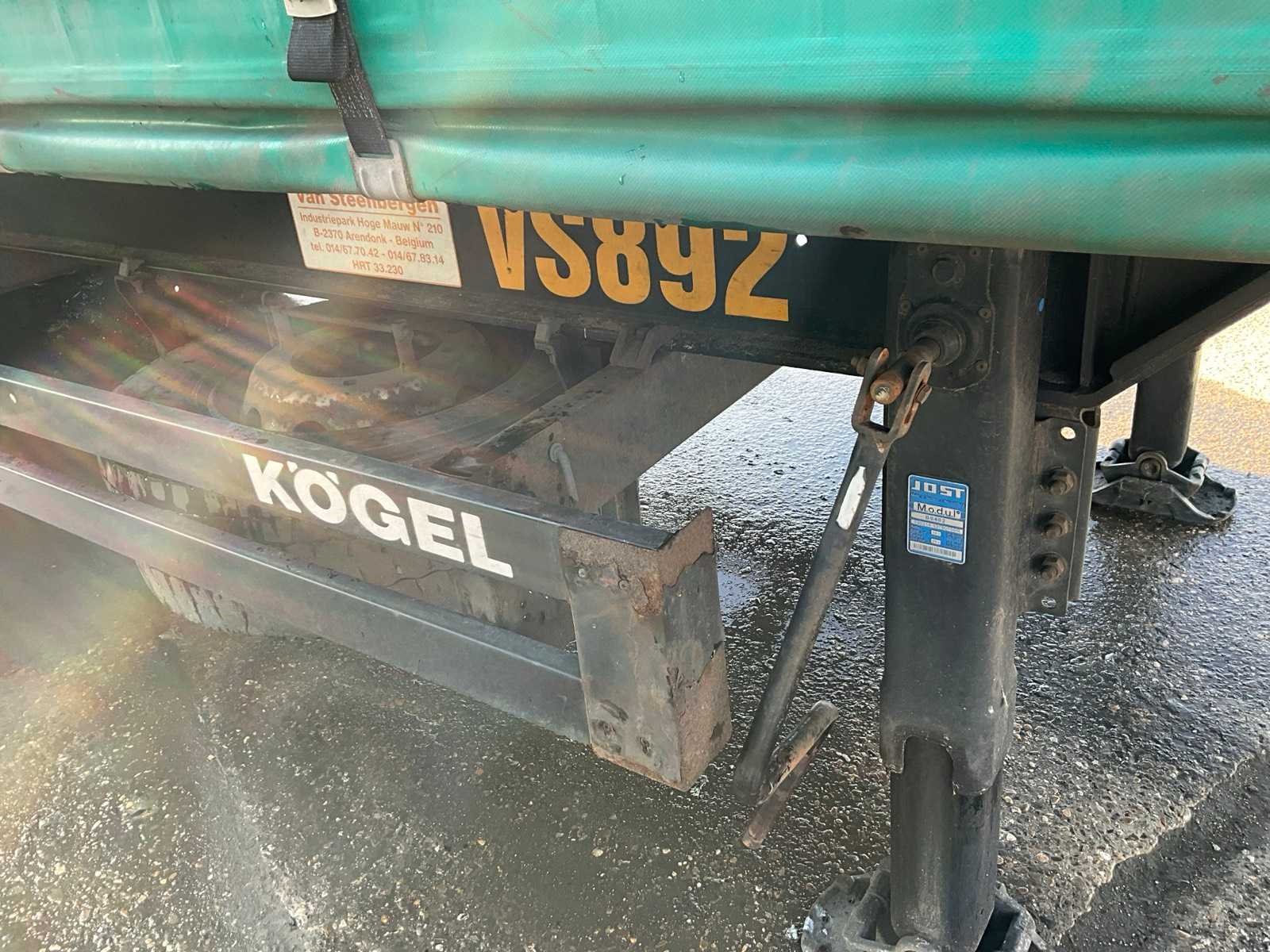 Voorzien van WABCO SmartBoard, liftas, pneumatische ophanging, steunpoten JOST Modul B0402, reserveband. Bandenmaat: 385/65 R22.5. Profieldiepte banden: 13,32mm, 6,84mm, 13,27mm, 13,05mm, 7,84mm, 13,27mm. Aanwezige documenten: Kentekenbewijs deel I, Kentekenbewijs deel II, Identificatieverslag, Gelijkvormigheidsattest, Keuringsbewijs, TÜV Nord certificaat. Merk: KÖGEL Type: SN 24 Type aanhangwagencarrosserie: Schuifzeilaanhangwagen Bouwjaar: 2019 Chassisnummer VIN: WK0S0002400241767 Datum eerste toelating: 8/4/2019 APK vervaldatum: 7/5/2026 Aantal assen: 3 Laadvermogen: 34820kg Eigen gewicht: 7180kg Totale afmeting L: 13950mm Totale afmeting Breedte: 2550mm Totale afmeting Hoogte: 4000mm