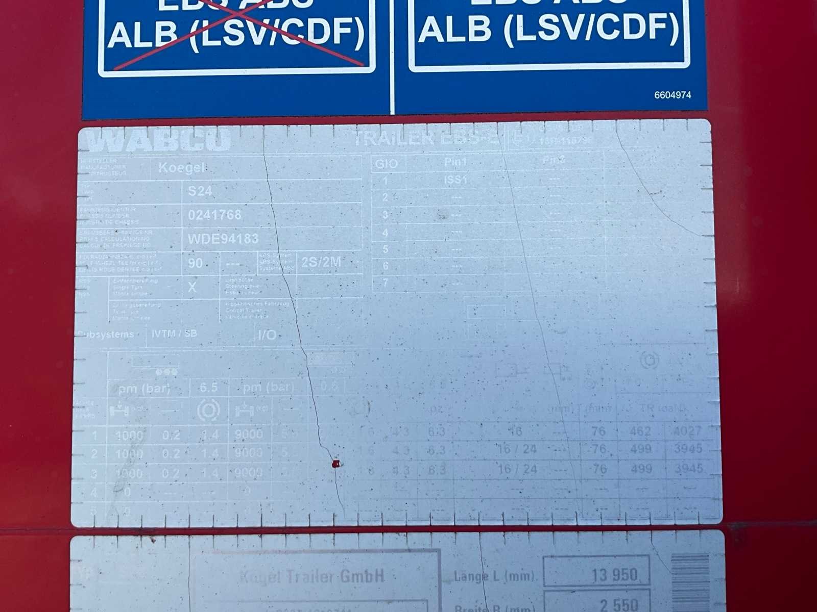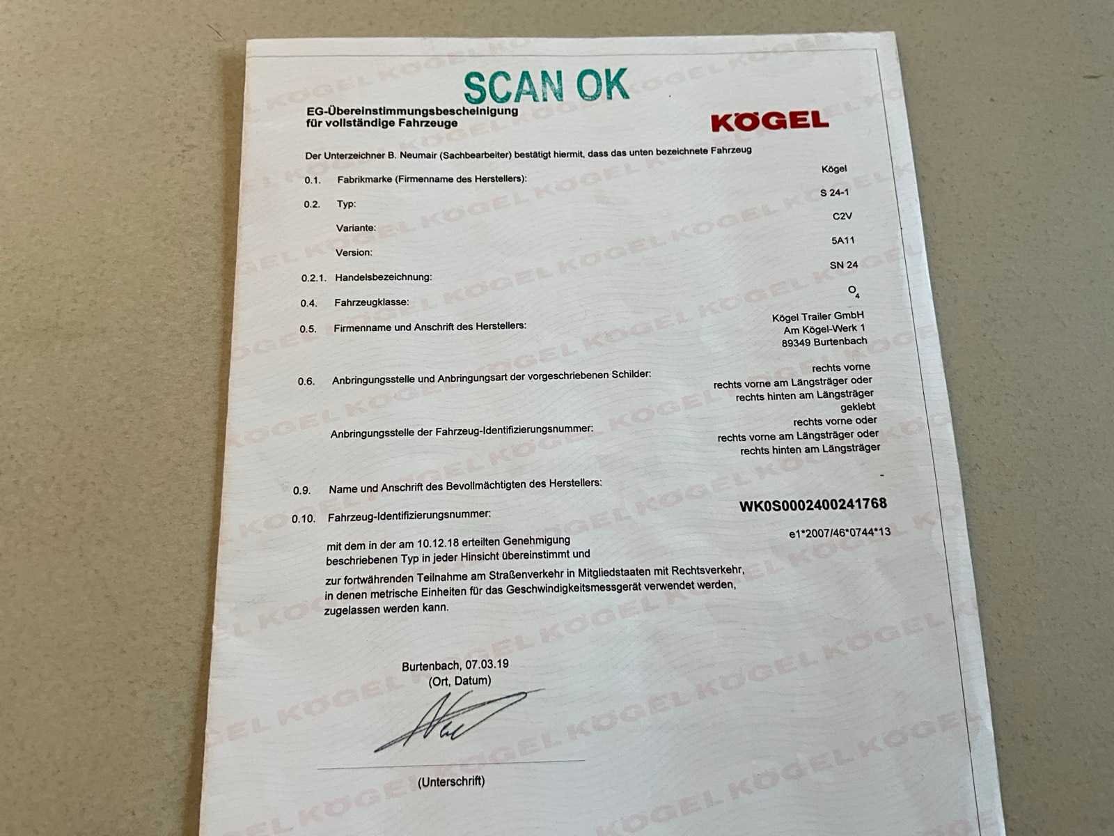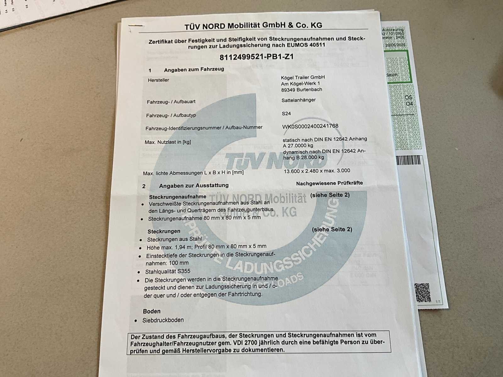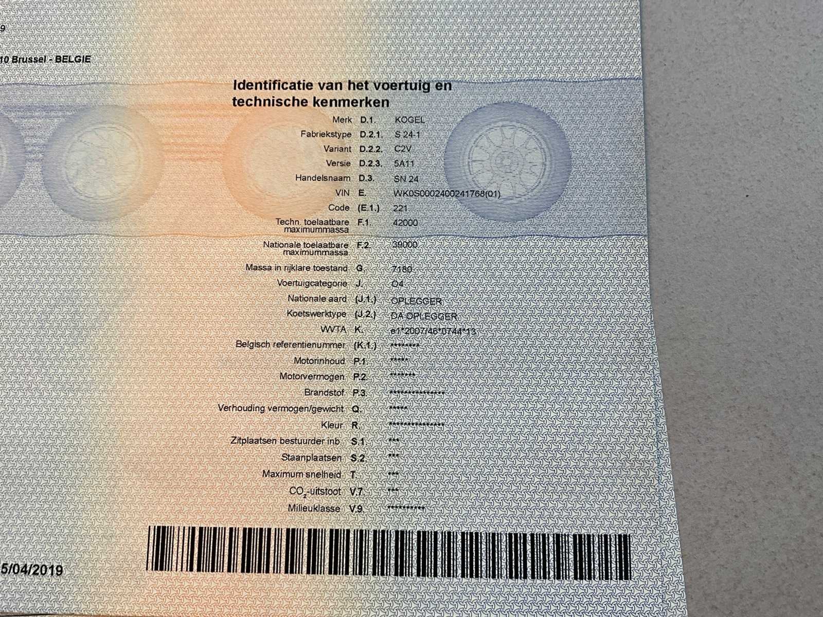 Voorzien van WABCO SmartBoard, liftas, pneumatische ophanging, steunpoten JOST Modul B0402, reserveband. Bandenmaat: 385/65 R22.5. Profieldiepte banden: 13,38mm, 6,35mm, 10,52mm, 10,8mm, 6,83mm, 13,06mm. Aanwezige documenten: Kentekenbewijs deel I, Kentekenbewijs deel II, Identificatieverslag, Gelijkvormigheidsattest, Keuringsbewijs, TÜV Nord certificaat. Merk: KÖGEL Type: SN 24 Type aanhangwagencarrosserie: Schuifzeilaanhangwagen Bouwjaar: 2019 Chassisnummer VIN: WK0S0002400241768 Datum eerste toelating: 8/4/2019 APK vervaldatum: 7/5/2026 Aantal assen: 3 Laadvermogen: 34820kg Eigen gewicht: 7180kg Totale afmeting L: 13950mm Totale afmeting Breedte: 2550mm Totale afmeting Hoogte: 4000mm