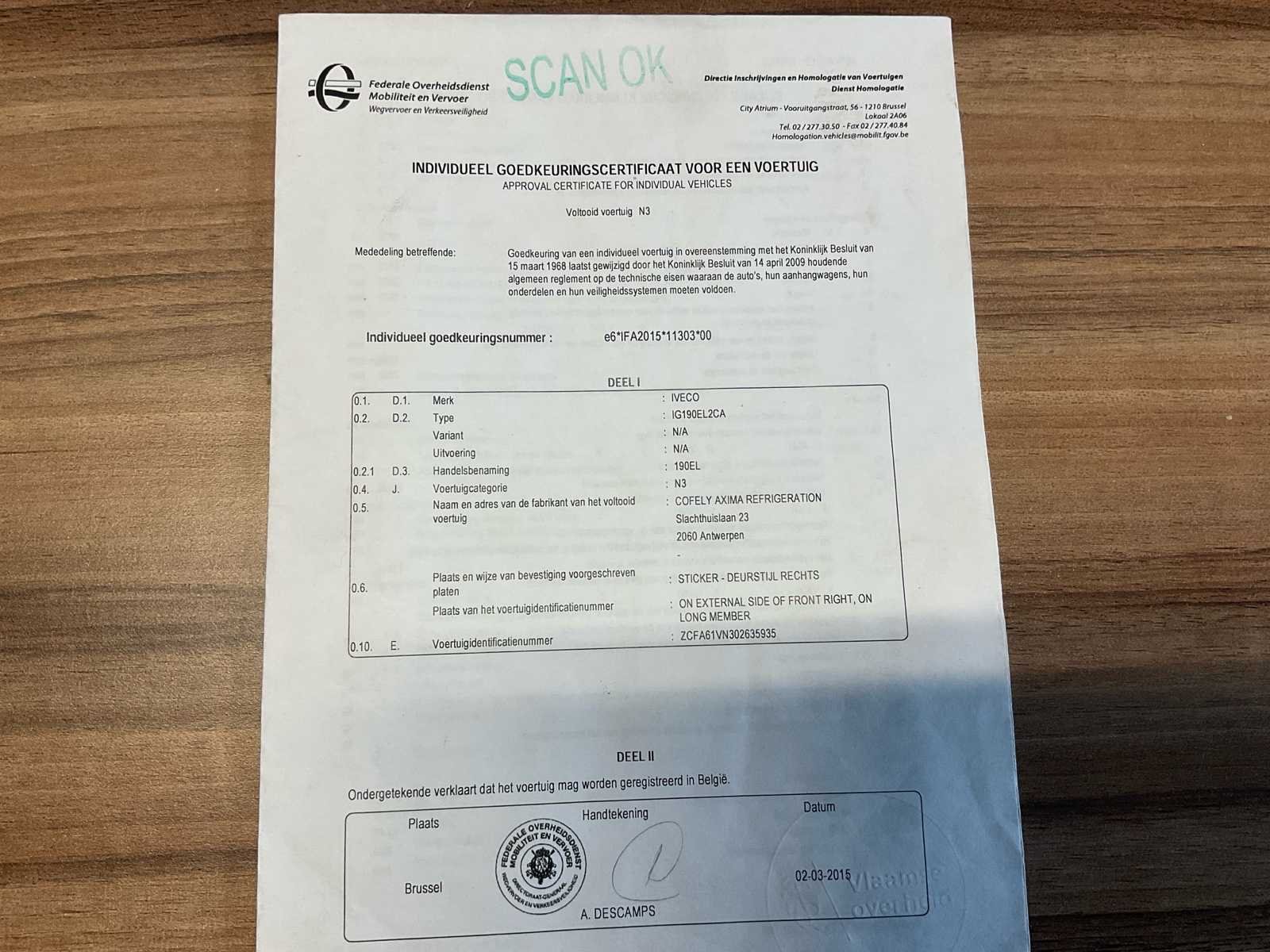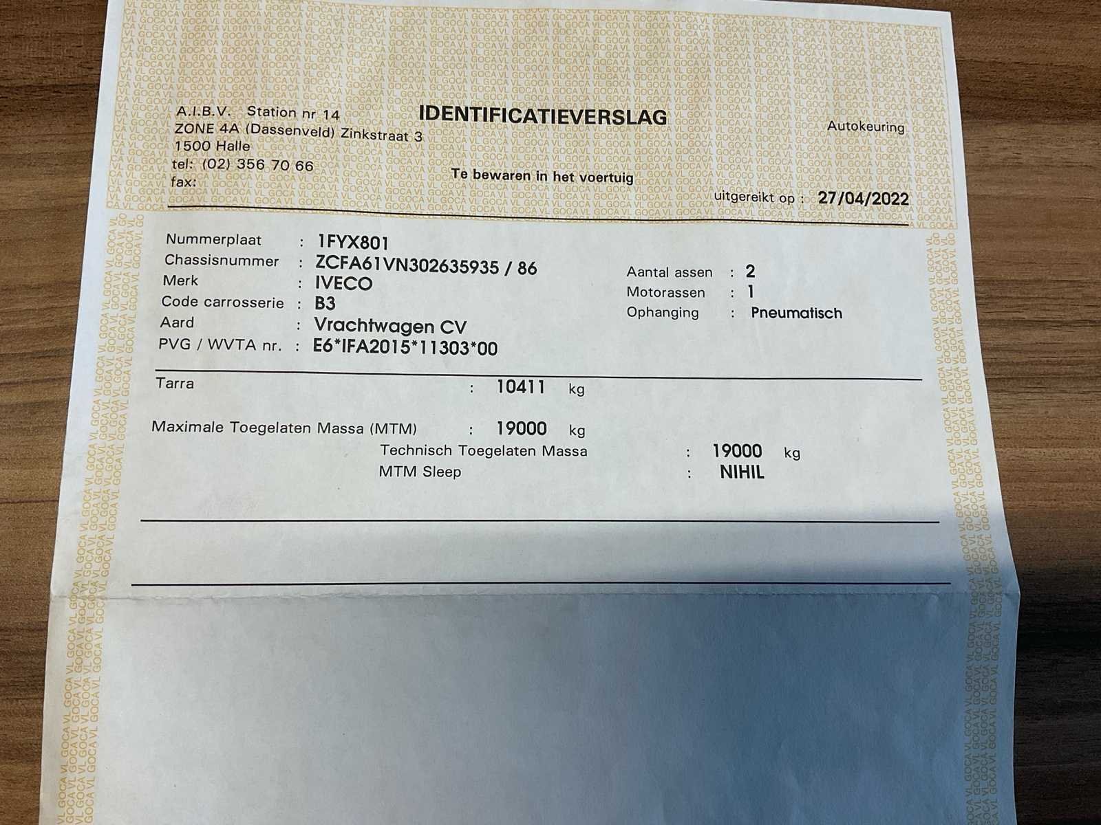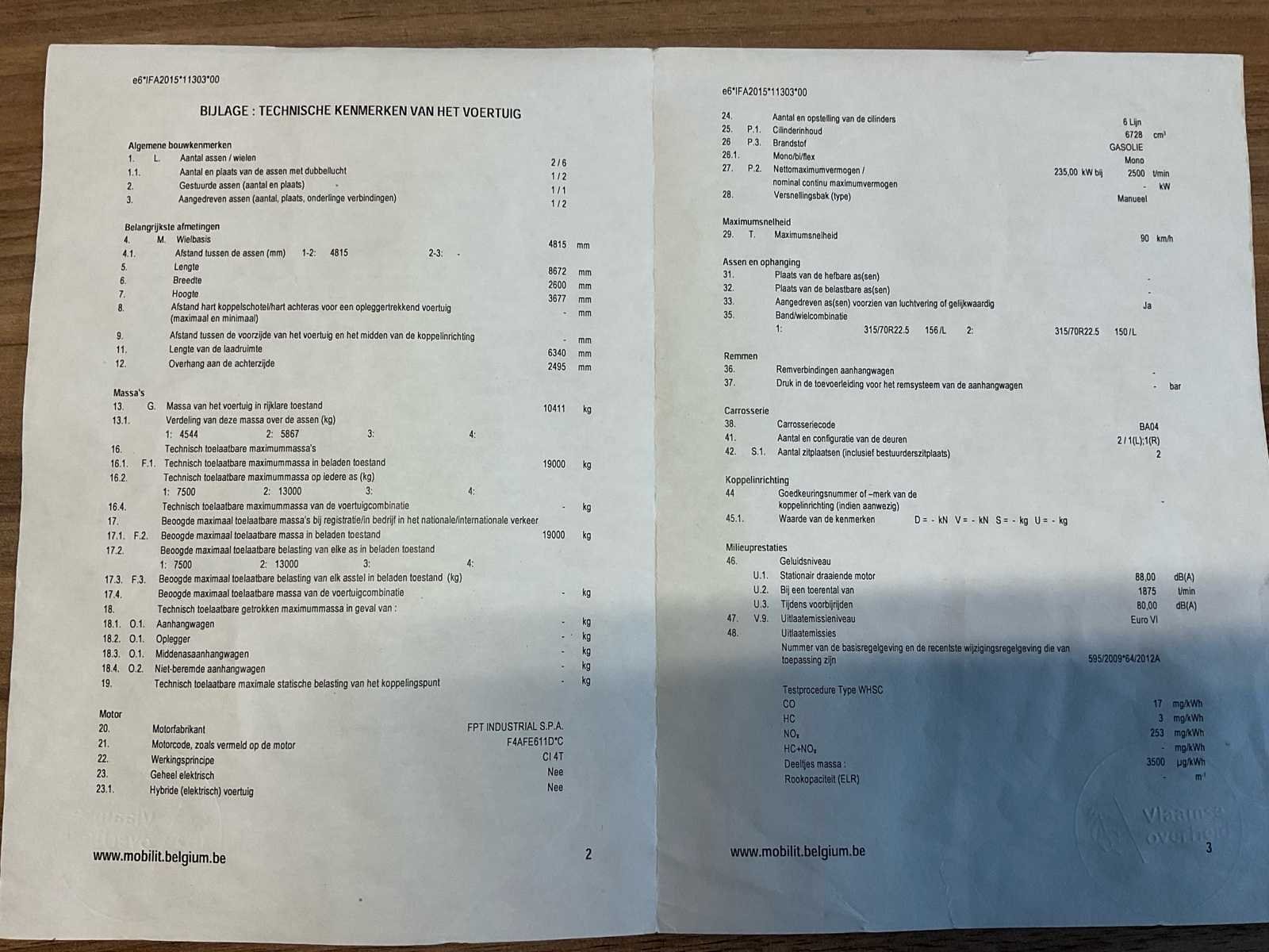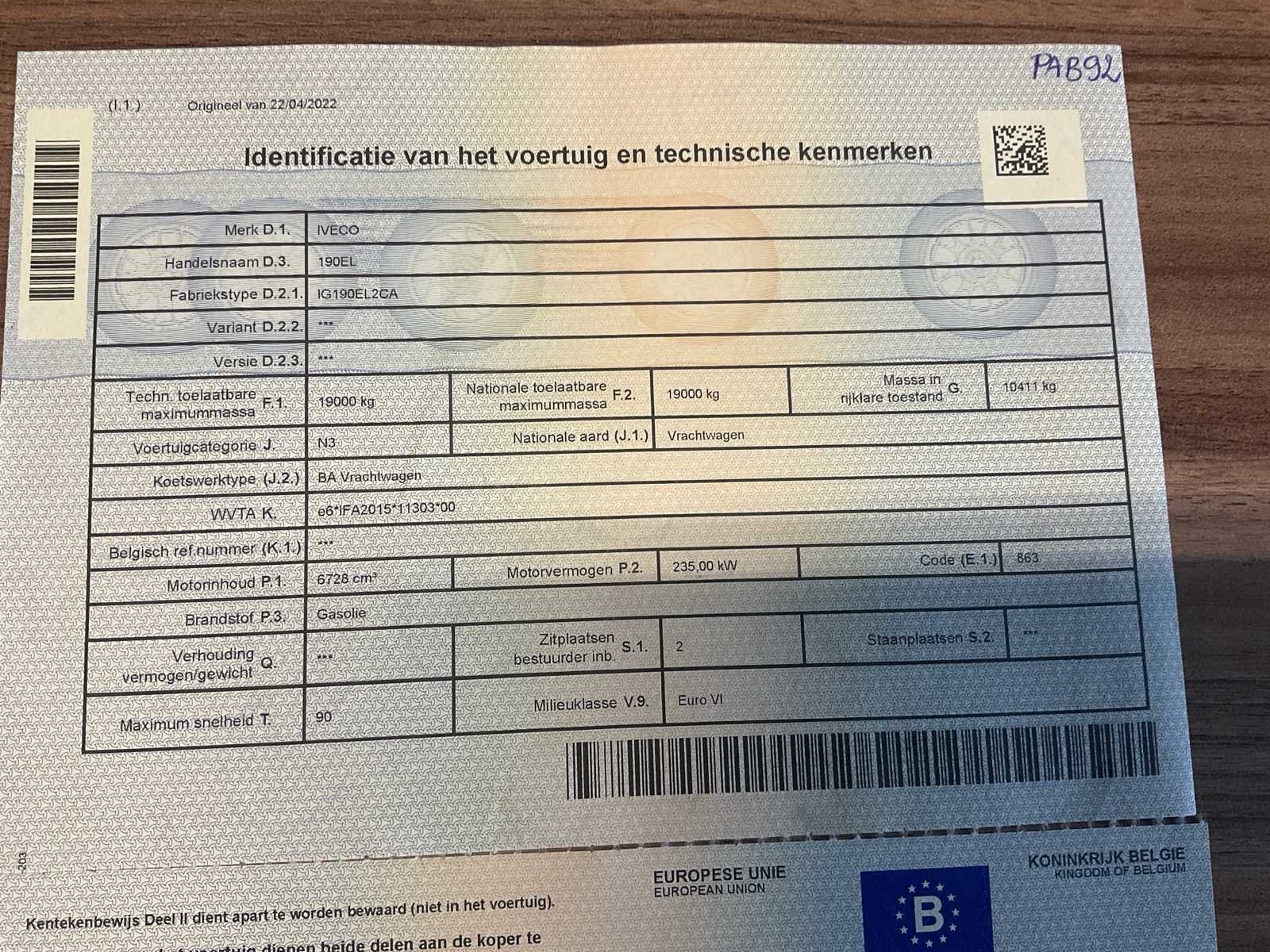 Vrachtwagen start en rijdt Frigo in werkende staat Hydraulisch laadplatform in werkende staat Lengte laadruimte 6340mm Merk: IVECO Type: IG190EL2CA Bouwjaar: 2015 Chassisnummer VIN: ZCFA61VN302635935 Cilinderinhoud: 6728cc Kilometerstand bij opname: 394979km Datum eerste toelating: 18/03/2015 Type transmissie: Automatisch Aantal assen: 2 Fuel Type: Diesel Laadvermogen: 19000kg Aantal sleutels: 1 Emissieklasse: EURO VI Hydraulische laadklep: true Gesloten opbouw: true Eigen gewicht: 10411kg Totale afmeting L: 8672mm Totale afmeting Breedte: 2600mm Totale afmeting Hoogte: 3677mm Startinformatie: Start en rijdt Nationaliteit documenten: Belgi¨ë Kentekenpapieren compleet?: true Aantal zitplaatsen: 2 Automaat: true Diesel: true