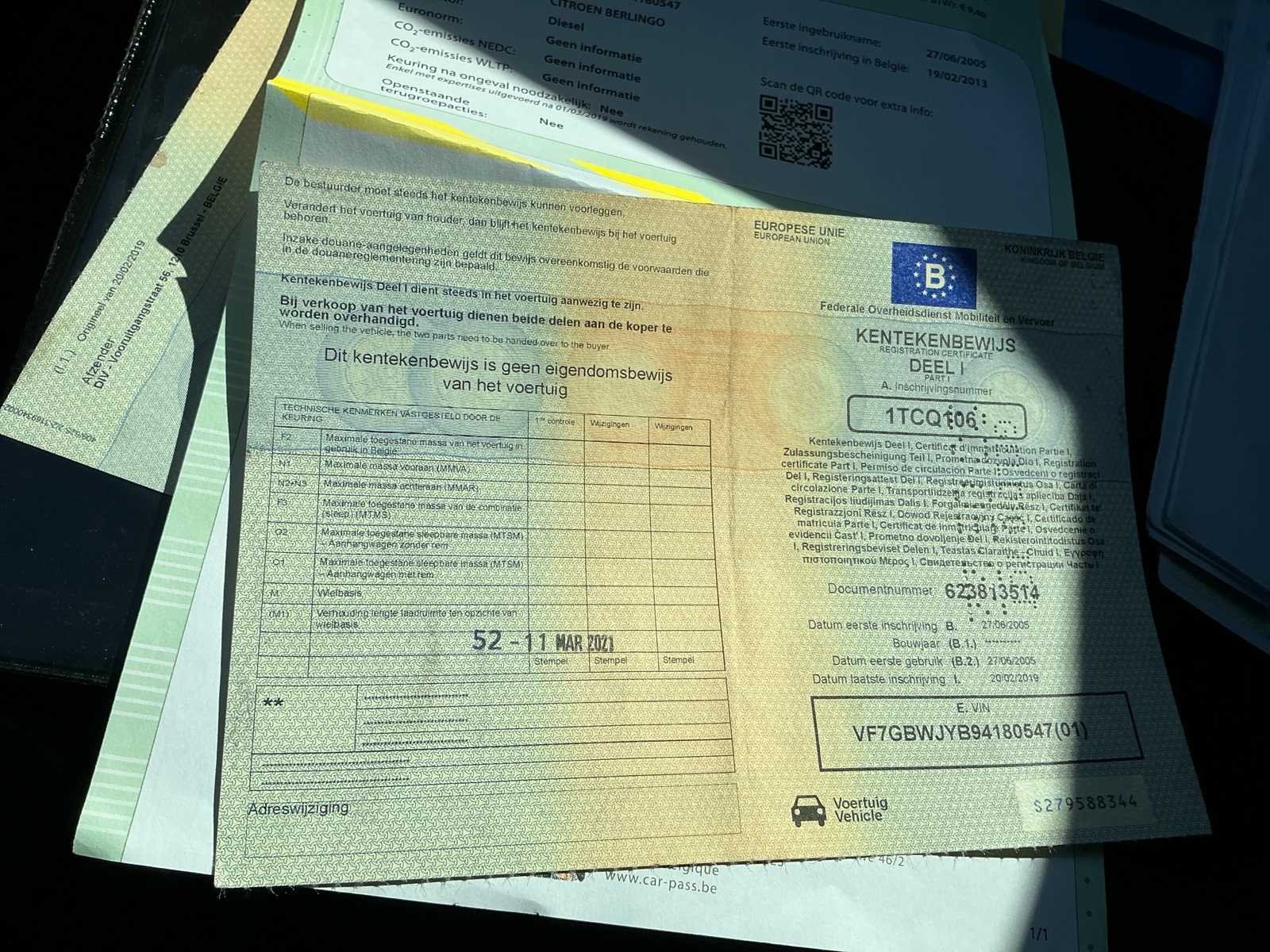 Merk: Citroen Type: Berlingo Bouwjaar: 2005 Chassisnummer: VF7GBWJYB94180547 Afgelezen kilometerstand: 347000km Cilinderinhoud: 1868cc Vermogen (kW): 51kW Brandstof: Diesel Transmissie: Handgeschakeld Nationaliteit documenten: België Kentekenpapieren compleet?: true Boorddocumenten aanwezig?: true Startinformatie: Start&rijdt