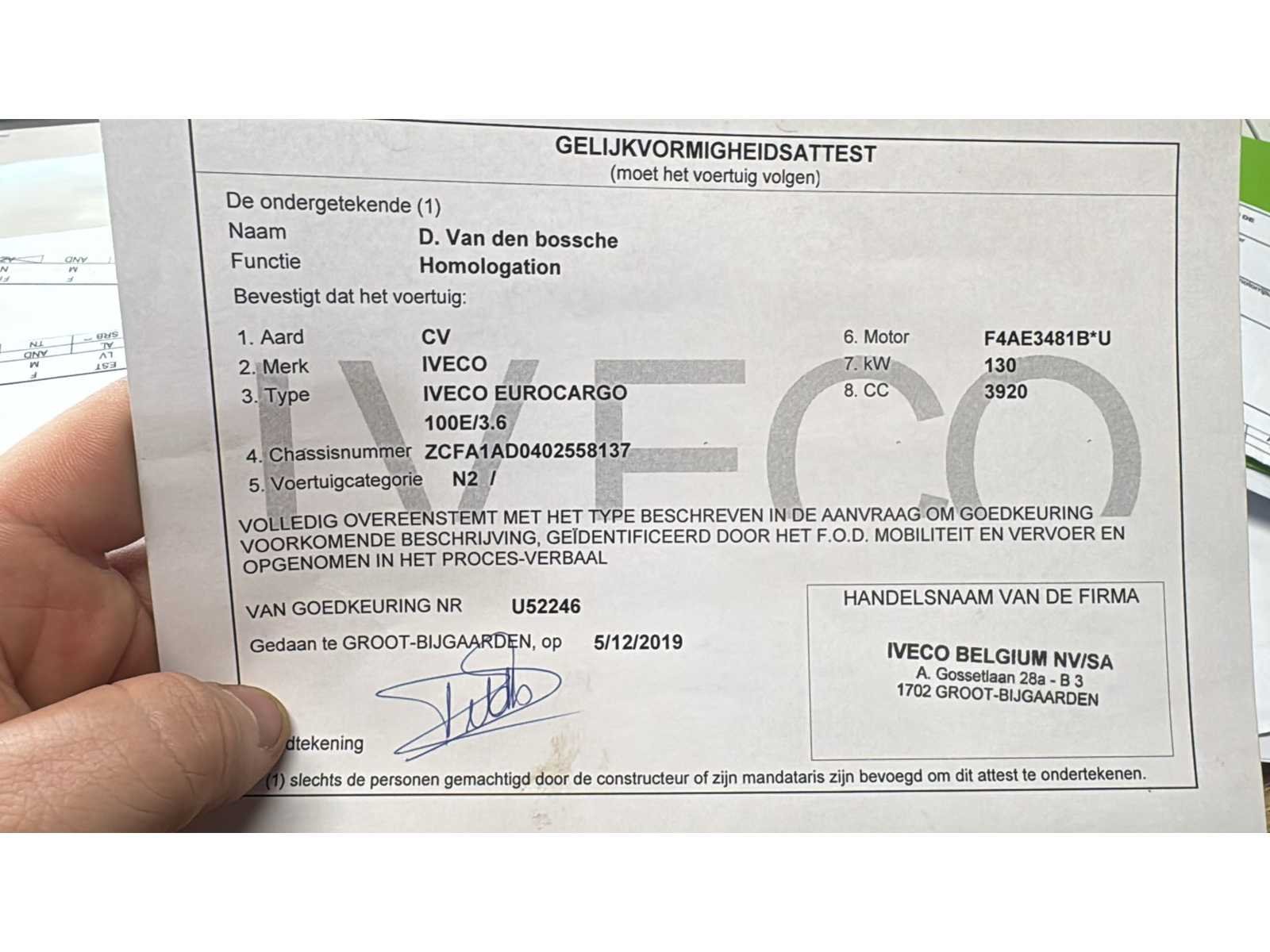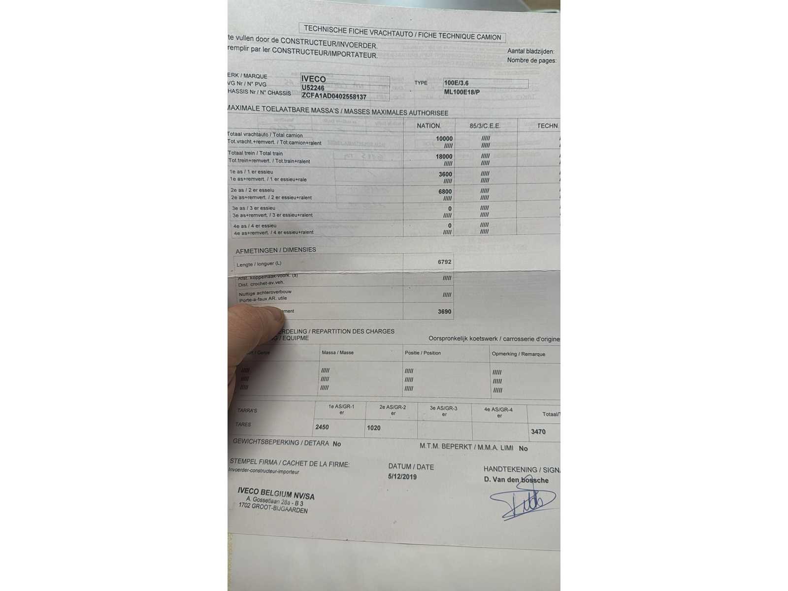 Alles in werkende staat. Merk: Iveco Type: Eurocargo Bouwjaar: 2009 Chassisnummer VIN: ZCFA1AD0402558137 Cilinderinhoud: 3920cc Kilometerstand bij opname: 300155km Datum eerste toelating: 12/11/2009 Fuel Type: Diesel Aantal sleutels: 2 Emissieklasse: Euro 5 Startinformatie: Start en rijdt Nationaliteit documenten: Belgisch