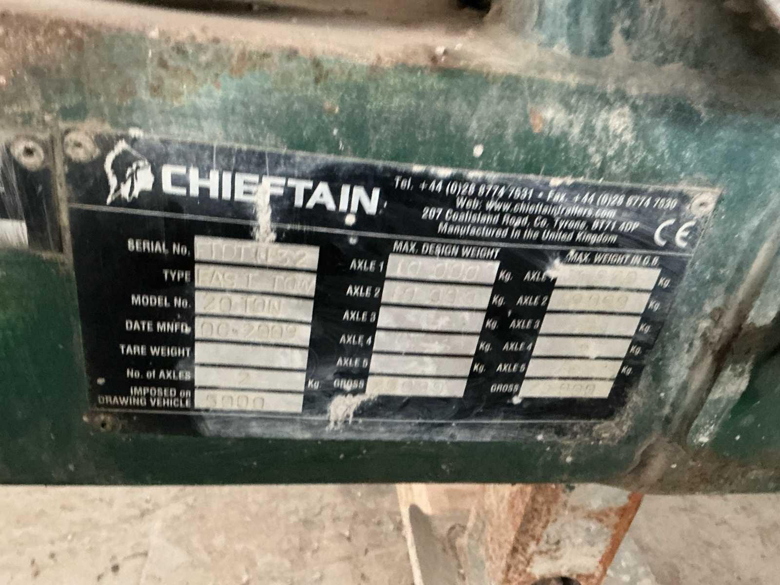Perfect werkende 2 assige Chieftain. Vervoer van zware machines of materiaal achter tractors • Industrie‑ of bouwtransport • Intern gebruik bij logistiek of op sites Merk: Chieftain Type: FAST TO LOW Bouwjaar: 2009 Serienummer: FTDT U32 Opslagcapaciteit: 8m³ Laadvermogen: 15800kg Eigen gewicht: 3200kg Totaal max. gewicht: 19t Laadhoogte: 1m Max. snelheid: 50km/h Luchtdrukremmen: true Hydraulische remmen: true Totale afmeting L: 640mm Totale afmeting Breedte: 250mm Totale afmeting Hoogte: 230mm