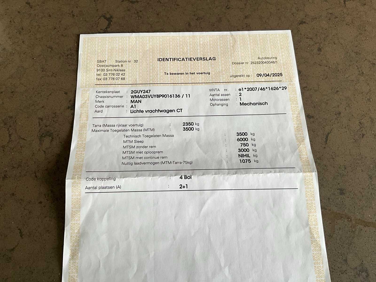 3,5 Ton. Is net gekeurd. Merk: MAN Model: TGE Bouwjaar: 2023 Afgelezen kilometerstand: 40256km Cilinderinhoud: 1968cc Vermogen (kW): 130kW Brandstof: diesel Chassisnummer: WMA03VUY8P9016136 Datum eerste toelating: 23/02/2023 Aantal zitplaatsen: 3 Transmissie: Automaat Emissieklasse: Euro 6d Aantal sleutels: 2 Nationaliteit documenten: Belgisch Carpass: true Start en rijdt: Ja Keuringsrapport geldig tot: 28/02/2027 Andere boorddocumenten: Aanwezig startinformatie : Start & rijdt Vavato voert geen technische keuring uit.: true Airconditioning: true Navigatie: true Xenon verlichting: true LED-koplampen: true Inschrijvingsbewijs - deel 1 : Aanwezig Inschrijvingsbewijs - deel 2: Aanwezig