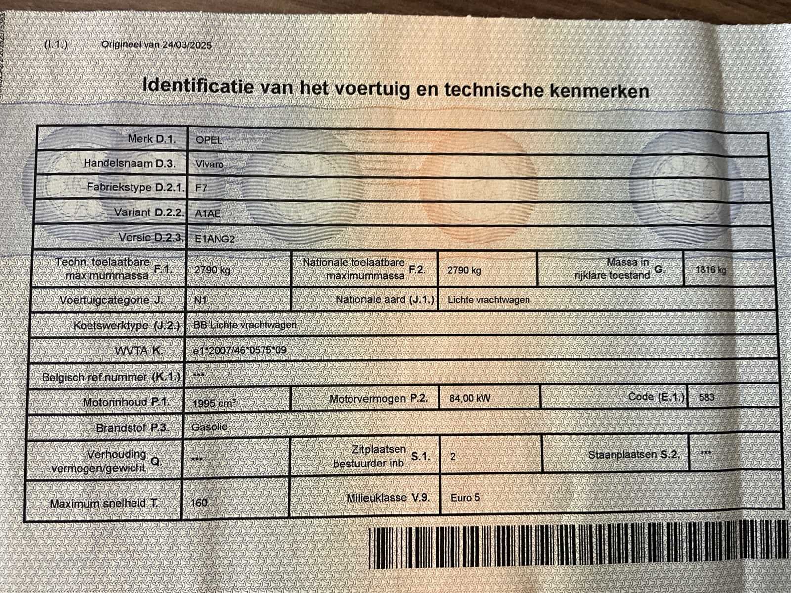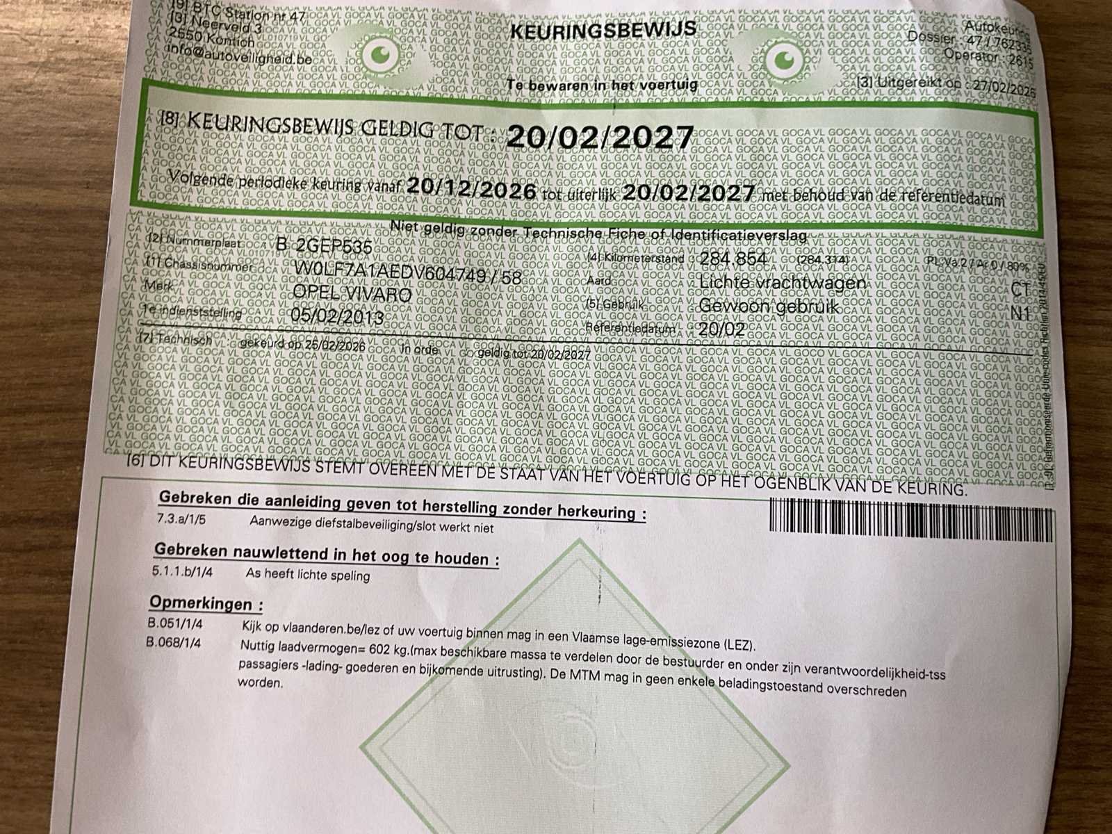 Geldige technische keuring - start, rijdt remt maar 3de versnelling kraakt - inclusief inrichting in laadruimte, exclusief inhoud & tom-tom Merk: Opel Model: Vivaro Type: lichte vracht - ingericht Bouwjaar: 2013 Afgelezen kilometerstand: 287094km Cilinderinhoud: 1995cc Vermogen (kW): 84kW Brandstof: diesel Chassisnummer: W0LF7A1AEDV604749 Laadvermogen: 602kg Datum eerste toelating: 5/2/2013 Aantal zitplaatsen: 2 Transmissie: manueel Emissieklasse: Euro 5 Ledig gewicht: 2113kg Nationaliteit documenten: B Gelijkvormigheidsattest aanwezig: true Start en rijdt: ja Keuringsrapport geldig tot: 20/2/2027 Vavato voert geen technische keuring uit.: true Inschrijvingsbewijs - deel 1 : aanwezig Inschrijvingsbewijs - deel 2: aanwezig