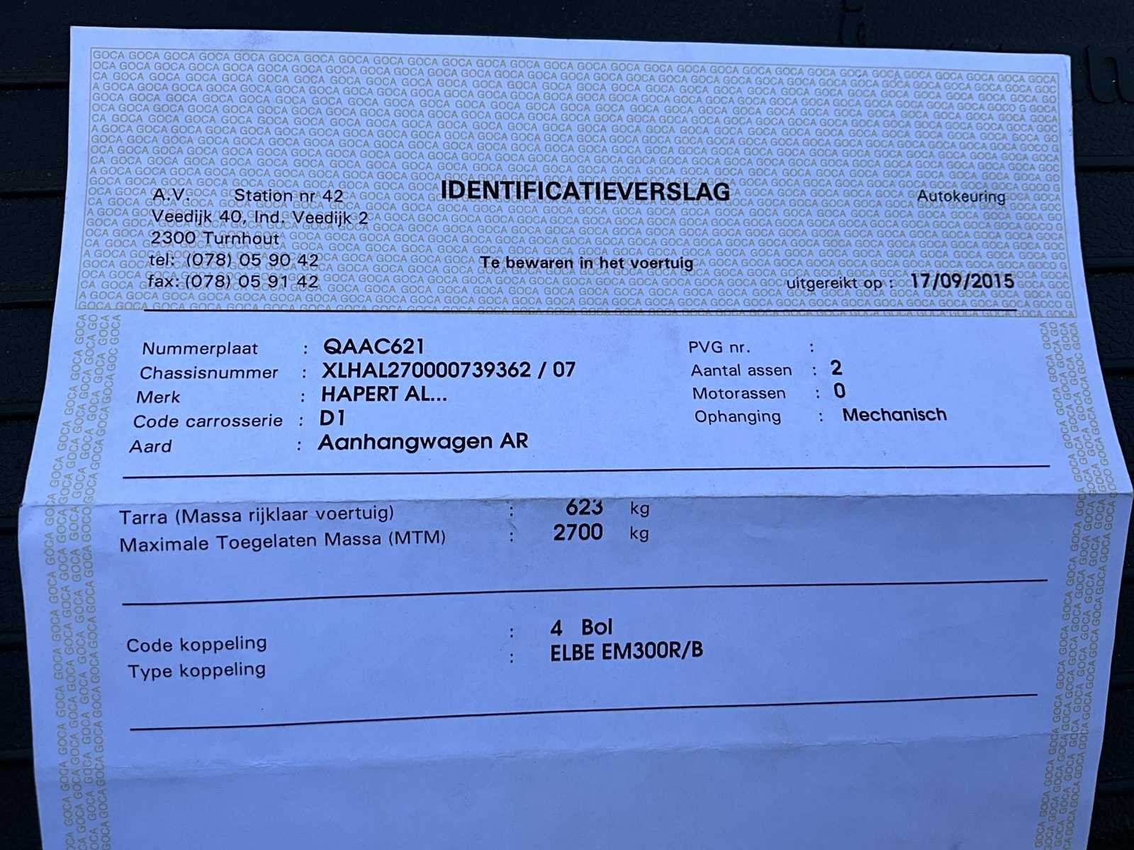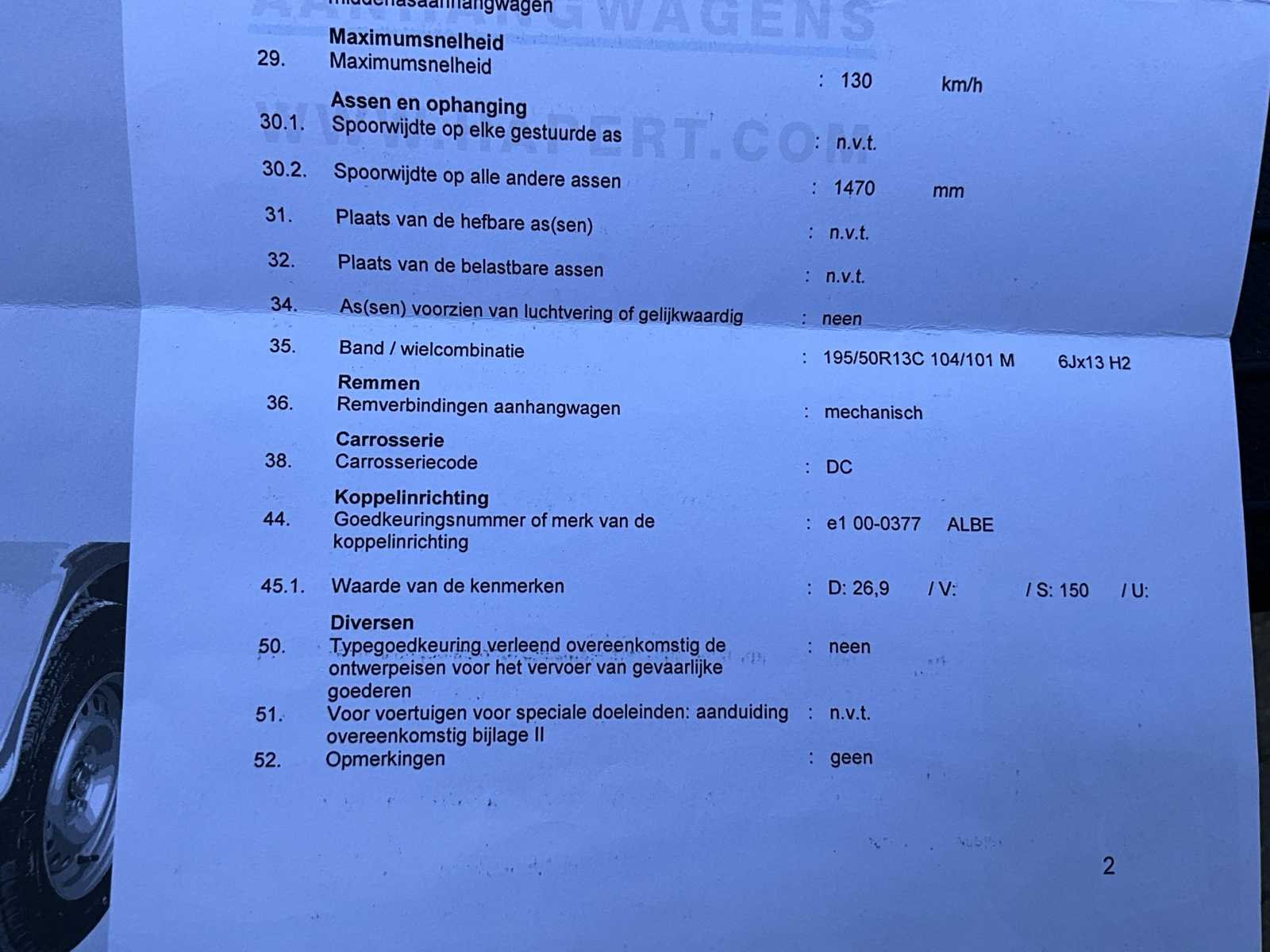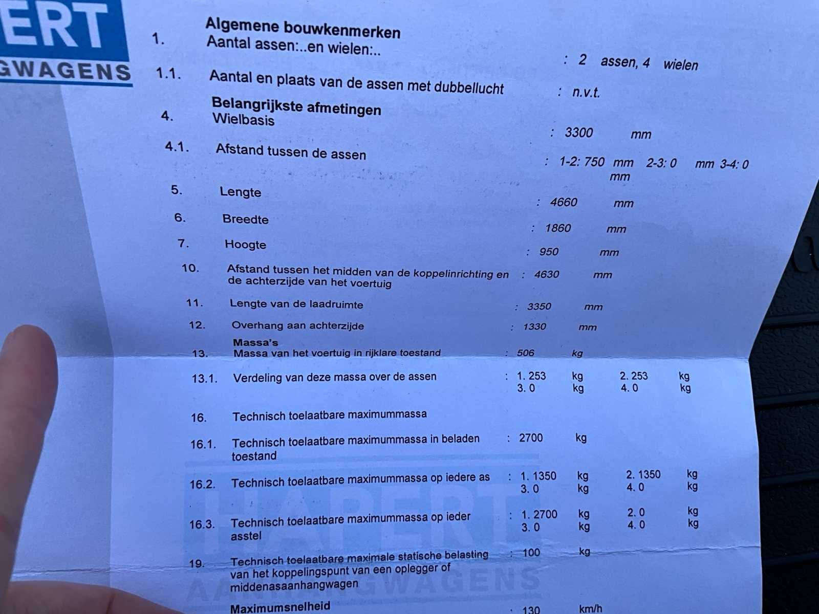Geldige technische keuring tot 17/9/2026 zonder opmerkingen - MTM 2700kg Merk: Hapert TA / AL Bouwjaar: 2012 Chassisnummer: XLHAL270000739362 Aantal assen: 2 Laadbak afmeting l: 3350cm Ledig gewicht: 623kg Datum eerste toelating: 14/5/2012 Kentekenpapieren compleet?: true Lengte: 4660cm Breedte: 1860cm Nationaliteit documenten: B