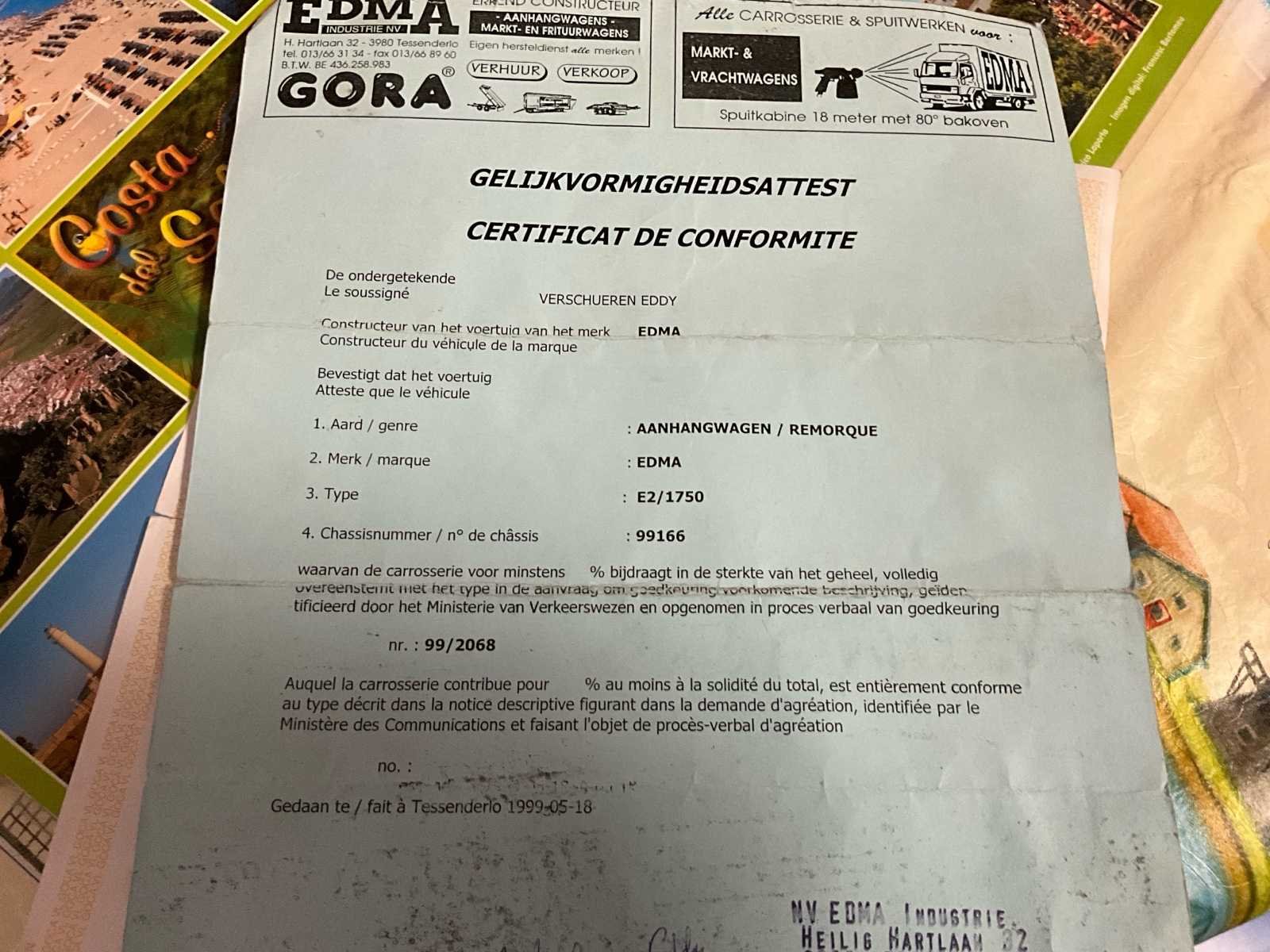400x190x61 1zijsteun ontbreek Kan omgevormd worden tot 1 plateau voor het laden van transport Merk: Edma Type: E2/1750 Chassisnummer: 99166 Aantal assen: 2 Datum eerste toelating: 02061999 Nationaliteit documenten: Belg