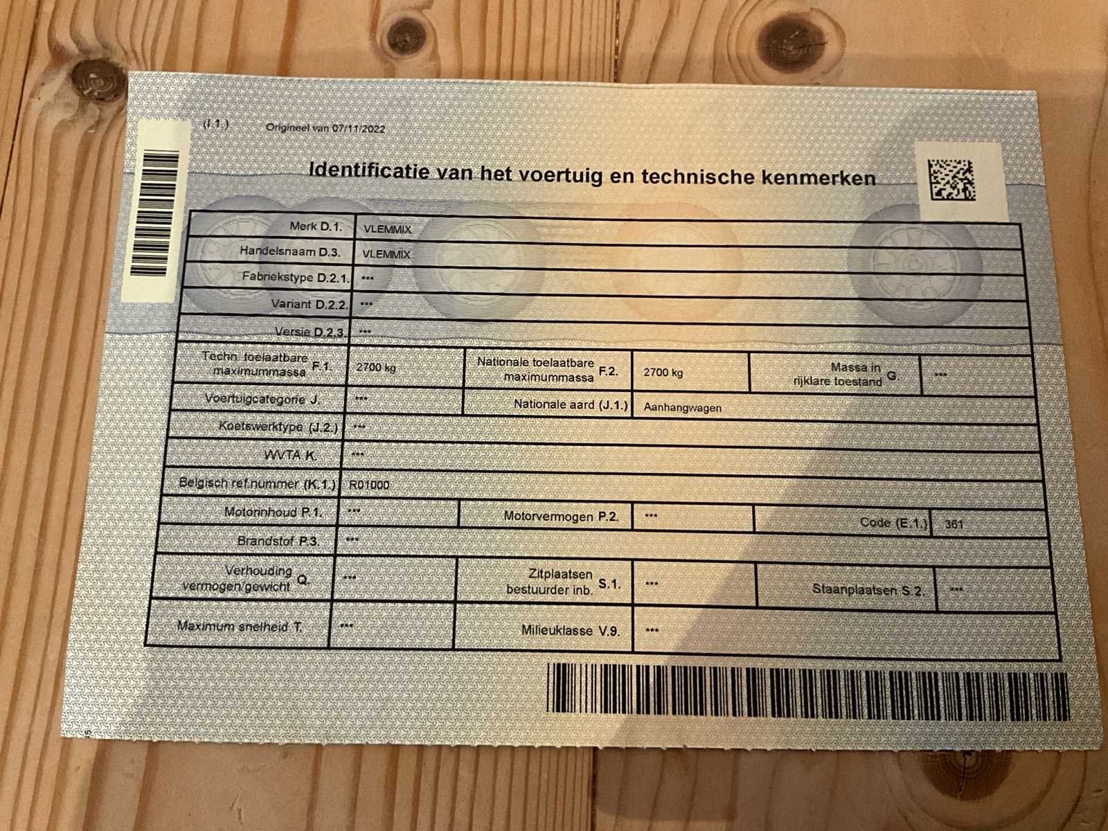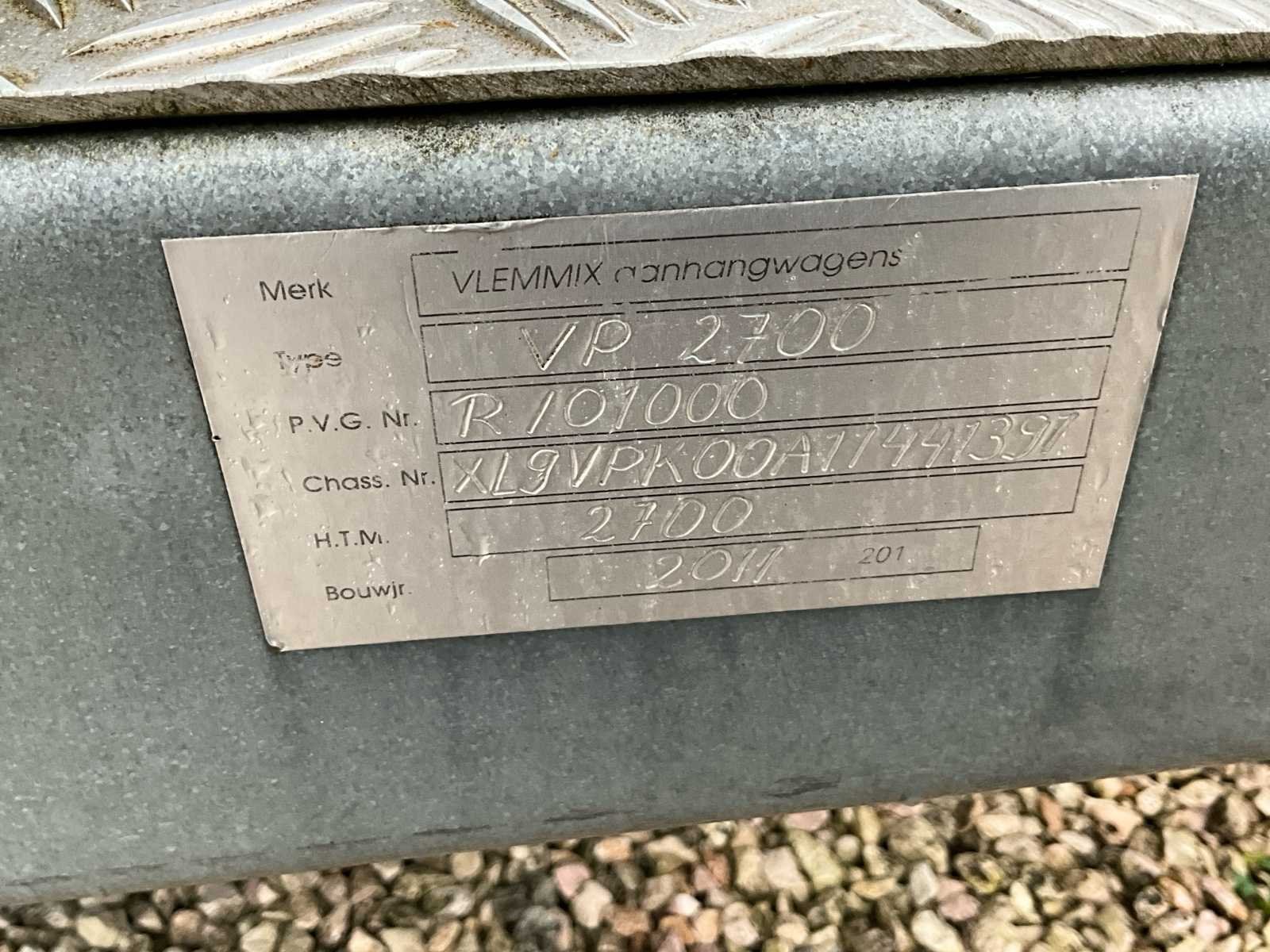 Bash scheurvrij Gekeurd tot 09112026 4000x10800x2000 Geremd 2 rijplaten Achteraansteunen Achterbash is zelf oprollend Vooraan deur Winch aanwezig 2 reserve wielen aanwezig Merk: Vlemmix Model: VP2700 Bouwjaar: 2012 Chassisnummer: XL9VPK00A11441391 Aantal assen: 2 Gesloten opbouw: true Datum eerste toelating: 23032012 Nationaliteit documenten: Belg