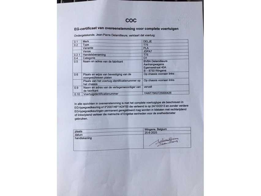 Voorzien van: handhydraulische kipfunctie boorddocumenten: attest gevalideerde e705, gelijkvormigheidsattest staat: ongebruikt Merk: Delje Type: T75 Bouwjaar: 2026 Chassisnummer: YANT75K0826000052 Aantal assen: 2 Laadbak afmeting l: 306cm Laadbak afmeting b: 153cm Laadvermogen: 750kg