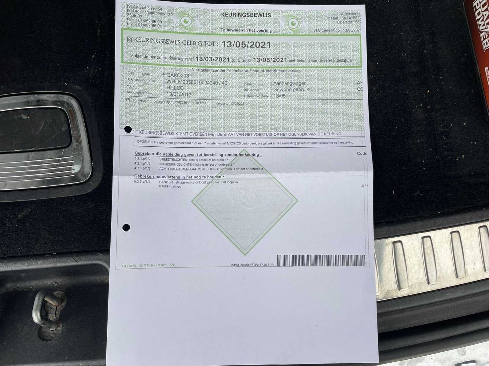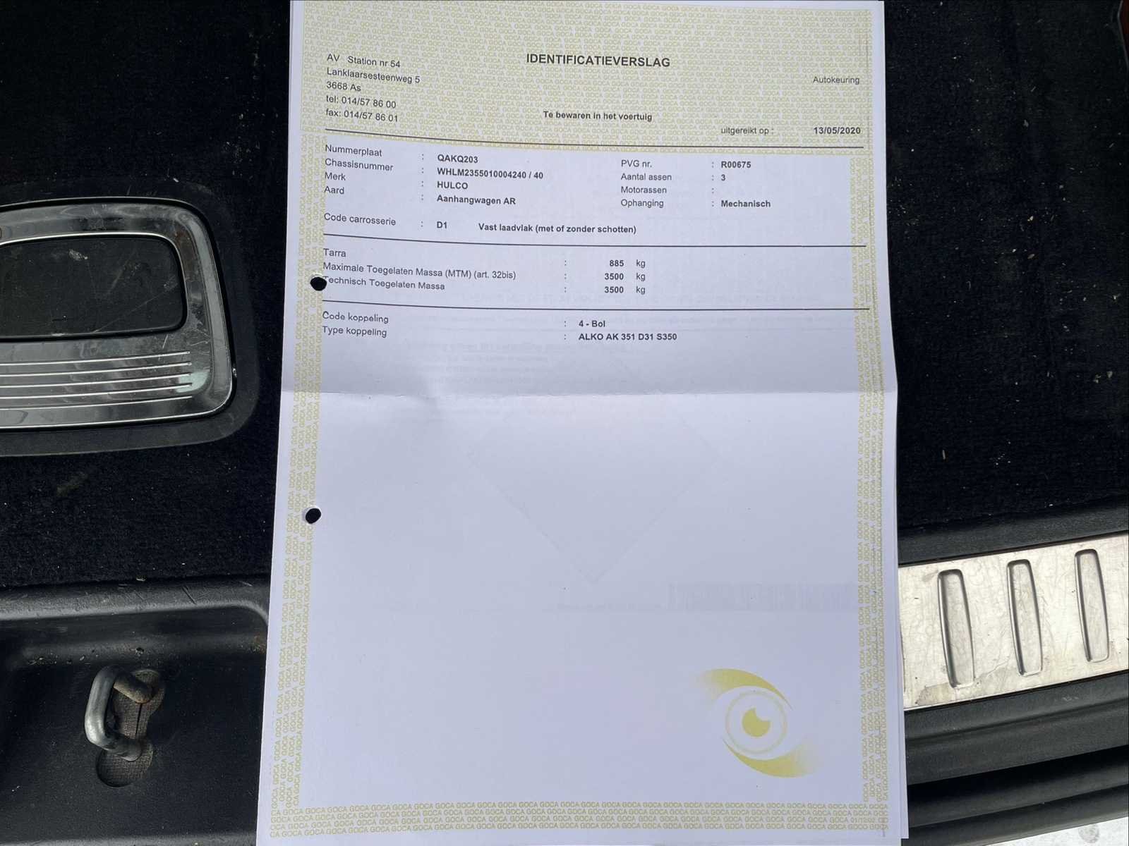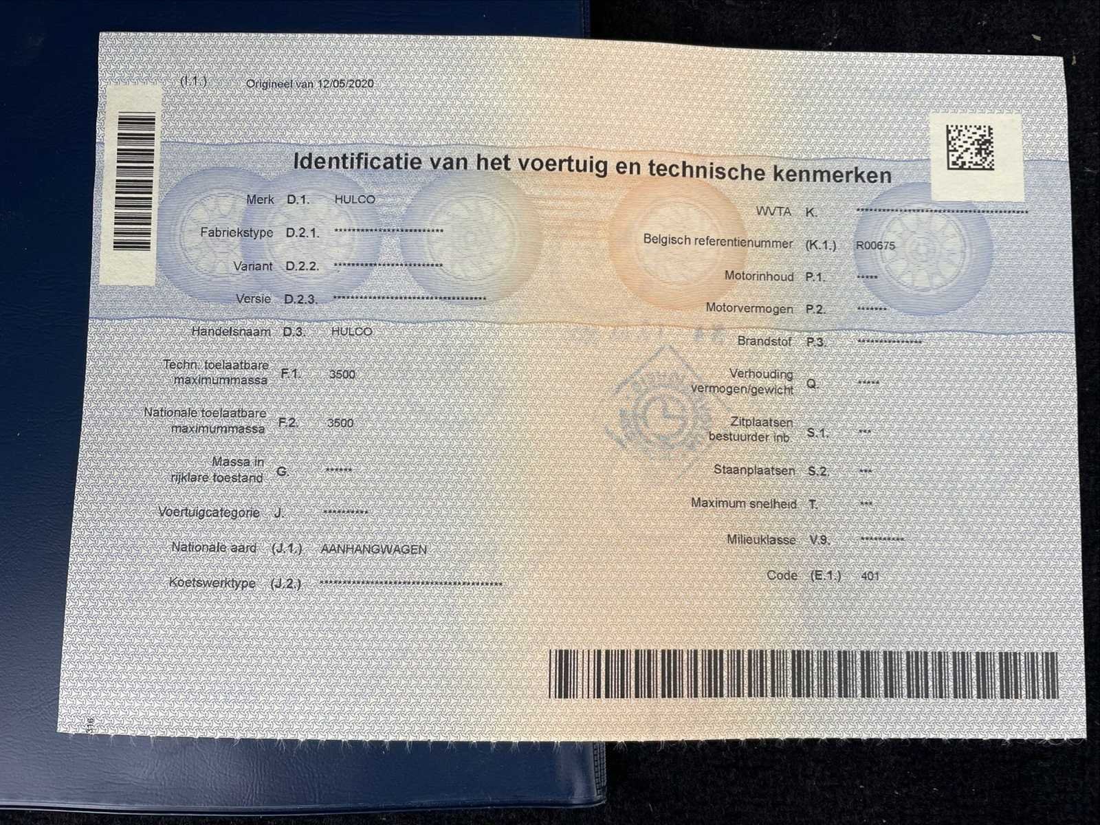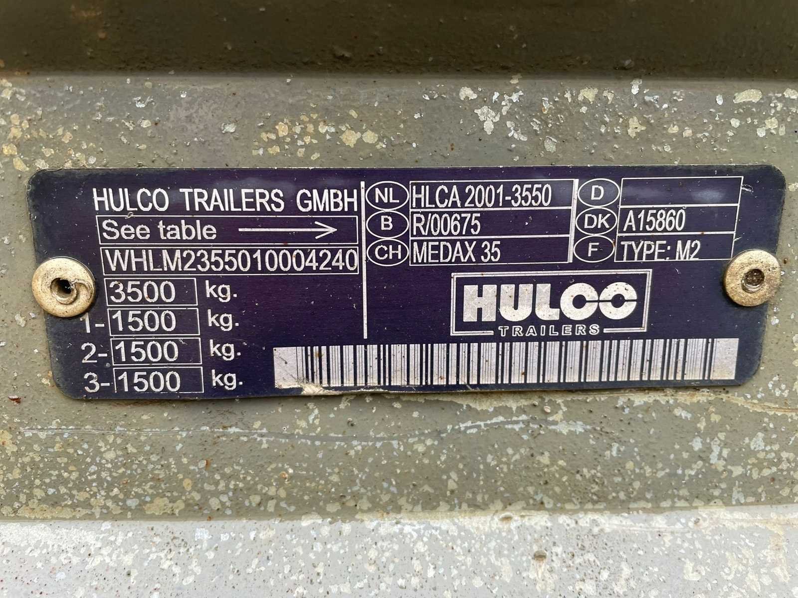 MTM 3500KG en 6 goede banden Merk: Hulco Type: Medax-3 Bouwjaar: 2012 Chassisnummer: WHLM2355010004240 Aantal assen: 3 Laadbak afmeting l: 500cm Laadbak afmeting b: 200cm Datum eerste toelating: 13/01/2012 Nationaliteit documenten: Belgisch