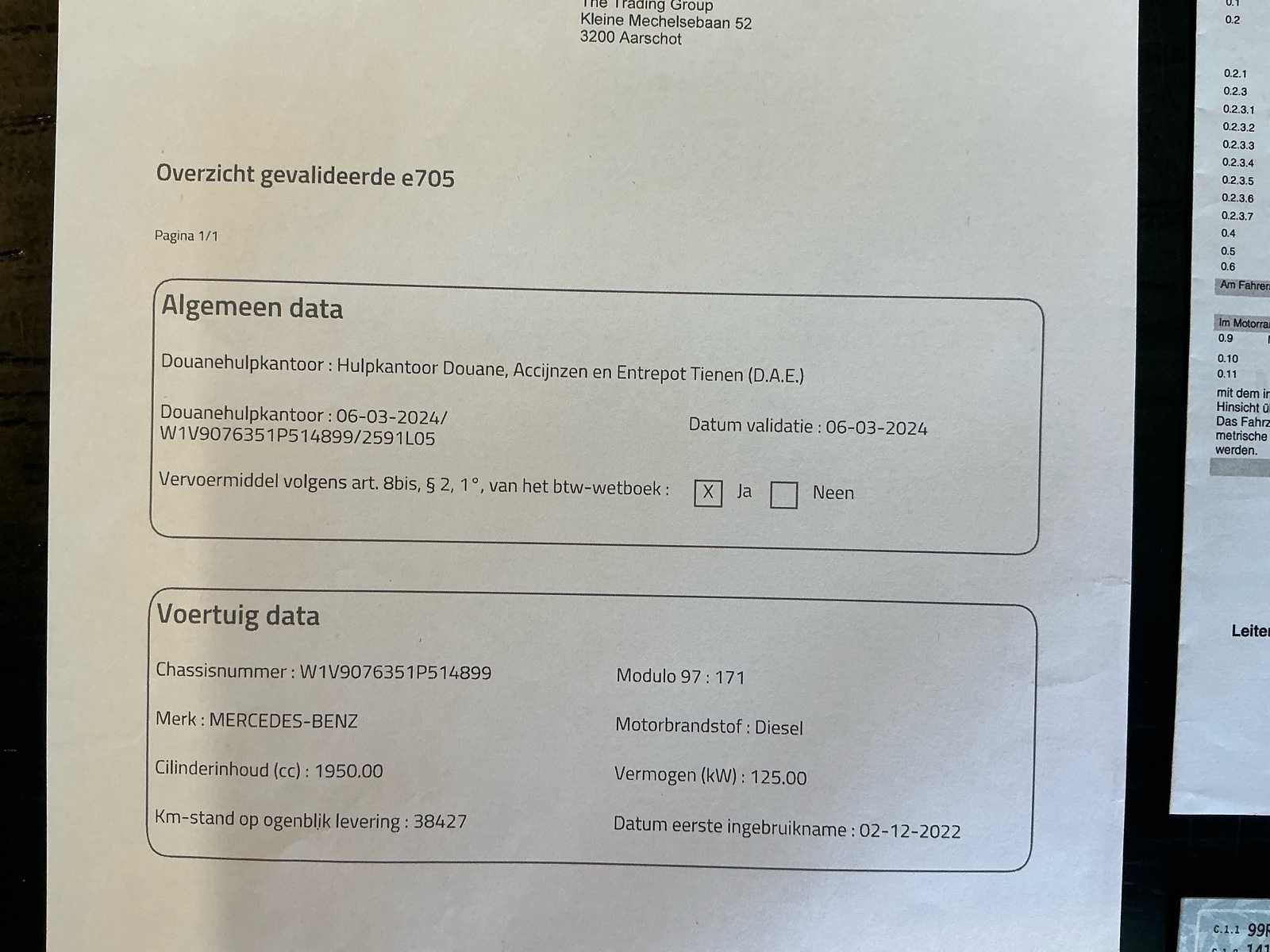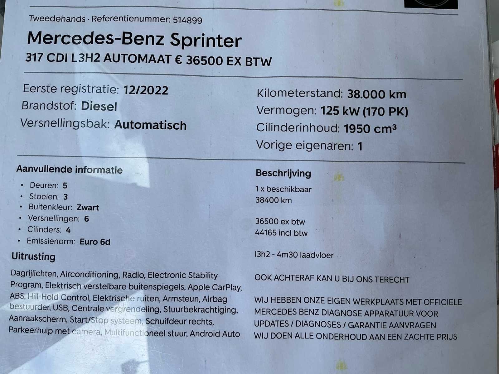 Zwarte Mercedes-Benz Sprinter L3H2 bedrijfswagen in nette staat, voorzien van automatische transmissie en krachtige 170 pk dieselmotor. Bouwjaar 2022 met circa 38.500 km, uitgerust met vier deuren en volledig inzetbaar voor professioneel gebruik. Ideaal voor transport en logistieke toepassingen, inclusief complete documentatie en exportmogelijkheid. Met normale gebruik sporen volgens leeftijd en kilometerstand. Zie foto's. Merk: Mercedes-Benz Type: L3H2 Model: Sprinter Chassisnummer: W1V9076351P514899 Afgelezen kilometerstand: 38537km Cilinderinhoud: 1950cc Vermogen (kW): 125kW Brandstof: Diesel Datum eerste inschrijving: 02/12/2022 Transmissie: Automatisch Aantal zitplaatsen: 3 Kleur: Zwart Nationaliteit documenten: Pools Stuurwiel: LHD Aantal deuren: 4 Aantal sleutels: 2 Vermogen (pk): 170 Aantal cilinders: 4 Velgmaat: 16" Kentekenpapieren compleet?: true Boorddocumenten aanwezig?: true Self drive export possible : true