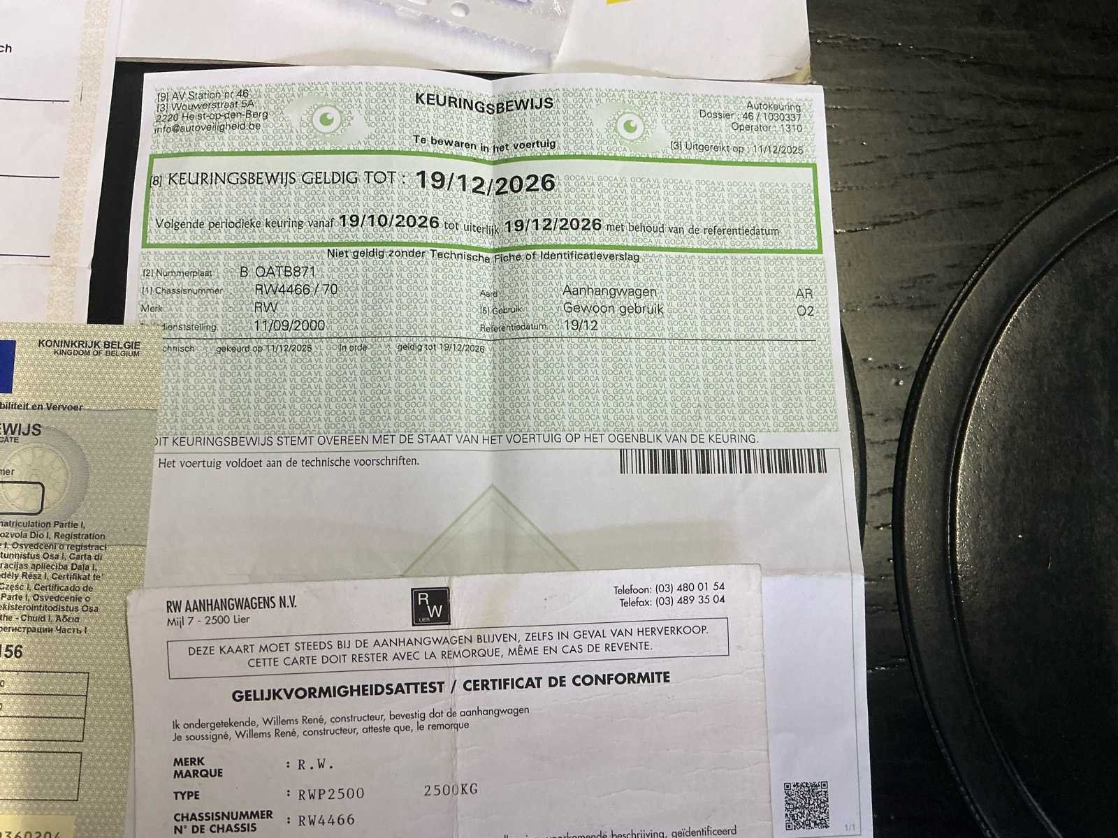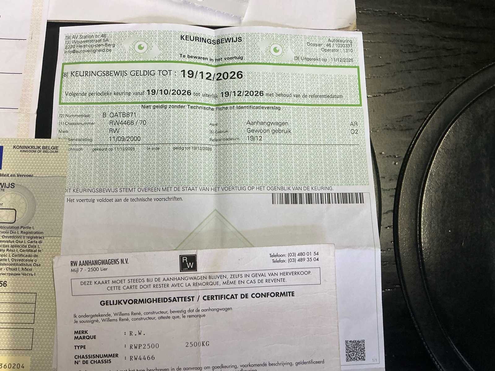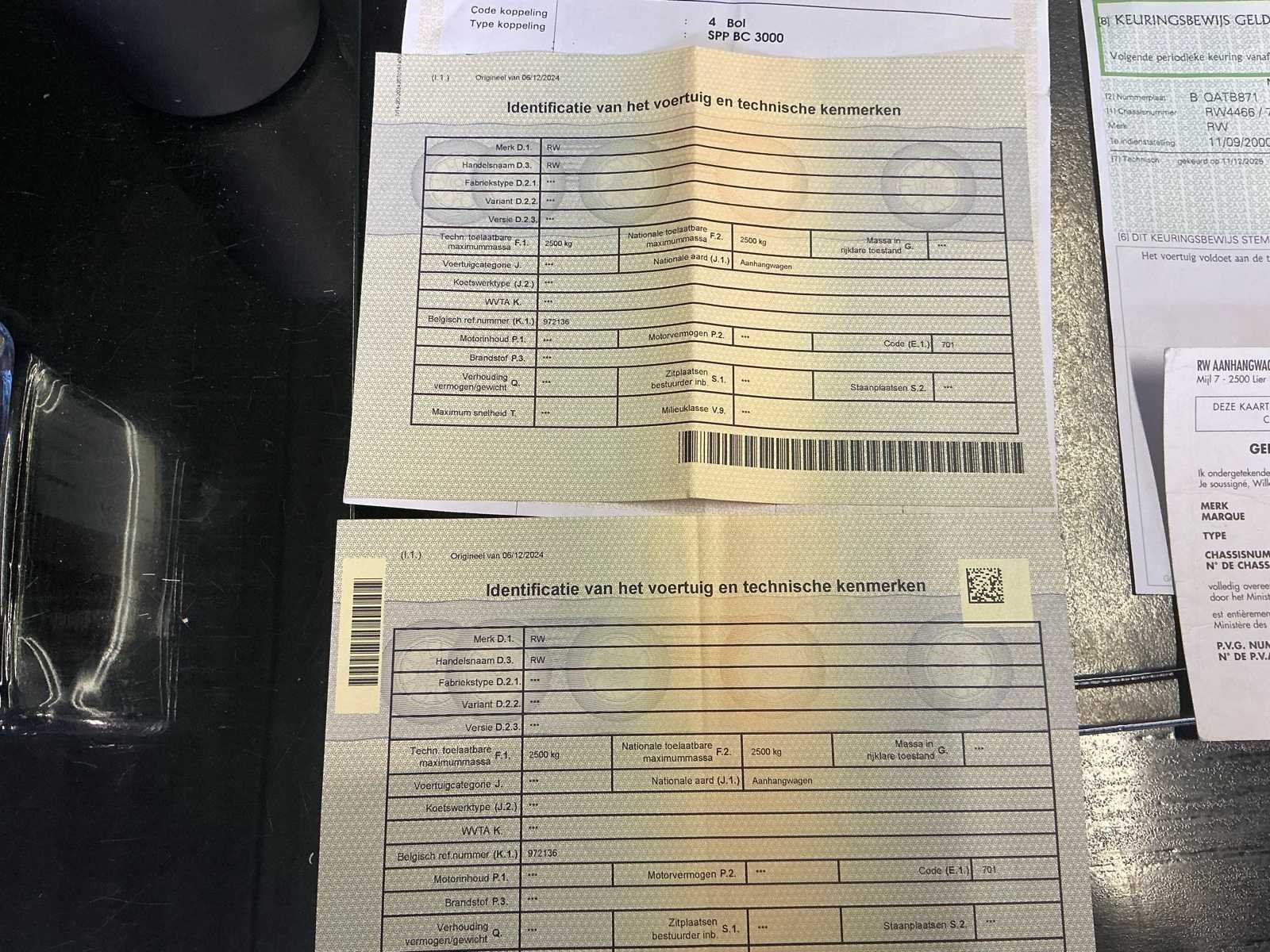 Degelijke RW plateau aanhangwagen type RWP2500 bouwjaar 2000, geschikt voor professioneel gebruik. Deze aanhangwagen is uitgevoerd als 2-assige plateauwagen met een maximaal toegelaten massa van 2500 kg en een tarra van ca. 800 kg, wat zorgt voor een ruime nuttige laadcapaciteit. De aanhangwagen is recent voorzien van 4 nieuwe velgen met nieuwe banden, wat een belangrijke meerwaarde is voor de volgende eigenaar. Voorzien van mechanische ophanging en een kogelkoppeling (4 bol – SPP BC 3000). Extra voorzien van handlier op de aanhangwagen. Laatst blanco gekeurd zonder opmerkingen. Geldig tot einde 2026 Merk: RW Model: RWP2500 (KG) met handlier plateau Chassisnummer: RW4466 Aantal assen: 2 Laadbak afmeting l: 404cm Laadbak afmeting b: 204cm Ledig gewicht: 800kg Laadvermogen: 1700kg Datum eerste toelating: 11/09/2000 Nationaliteit documenten: Belgisch Zelf rijdend exporteren: Mogelijk