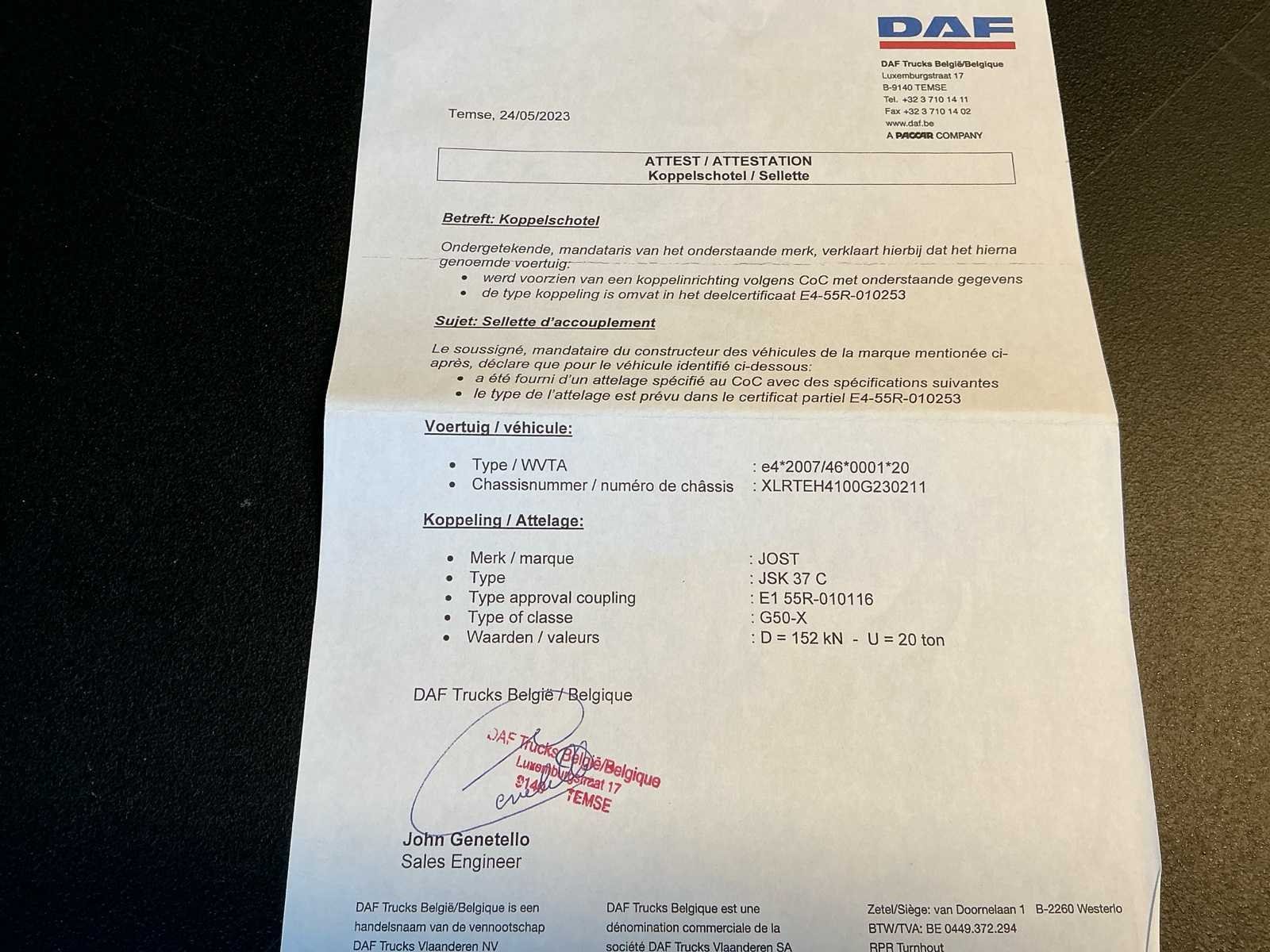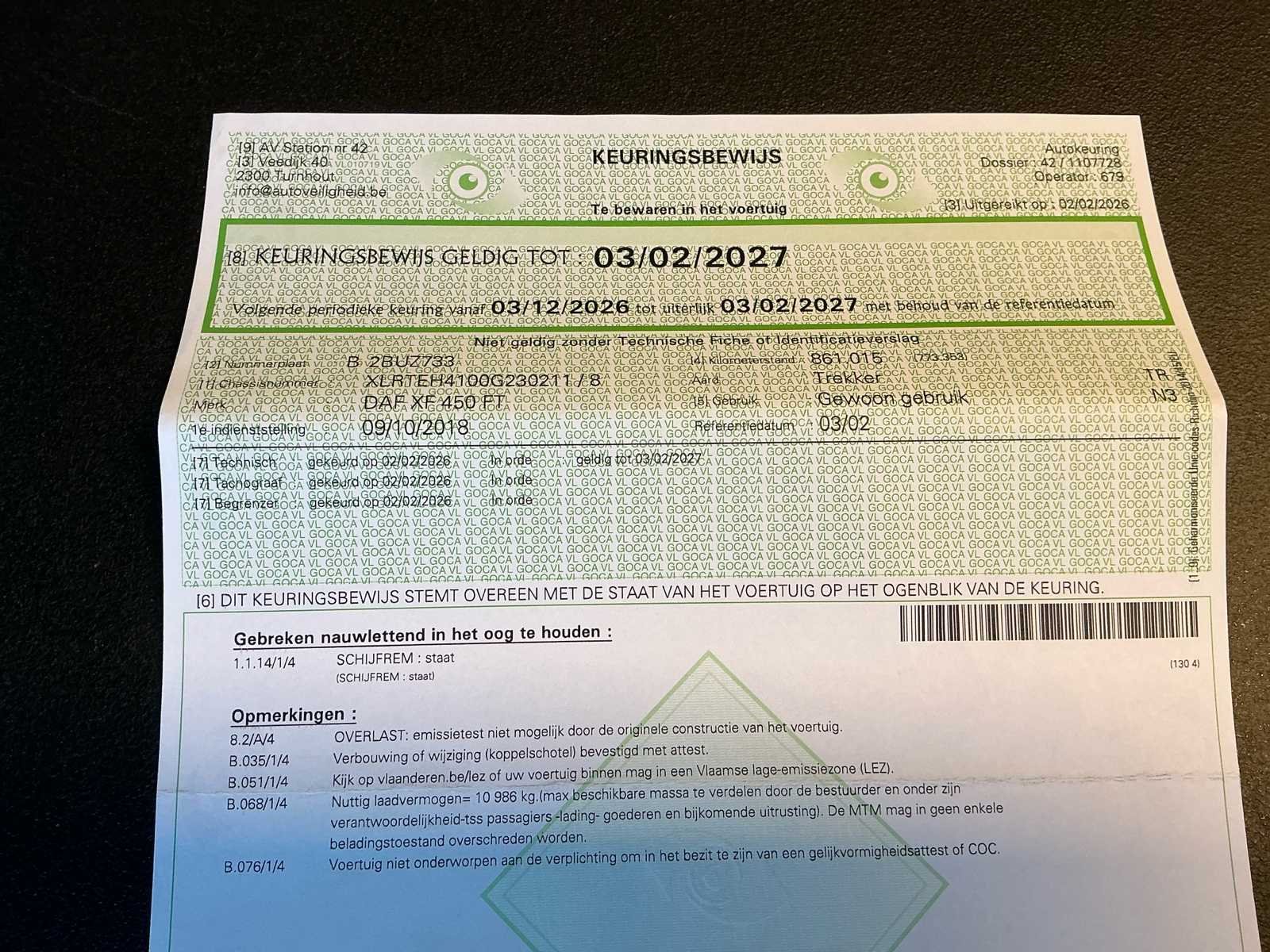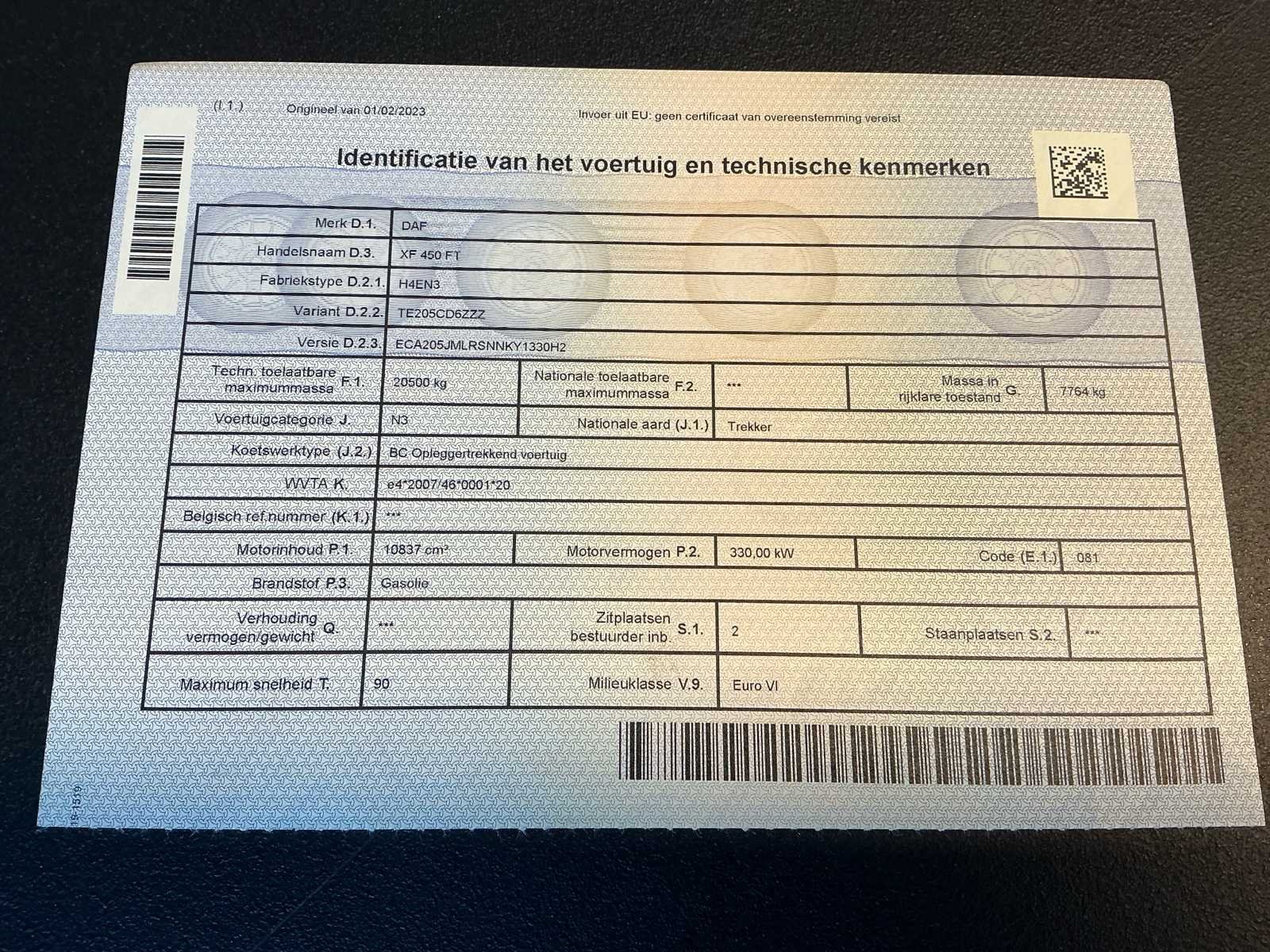 Merk: DAF Type: XF 450 FT Bouwjaar: 2018 Chassisnummer VIN: XLRTEH4100G230211 Cilinderinhoud: 10837cc Kilometerstand bij opname: 873397km Aantal assen: 2 Asconfiguratie: Dubbel Fuel Type: Diesel Slaapcabine: true Startinformatie: Start en rijdt Nationaliteit documenten: Belgisch Automaat: true Diesel: true