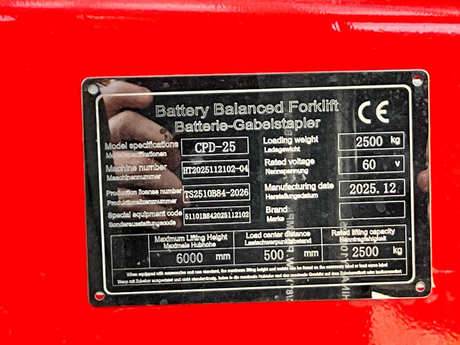 Incl. Oplader Merk: HUATENG Type: CPD-25 Bouwjaar: 2025 Serienummer: HT2025112102-04 Afgelezen urenstand: 3.1 Side-shift: true Triple mast: true Hefvermogen: 2500kg Lepellengte: 1200mm Max. hefhoogte: 6000mm Vol rubber banden: true Minimale doorrijhoogte: 2610mm Totale afmeting L: 2400mm Totale afmeting Breedte: 1200mm