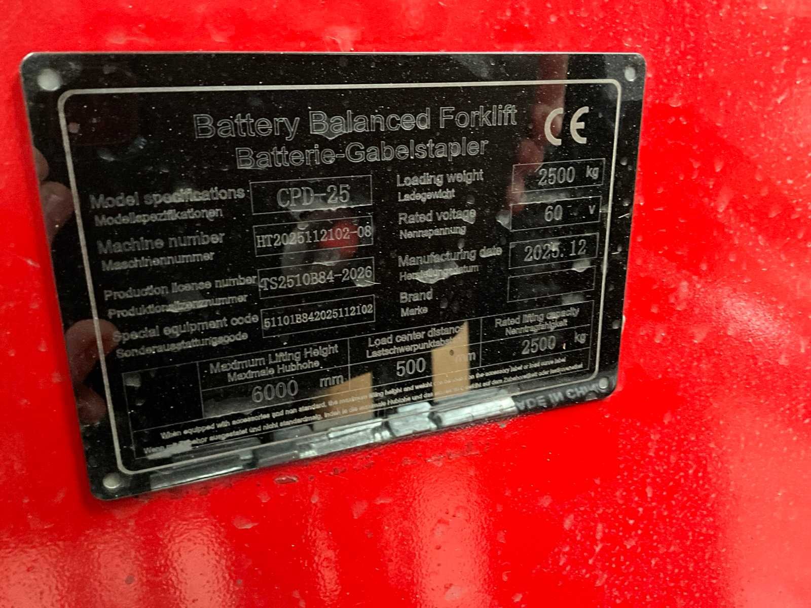 Incl. Oplader Merk: HUATENG Type: CPD-25 Bouwjaar: 2025 Serienummer: HT2025112102-08 Side-shift: true Triple mast: true Hefvermogen: 2500kg Lepellengte: 1200mm Max. hefhoogte: 6000mm Vol rubber banden: true Minimale doorrijhoogte: 2610mm Totale afmeting L: 2400mm Totale afmeting Breedte: 1200mm
