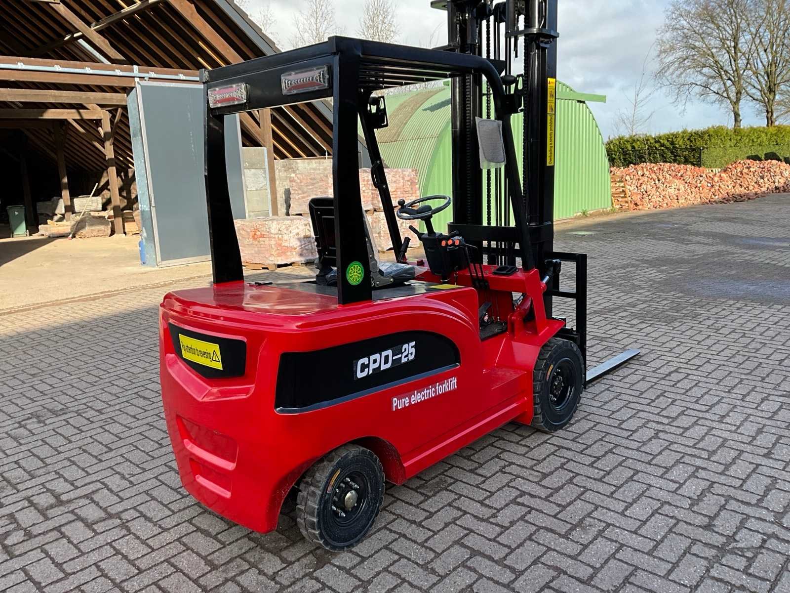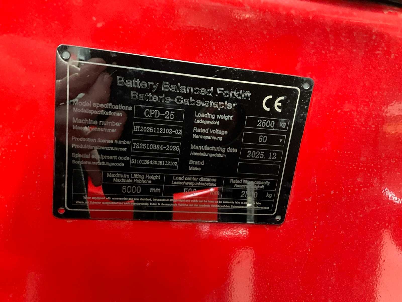 Incl. Oplader Merk: HUATENG Type: CPD-25 Bouwjaar: 2025 Serienummer: HT2025112102-02 Side-shift: true Triple mast: true Hefvermogen: 2500kg Lepellengte: 1200mm Max. hefhoogte: 6000mm Vol rubber banden: true Minimale doorrijhoogte: 2610mm Totale afmeting L: 2400mm Totale afmeting Breedte: 1200mm