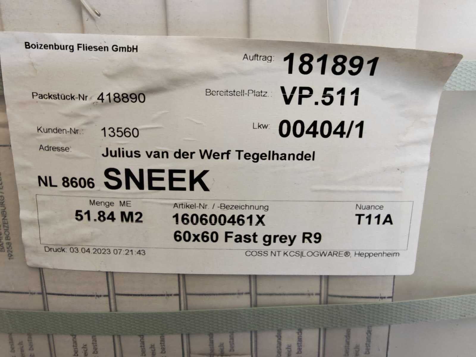 Merk: Grandeur Kleur: Grey Afwerking: Mat R9 Lengte: 600mm Breedte: 600mm Dikte: 9mm Materiaal: Keramiek Type: Vloertegel Model: Fast Aantal m² per verpakking: 1.44m² Aantal pakken: 16 Totaal oppervlakte: 21.96m² Totaal gewicht: 440kg