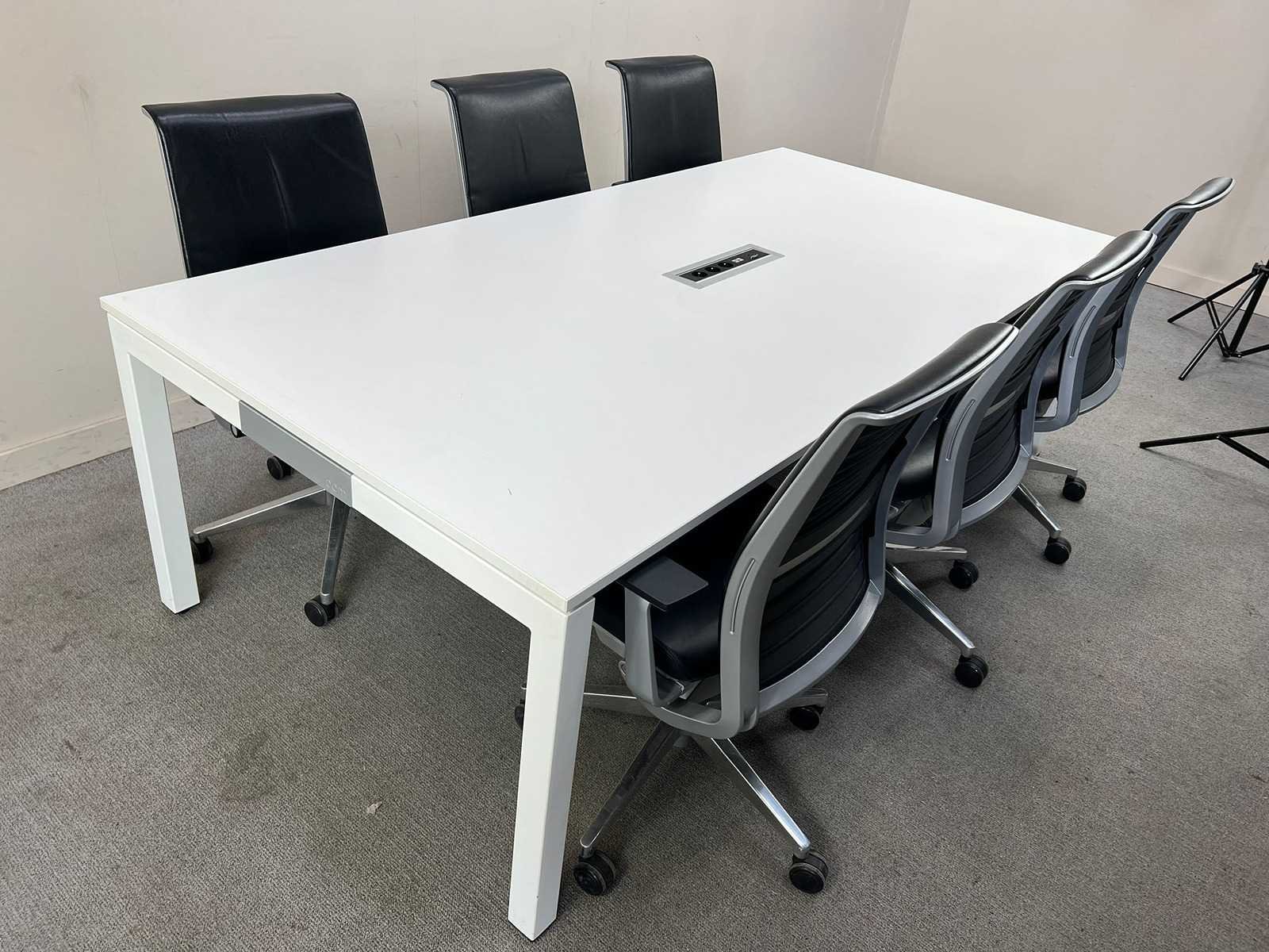 V1068 en V1069 Pami vergadertafel wit 240x120 wit melamine / U poot Incl kabeldoorvoer alu Incl 6 x steelcase think vergaderstoel luxe uitvoering. : zwart leder, lumbar support, draaibaar,rug kantelbaar, zitvlak in diepte verstelbaar , chrome stervoet op wielen. Merk: PAMI Model: Vergadertafel = 6 x Steelcase think vergaderstoelen Kleur: wit/grijs Lengte: 240cm Breedte: 120cm Hoogte: 75cm