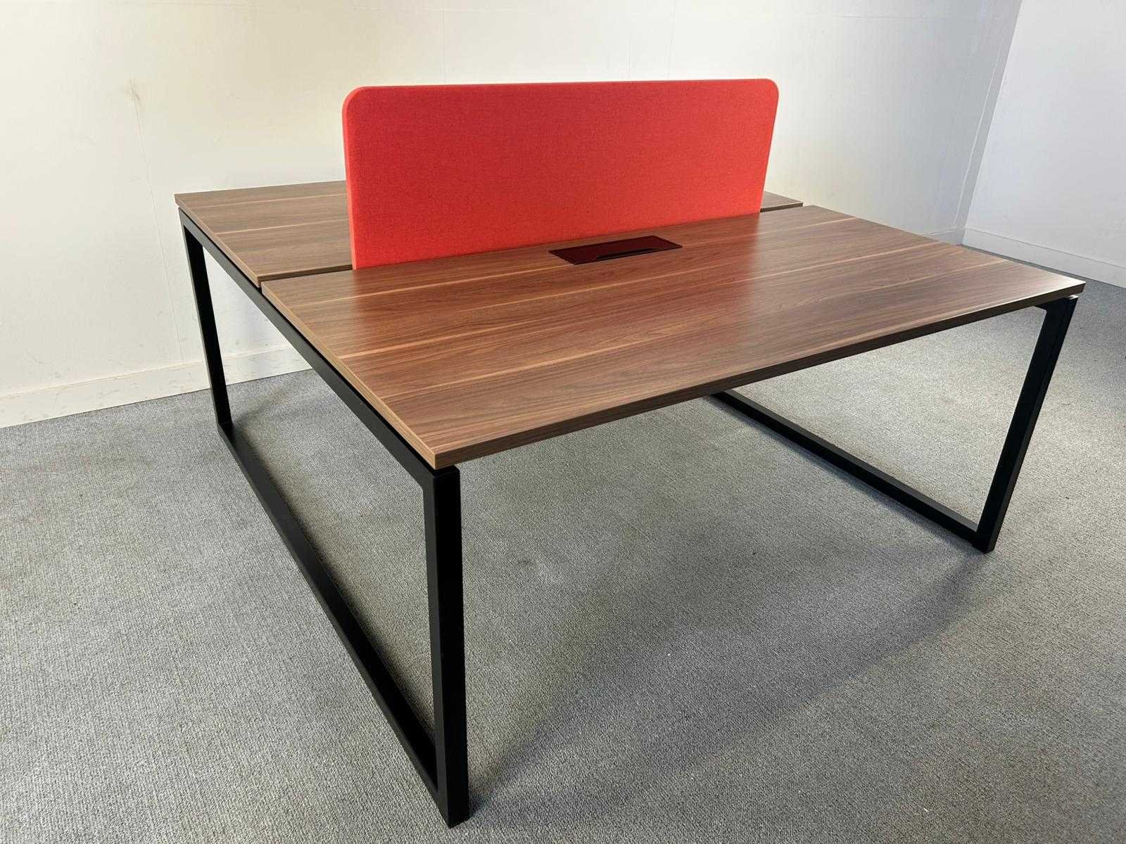 2-persoons werkbench met zwart metalen U-poot onderstel en een stijlvol donkerhouten werkblad. De set bevat een brede selectie scheidingspanelen in diverse kleuren. Paneel: Rood (120x37) Product type: 2-p workbench Kleur: Rood / Hout Materiaal: Donker hout