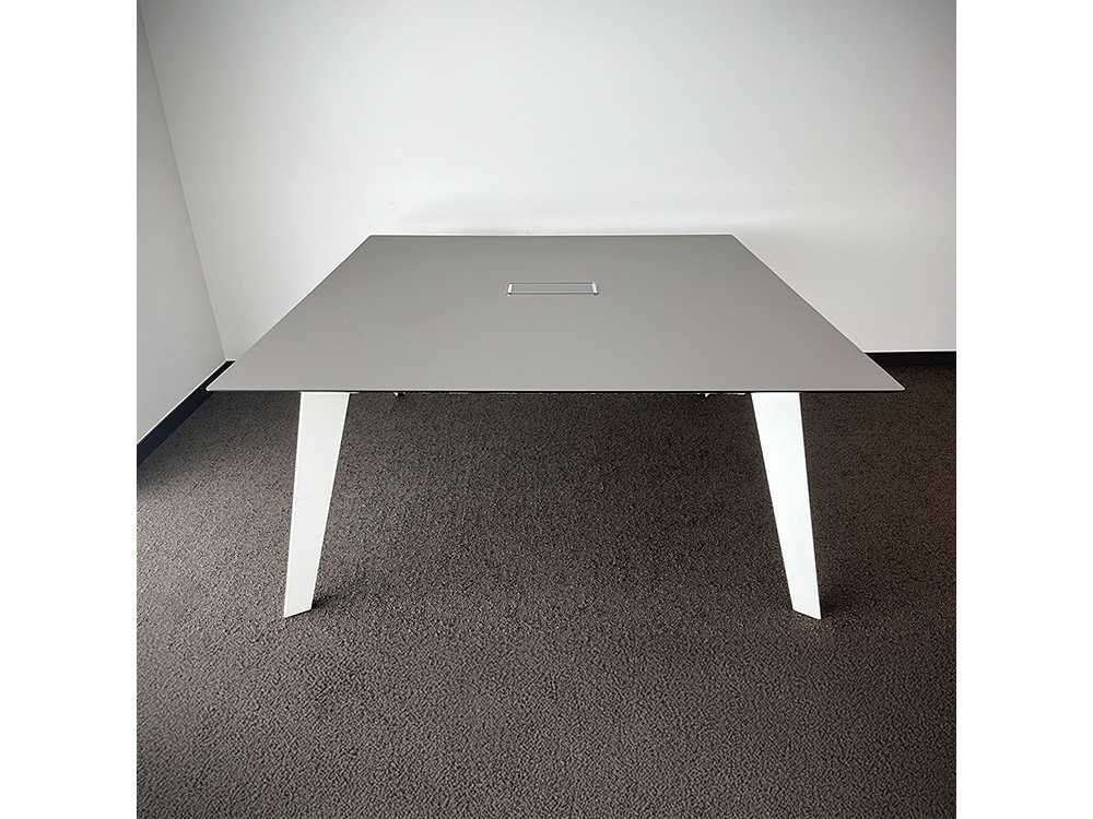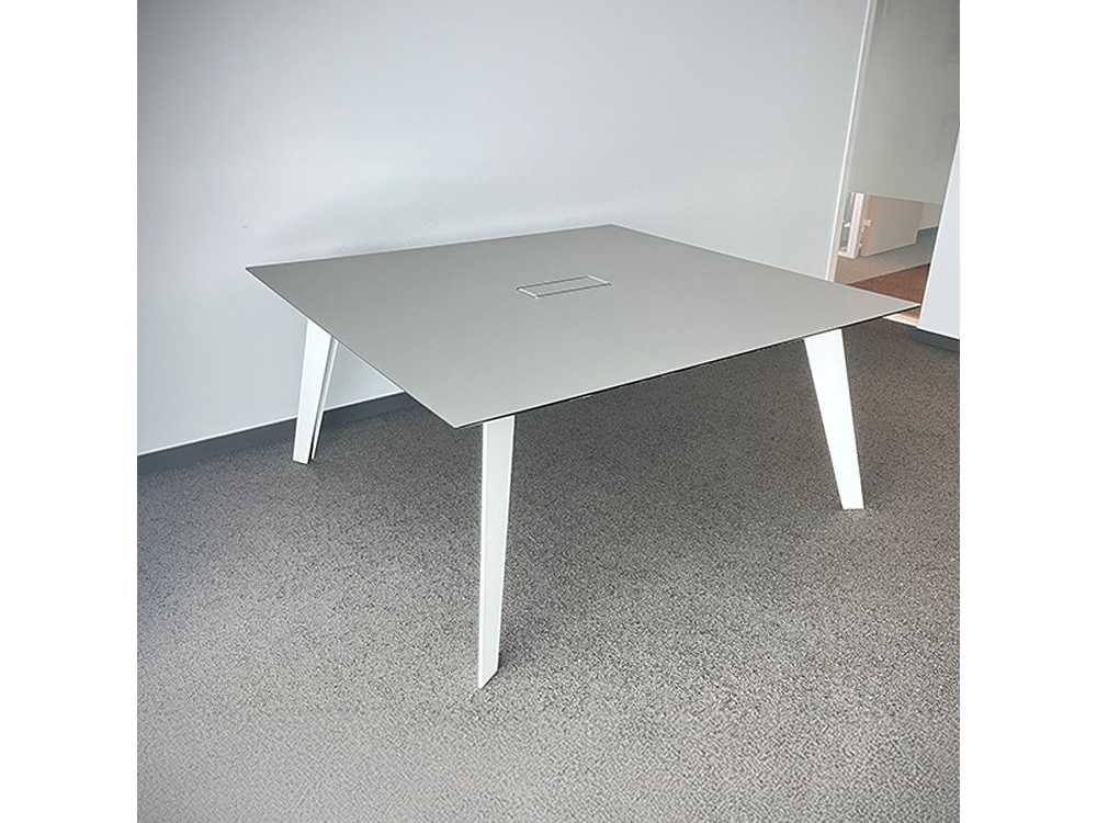 Vergadertafel B158xD158xH73 - Grijs HPL / Wit Metaal Vierpoot Vergadertafel met een muisgrijs HPL-blad en wit metalen poten. Voorzien van centrale kabeldoorvoer, geschikt voor vergaderruimtes of teamopstellingen. Kleur: Grijs Gewicht: 50kg Lengte: 158cm Breedte: 158cm Hoogte: 73cm Materiaal: HPL