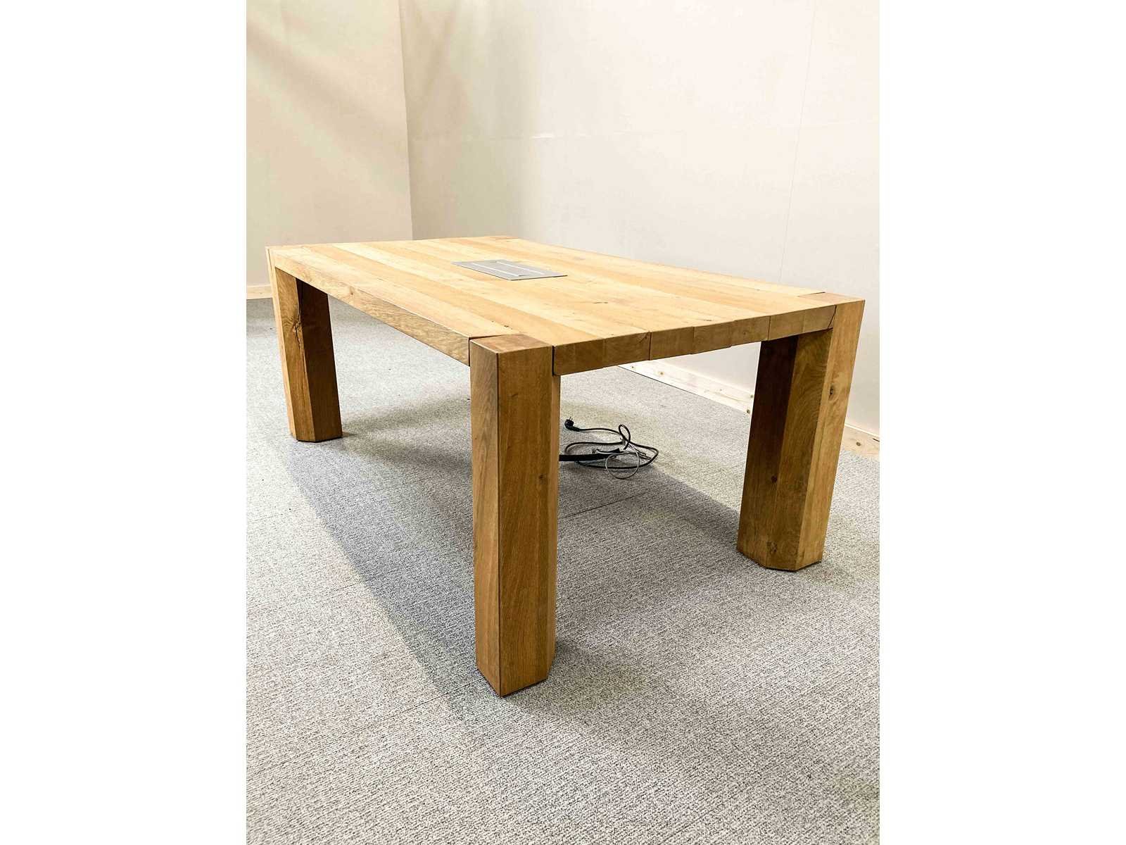 Vergadertafel B179xD102xH74 - Eik Hout / Eik 4-poot Massief houten vergadertafel met midden stroom aansluitpunt Prachtige massief houten vergardertafel voor tot 8 personen, met 4 stevige massief houten voeten en een stroom aansluiting voorziening in het midden. - Extra info: Vol hout - Opmerkingen: In zéér goede staat - Opgelet: Tafels komen steeds ZONDER elektrificatie en kabelage tenzij uitdrukkelijk anders vermeld in de omschrijving. Fotos met eventuele stekkerdozen, kabelage e.d. zijn zuiver ter illustratie van de mogelijkheden Kleur: Hout Gewicht: 70kg Lengte: 179cm Breedte: 102cm Hoogte: 74cm Materiaal: Hout