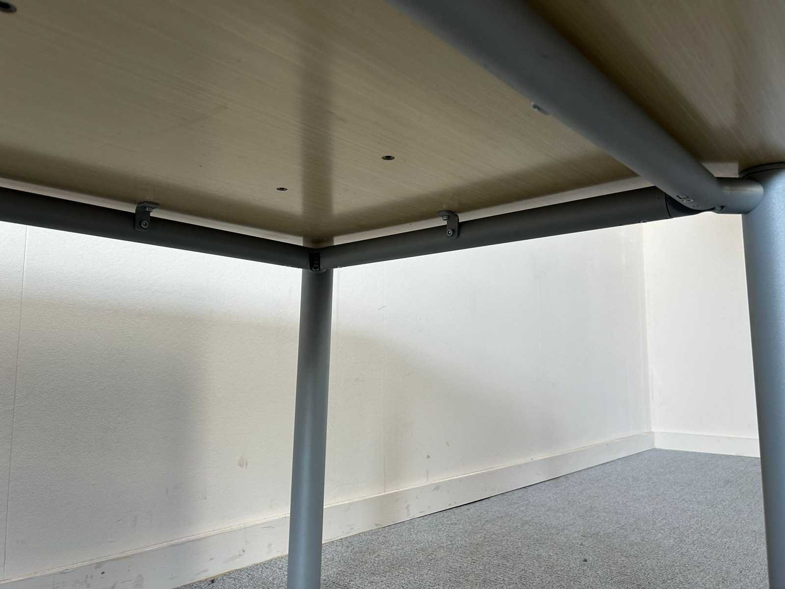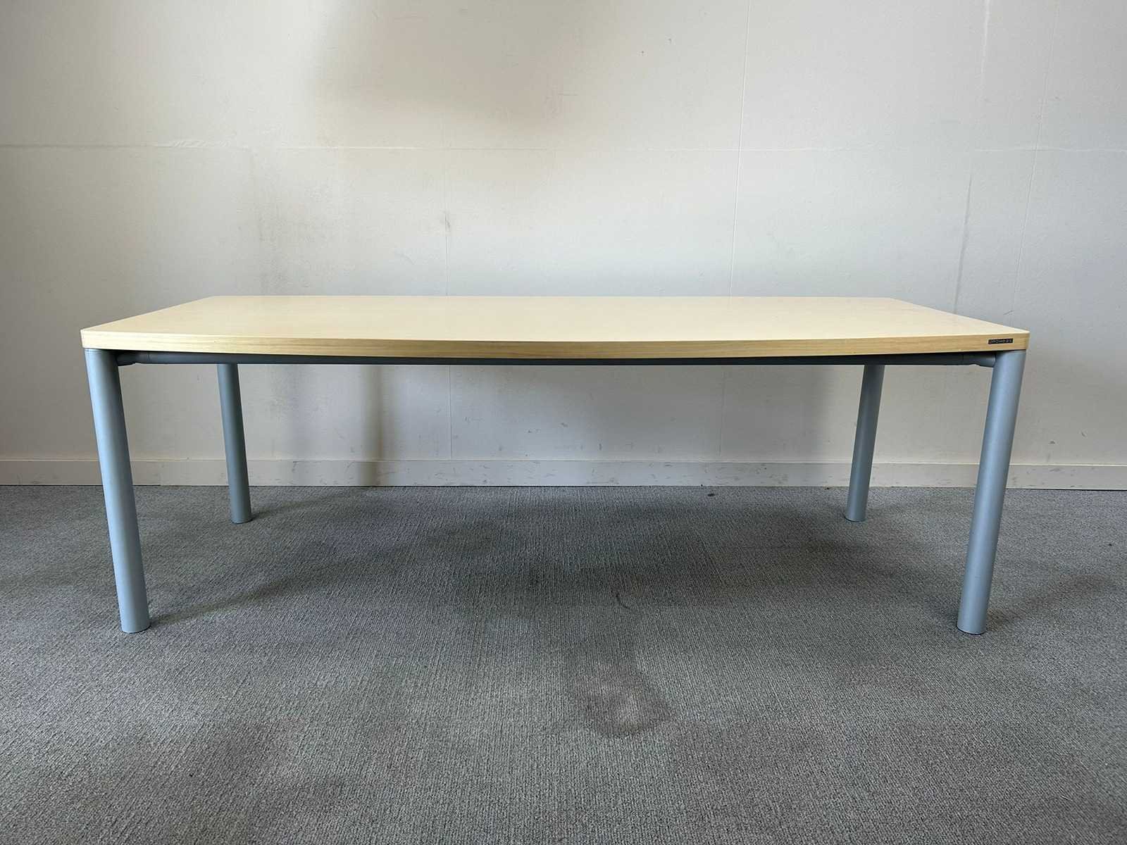 Rechthoekige vergader- of bureautafel met licht houtkleurig blad (afgeronde hoeken) en cilindrische metalen poten in grijs. Strak, tijdloos ontwerp, geschikt voor kantoor, vergaderruimte of projectinrichting. Stabiele uitvoering, in nette gebruikte staat. Merk: DROMEAS Kleur: esdoorn Gewicht: 60kg Lengte: 210cm Breedte: 100cm Hoogte: 73cm Materiaal: melamine