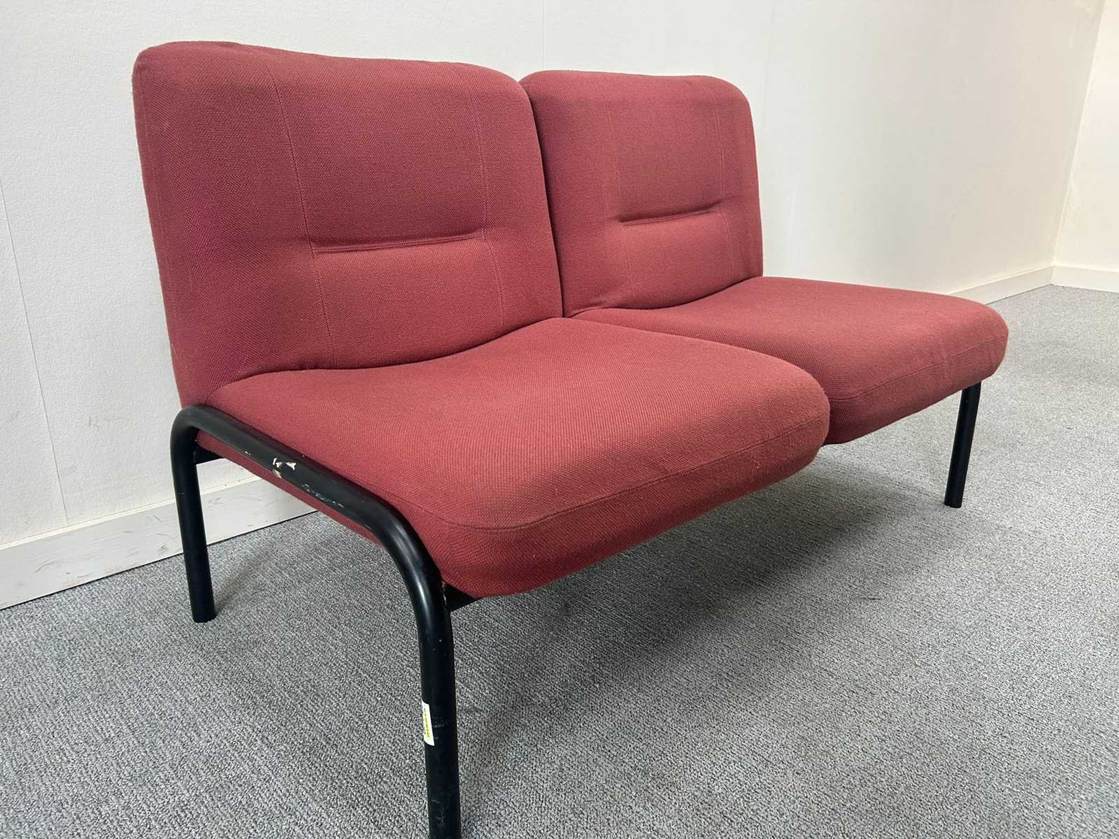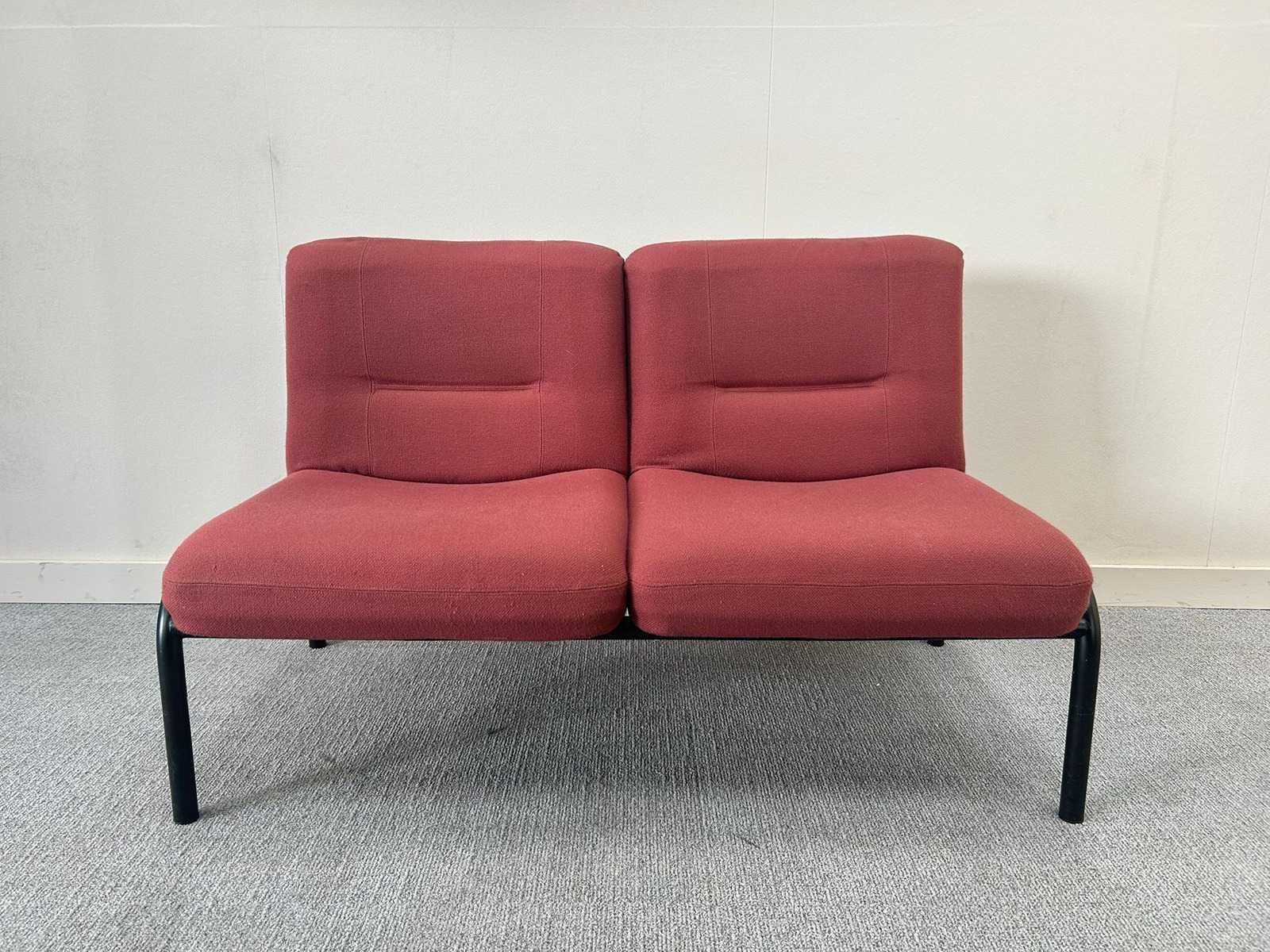 Tweezits lounge-/wachtbank met strak, tijdloos ontwerp. Uitgevoerd met comfortabele, vast gestoffeerde zit- en rugkussens in bordeauxrode stof. De bank bestaat uit twee aaneengeschakelde zitmodules met afzonderlijke rugleuningen. Het onderstel is uitgevoerd in zwart gelakt metalen buisframe, wat zorgt voor een stabiele en duurzame constructie. Geschikt voor wachtzones, ontvangstruimtes, kantoren of informele zithoeken. In gebruikte maar nette staat, met lichte gebruikssporen passend bij normaal gebruik. Merk: BRUNE Type: zitbank/wachtbank Model: 2-zit Lengte: 125cm Breedte: 40cm Hoogte: 80cm Materiaal: textiel