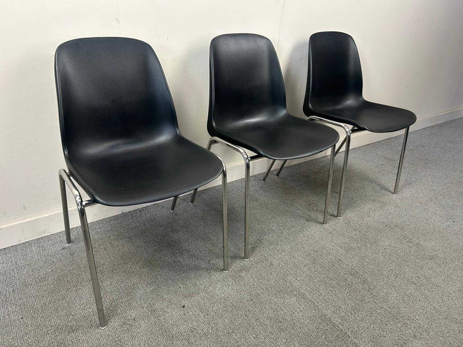 Set van 10 stapelbare kuipstoelen in zwarte kunststof. In goede staat, enkele gebruikssporen aanwezig. Type: Kuipstoel Kleur: Zwart Gewicht: 80kg Materiaal: Kunststof