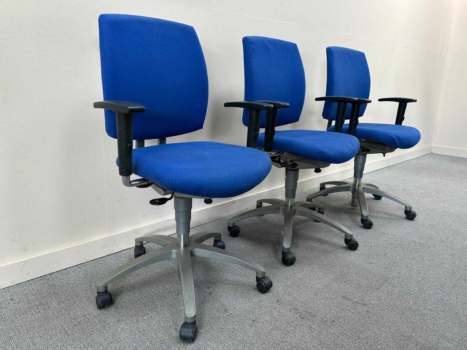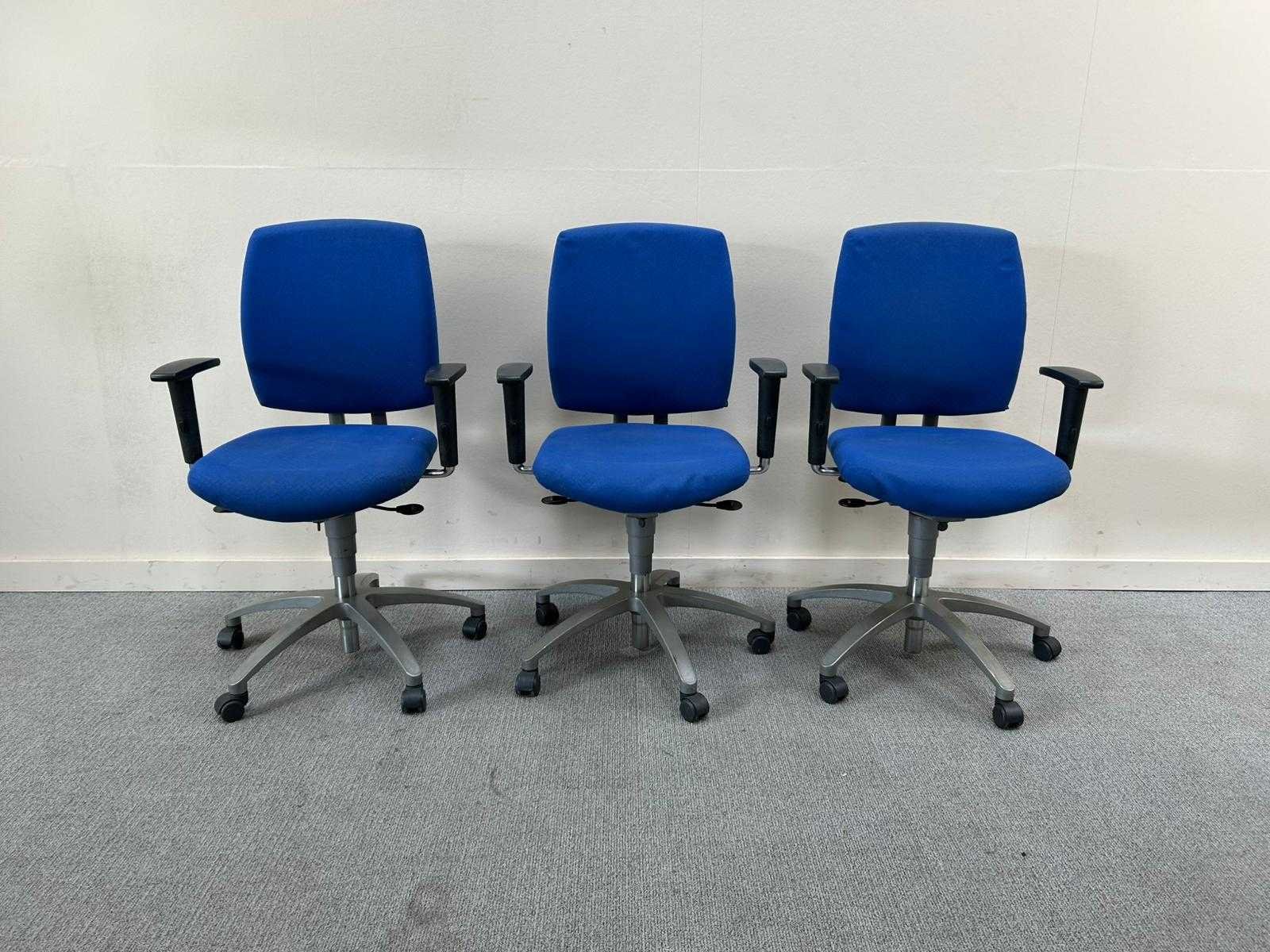 Een set van 3 blauwe Drabert bureaustoelen op metalen voetkruis met wielen. Merk: DRABERT Type: Entrada Kleur: Blauw Gewicht: 25kg Materiaal: Stof