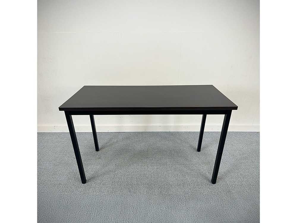 Compacte tafel met donker bruine blad en zwart metalen poten. geschikt voor eetruimtes, kan ook als bureau worden gebruikt Kleur: donker bruin Gewicht: 10kg Lengte: 120cm Breedte: 50cm Hoogte: 75cm Materiaal: melamine