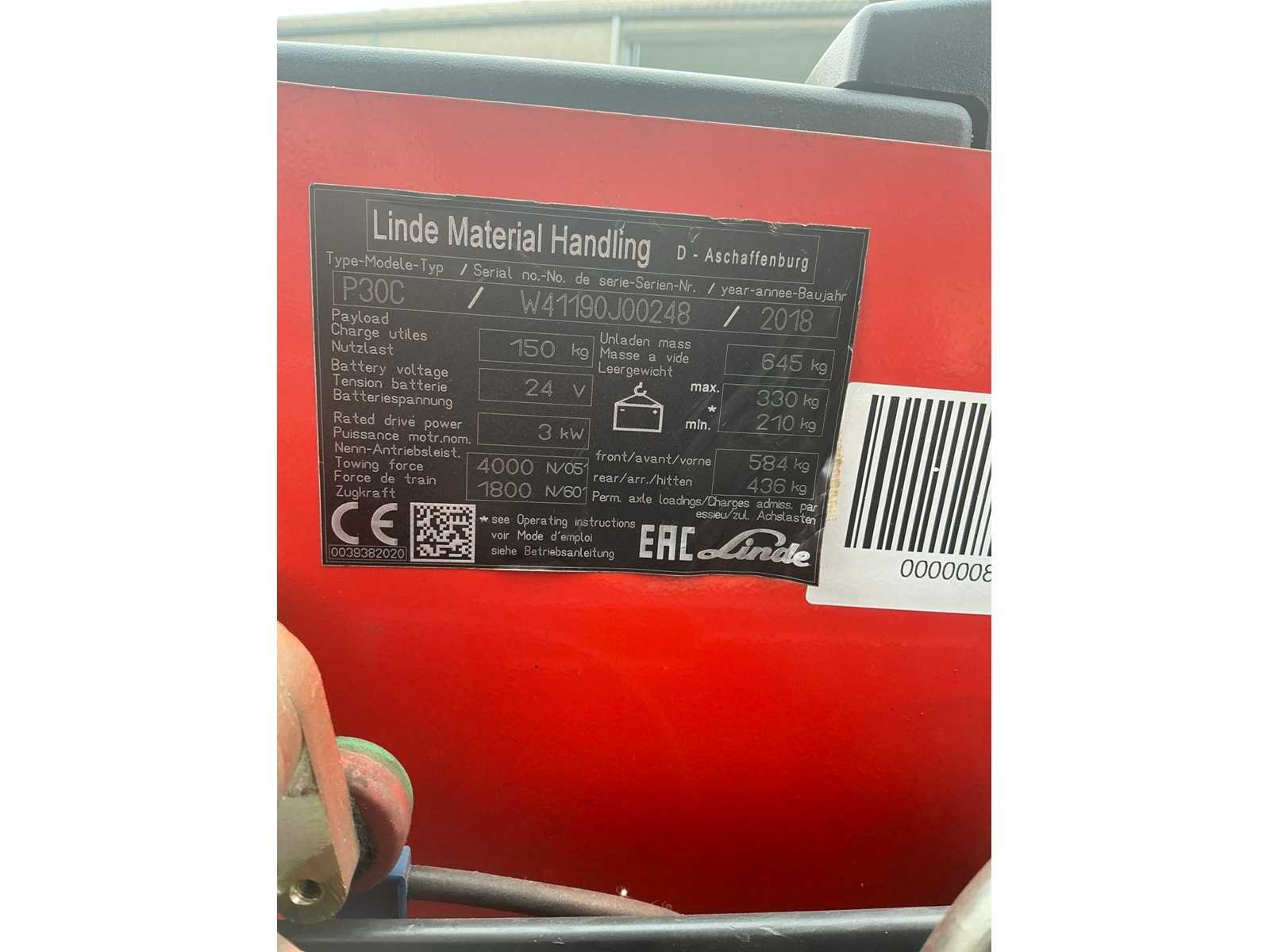 2022 accu , trekhaak achter , flash light , blue spot , standlichten Merk: Linde Type: P30C Bouwjaar: 2018 Serienummer: W41190J00248 Elektrisch: true Motorvermogen (kW): 3kW Trekcapaciteit: 3000kg Max. snelheid: 16km/h Afgelezen urenstand: 3770 Eigen gewicht: 970kg Totale afmeting L: 1500mm Totale afmeting Breedte: 800mm Totale afmeting Hoogte: 1350mm