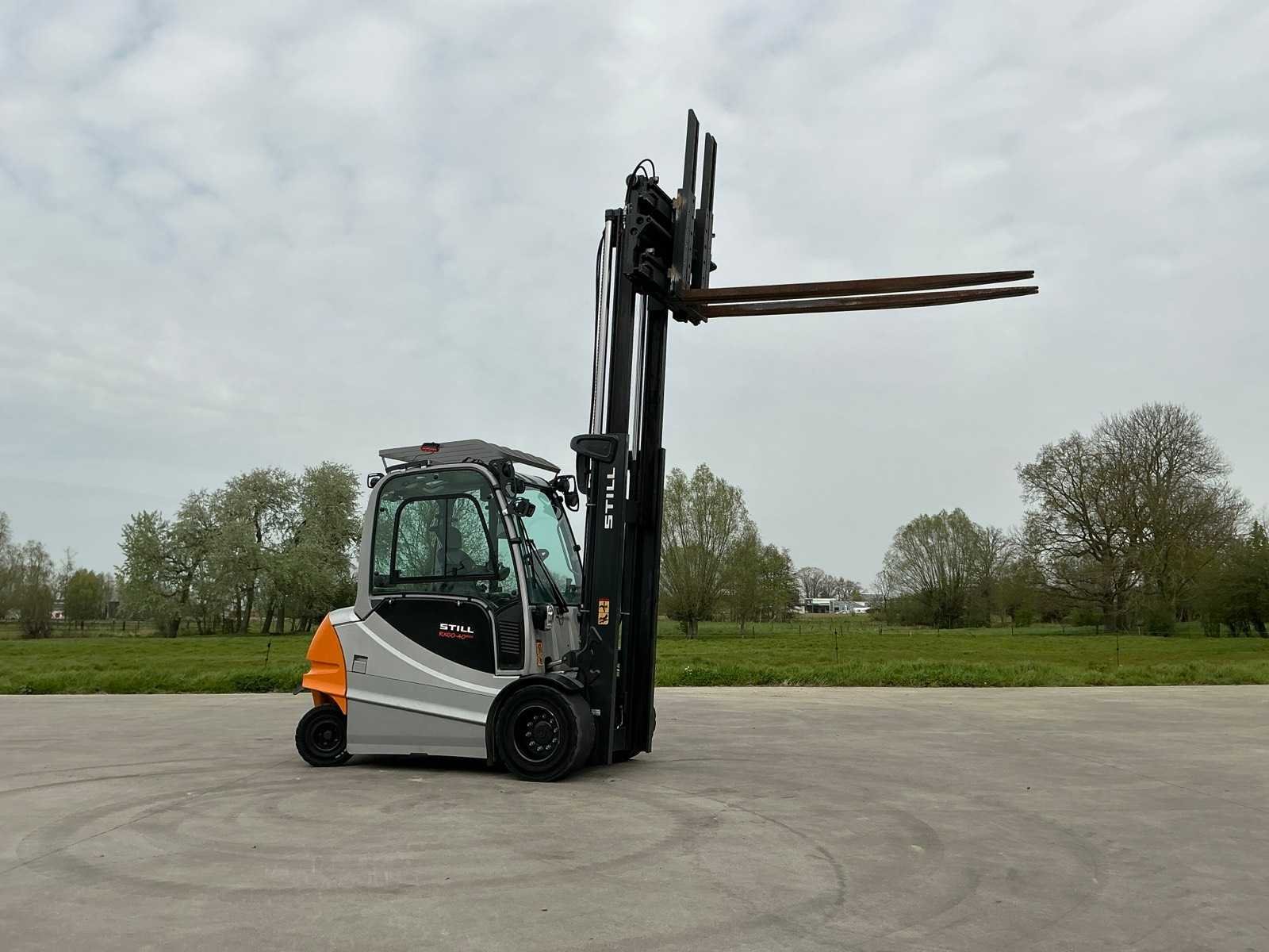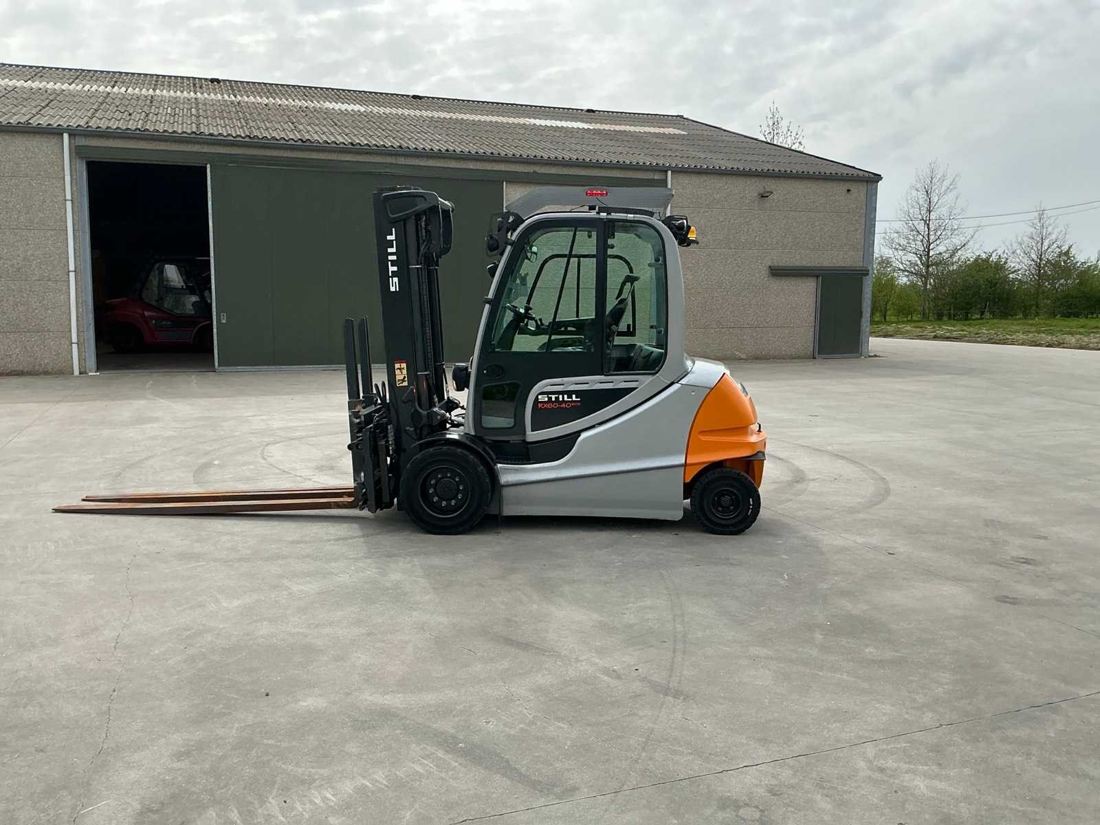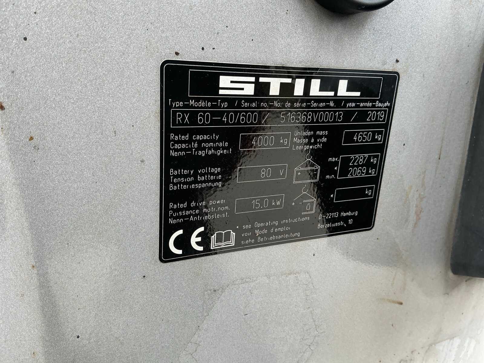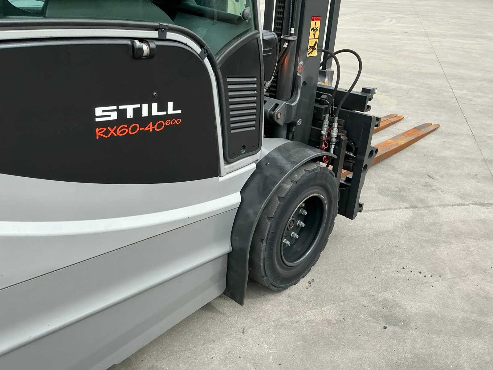 Led werklichten voor en achter , blue spot, flash light , verwarmde gesloten cabine , breedte gevaar lichten , side shift met 4 vorken systeem Merk: Still Type: RX60-40/600 Bouwjaar: 2019 Serienummer: 516368V00013 Brandstof: Elektrisch Mast: Duplex Soort band: Volrubber banden Aantal wielen: 4 Afgelezen urenstand: 3500 Side-shift: true Hydraulisch verstelbare lepels: true Duplex mast: true Eigen gewicht: 6750kg Hefvermogen: 4000kg Lepellengte: 2400mm Min. hefhoogte: 0mm Hefhoogte: 3500mm Vol rubber banden: true Totale afmeting L: 3200mm Totale afmeting Breedte: 1400mm Totale afmeting Hoogte: 2500mm Leveringsvoorwaarden: Gratis op vrachtwagen