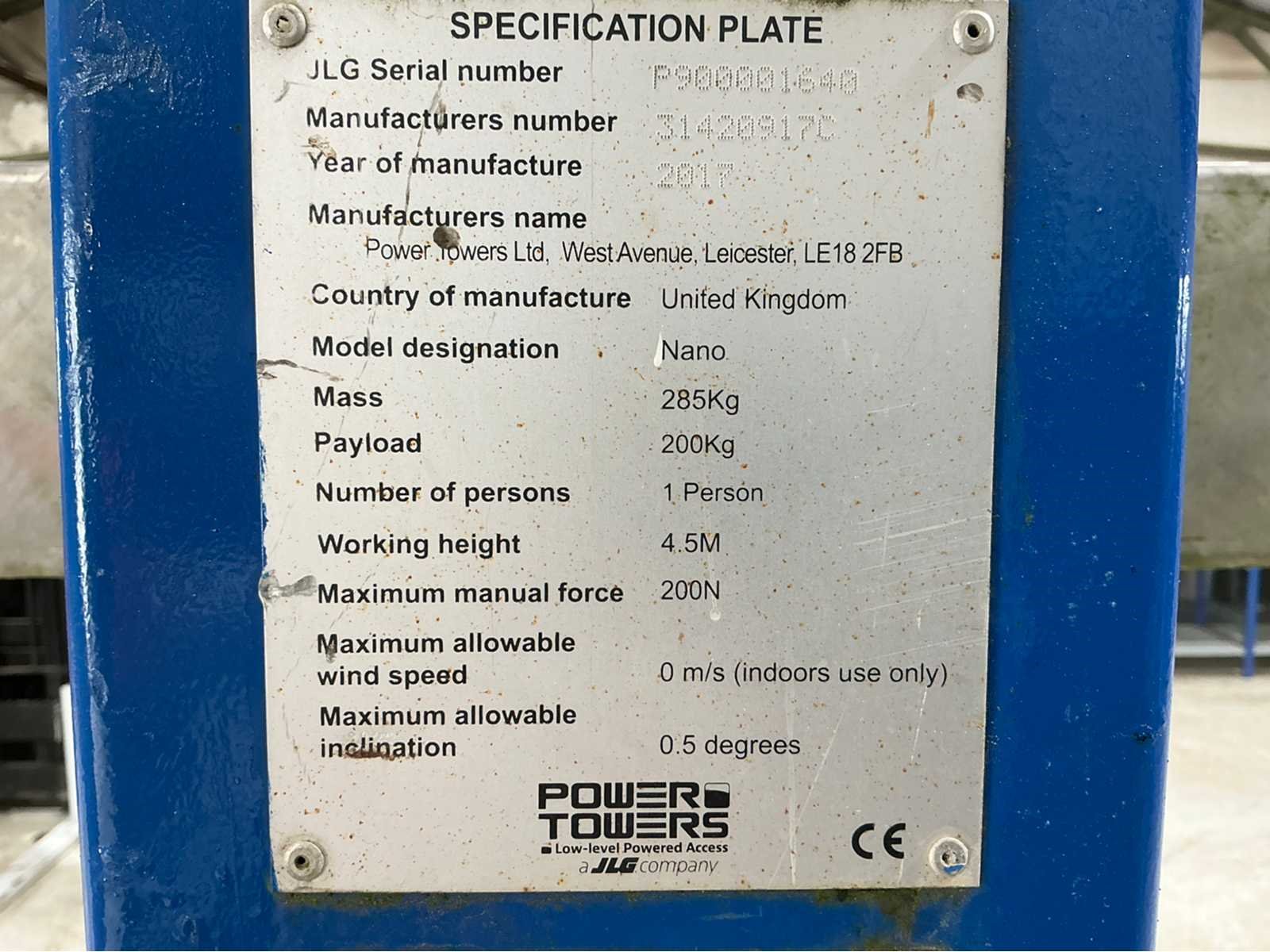 De Power Tower Nano wordt gebruikt als compacte, elektrische werkhoogte-oplossing voor binnenwerk: veilig werken op hoogte waar een ladder eigenlijk niet meer mag, maar een schaarlift te groot is - getest en functioneel - Typische toepassingen: Lampen en armaturen vervangen • Kabelgoten, sensoren, camera’s, sprinklers • Licht onderhoud aan plafonds • Schilder- en herstelwerk • Plafondplaten plaatsen/vervangen • Onderhoud in kantoren, scholen, ziekenhuizen • Verlichting in winkels • Reclameborden / signing ophangen • Licht magazijnonderhoud - met NIEUWE BATTERIJ EN BATTERIJLADER 220 volt aansluiting Merk: JLG Type: Nano Bouwjaar: 2017 Serienummer: P900001640 Elektrisch: true Werkhoogte: 4500mm Plateau afm. l: 1200mm Plateau afm. b: 750mm Platform capaciteit: 200kg Accu lader: true Eigen gewicht: 285kg Totale afmeting L: 1590mm Totale afmeting Breedte: 750mm Leveringsvoorwaarden: Niet gefundeerd - onverpakt