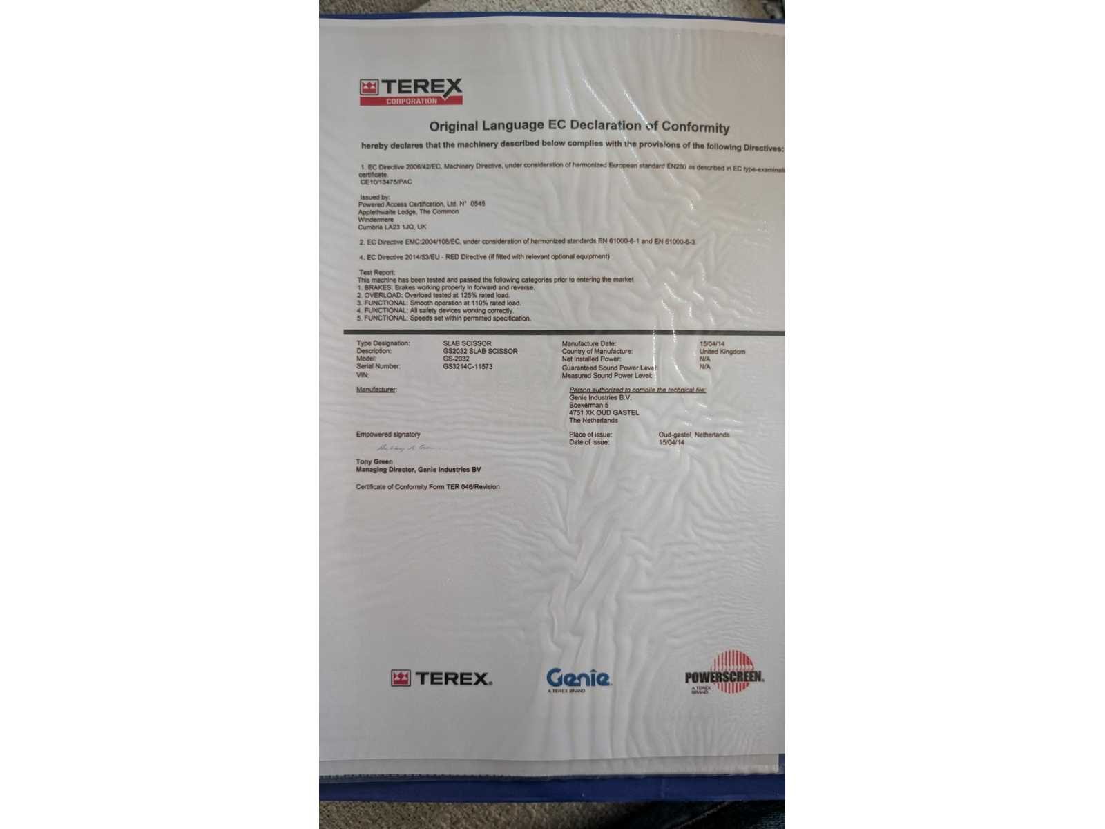 Merk: Genie Type: GS-2032 Serienummer: GS3214C-11573 Bouwjaar: 2014 Brandstof: Elektrisch Hefcapaciteit: 363 kg Werkhoogte: 8,10 m Afgelezen draaiuren: 490 u Eigen gewicht machine: 1826 kg Rijwerk: Wielen Type: Schaarlift Banden: Non-marking banden Kleur: blauw Opties: Platformafmetingen 0.80x2.26m Uitschuifbaar tot 3.17m CE-certificaat Handleiding Beschrijving machine: Machine start, rijdt, stijgt en daalt. Merk: Genie Type: GS-2032 Bouwjaar: 2014 Serienummer: GS3214C-11573 Schaarhoogwerker: true Afgelezen urenstand: 490