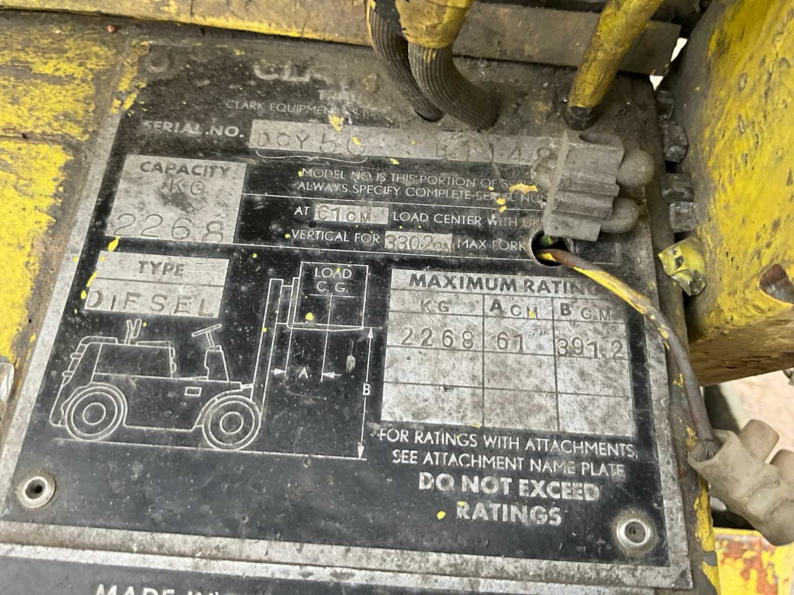 Technische Specificaties • Fabrikant: Clark Equipment • Type aandrijving: Diesel • Capaciteit: 2268 kg • Lastzwaartepunt: 610 mm (Load Center) • Maximale verticale hefhoogte: 3002 mm • Serienummer: DRY508-9184 (mogelijk modelcode beginnend met DRY508) • Maximum Ratings: • A (Afstand lastzwaartepunt): 61 cm • B (Hefhoogte): 3912 mm Let op: bij gebruik van attachments (bv. sideshift of vorkversteller) moet je steeds de aparte capaciteitsplaat raadplegen zoals vermeld: “For ratings with attachments, see attachment name plate. DO NOT EXCEED RATINGS.” ⸻ Bijzonderheden en Context Clark is een gerenommeerd Amerikaans merk dat al sinds de jaren 1910 vorkheftrucks bouwt. Het bedrijf had ook productie in Europa, waaronder België, zoals hier vermeld (”Made in Belgium”). Dit model lijkt afkomstig uit een oudere serie die vaak gebruikt werd in zware industriële omgevingen zoals magazijnen, bouwwerven of transportbedrijven. Een heftruck met een hefvermogen van 2268 kg (oftewel 5000 lbs) is typisch geschikt voor middelzwaar werk. Het dieselmodel is robuust, krachtig en ontworpen voor gebruik buitenshuis of in goed geventileerde loodsen. ⸻ Mogelijke toepassingen • Laden en lossen van paletten • Transport van materialen op bouwplaatsen • Stapelen van zware goederen in opslagruimtes • Industriële toepassingen waar elektrisch niet haalbaar is Merk: Clark Brandstof: Diesel