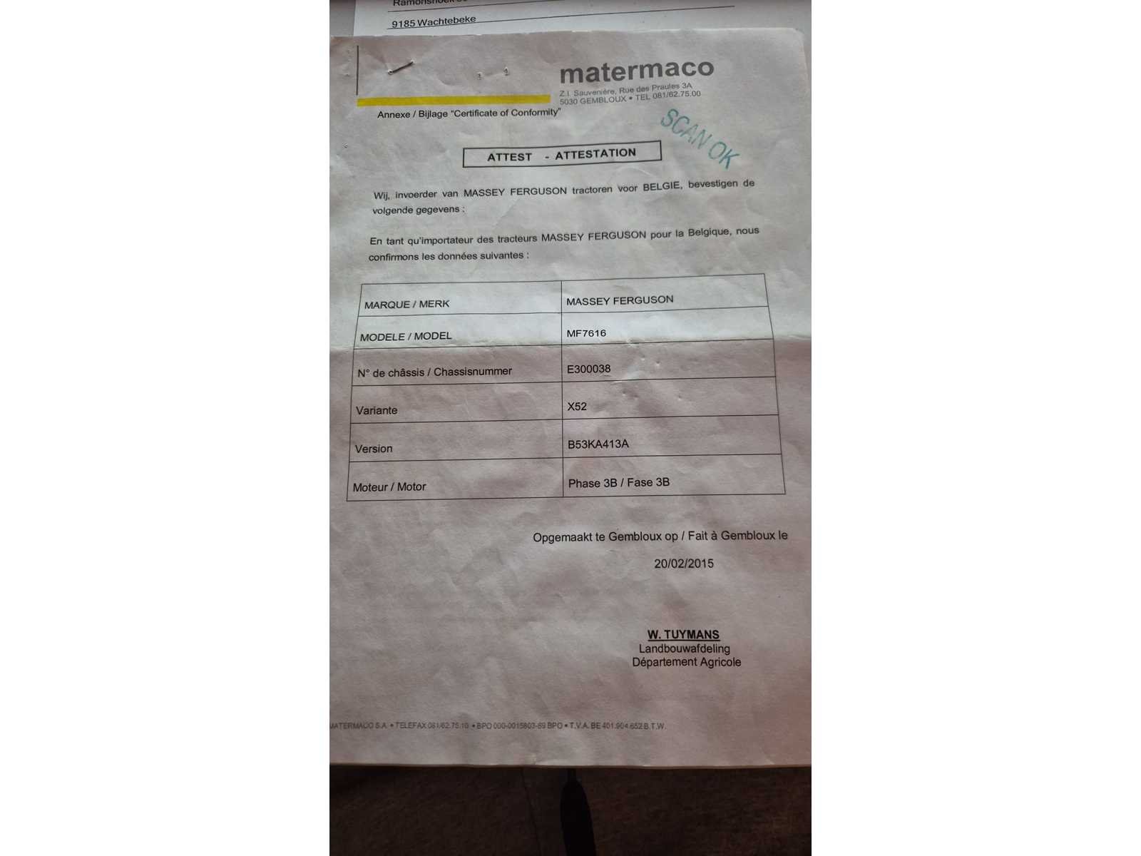 6596cc Opties: 180pk sisu Dyna 6 Fronthef Load sensing Lucht remmen Geveerde vooras Geveerde cabine Airco Electr spiegels Nieuwe banden rondom Groot oh gehad Led werklampen origineel rondom Gekeurd. Volledig gekuist. Vol getankt. Merk: Massey Ferguson Type: MF 7616 Bouwjaar: 2015 Serienummer: E300038 Motorvermogen (kW): 133kW Afgelezen urenstand: 6661 Datum eerste toelating: 23/03/2015