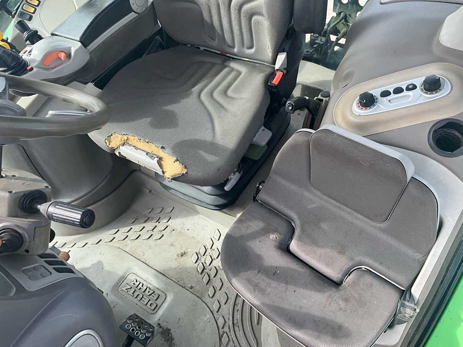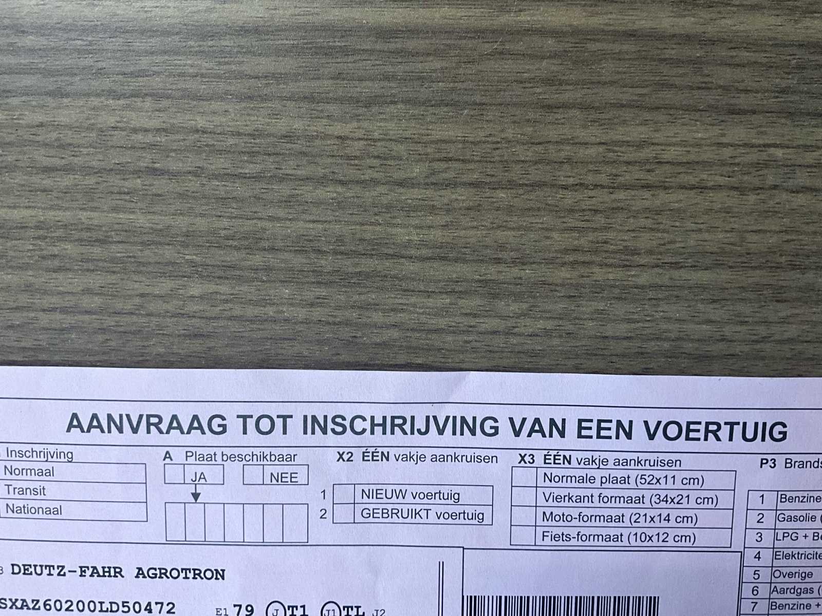 Zeer degelijke en goed onderhouden Deutz-Fahr Agrotron TTV 420 met traploze transmissie & airco Sterke en comfortabele trekker, ideaal voor loonwerk, transport en landbouwtoepassingen. Technisch volledig in orde en direct inzetbaar - UITRUSTING: ✔️ Traploze transmissie (TTV) ✔️ Fronthef ✔️ Achterhef + PTO ✔️ PTO snelheden: 540 / 540E / 1000 / 1000E ✔️ 3-4 hydraulische ventielen achter ✔️ Hydrauliekbediening via joystick ✔️ Cabine met verwarming & airco ✔️ Luchtgeveerde stoel ✔️ Radio ✔️ Werkverlichting ✔️ Michelin banden - STAAT: Trekker is technisch goed en volledig werkend; Motor, transmissie en hydrauliek functioneren naar behoren; Direct inzetbaar - Cosmetisch: Bestuurdersstoel heeft slijtage (zie foto), Normale minieme gebruikssporen rondom 👉 Geen invloed op werking Merk: Deutz-Fahr Type: Agrotron TTV 420 Bouwjaar: 2015 Motorvermogen (kW): 154kW Afgelezen urenstand: 7904 Versnellingsbaktype: TTV Bandenmaat achter: 650/65 R38 Aantal hydraulische ventielen achter: 4 Fronthefinrichting: true Cabine: true Luchtgeveerde stoel: true Eigen gewicht: 6500kg Totale afmeting L: 4700mm Totale afmeting Breedte: 2550mm Totale afmeting Hoogte: 3000mm Chassisnummer: WSXAZ60200LD50472 Datum eerste toelating: 29/12/2015