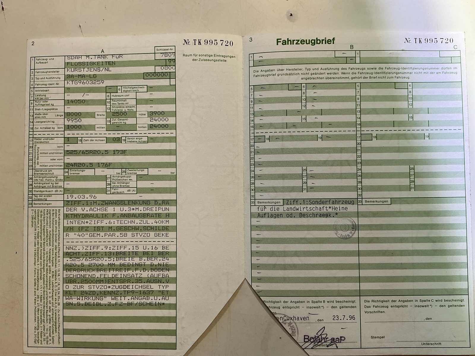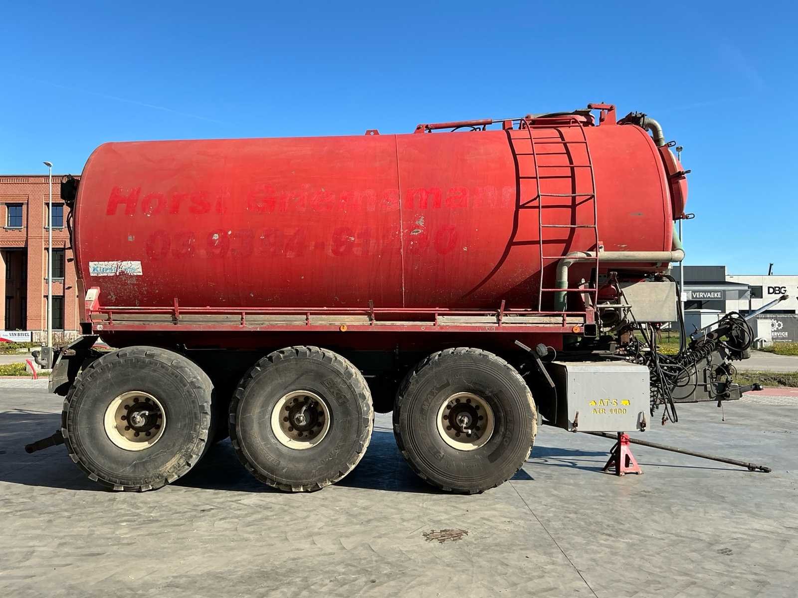Kurstjens Tri-axer Chassis: -Vloeistofgeveerd -Luchtgeremd -SAE assen -Mechanisch gedwongen gestuurd -Danfoss hydraulic -Walterscheid groothoekaftak-as -Topdruk cilinder -4400L schroefcompressor -automatisch smeersysteem Mestdank -Borger FL1036 pomp - gereviseerd -Fredo FT4100 snijkast -AT-systems ISObus dosseercomputer Merk: Kurstjens Type: Tri-axer Bouwjaar: 1996 Serienummer: KTG9603259 Tankinhoud: 22m³ Met onderstel: true Bandenmaat: 24/20,5 Type pomp: Borger FL1036 Hefinrichting: true Luchtdrukwisselsysteem: true Doseercomputer: true Eigen gewicht: 1100kg