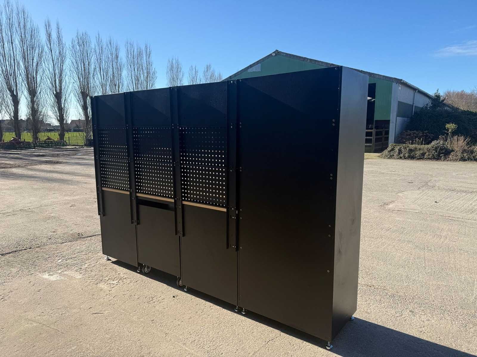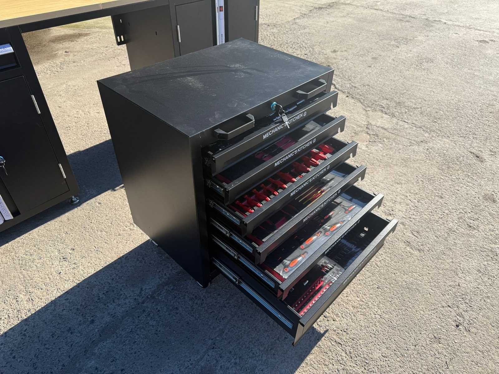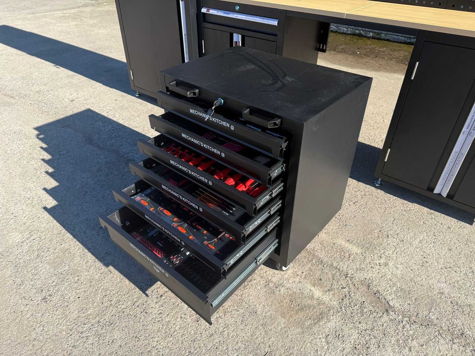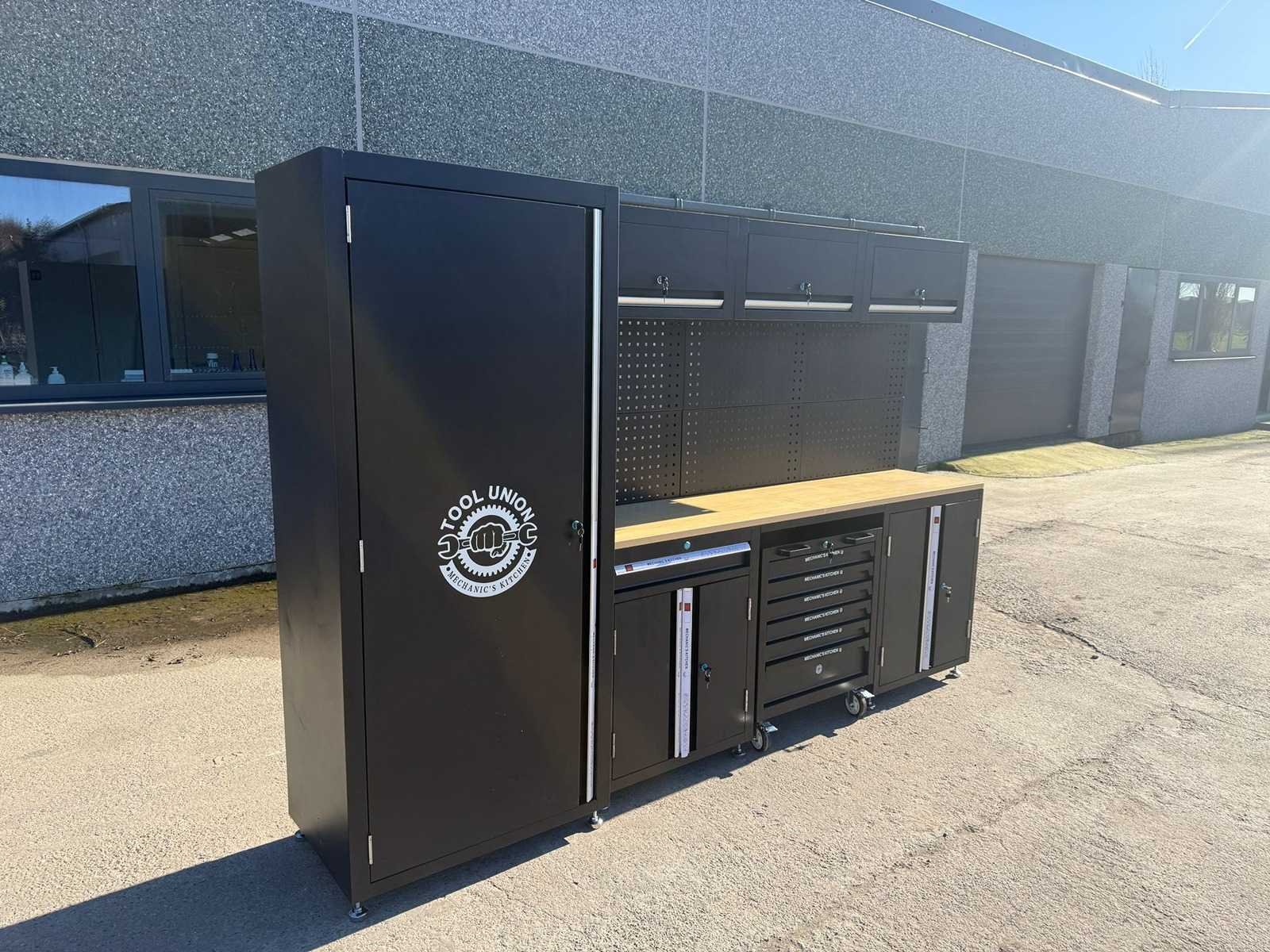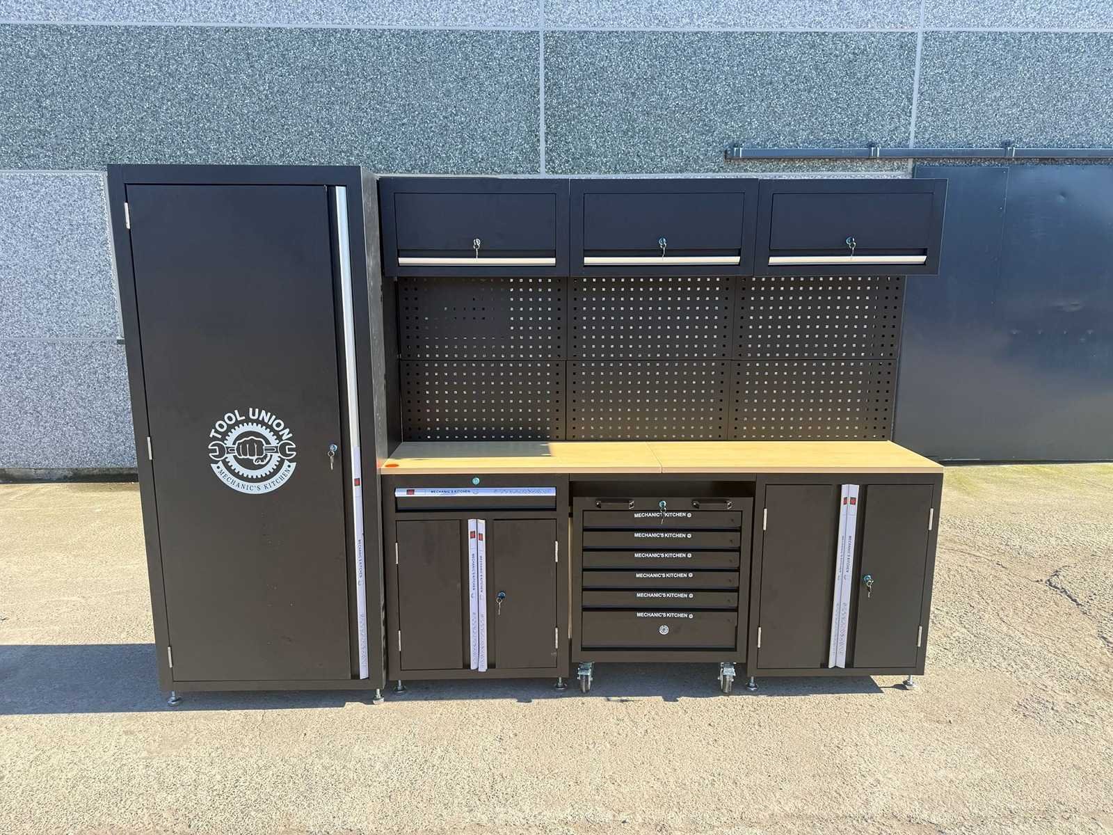 Complete werkplaatsinrichting Gevulde werkplaatskar Hout werkblad Gedemonteerd geladen Merk: Tool union Model: Mechanic's kitchen Kleur: Zwart Gewicht: 420kg Lengte: 2850cm Breedte: 550cm Hoogte: 1950cm Materiaal: Metaal en hout Leveringsvoorwaarden: Geladen op vrachtwagen
