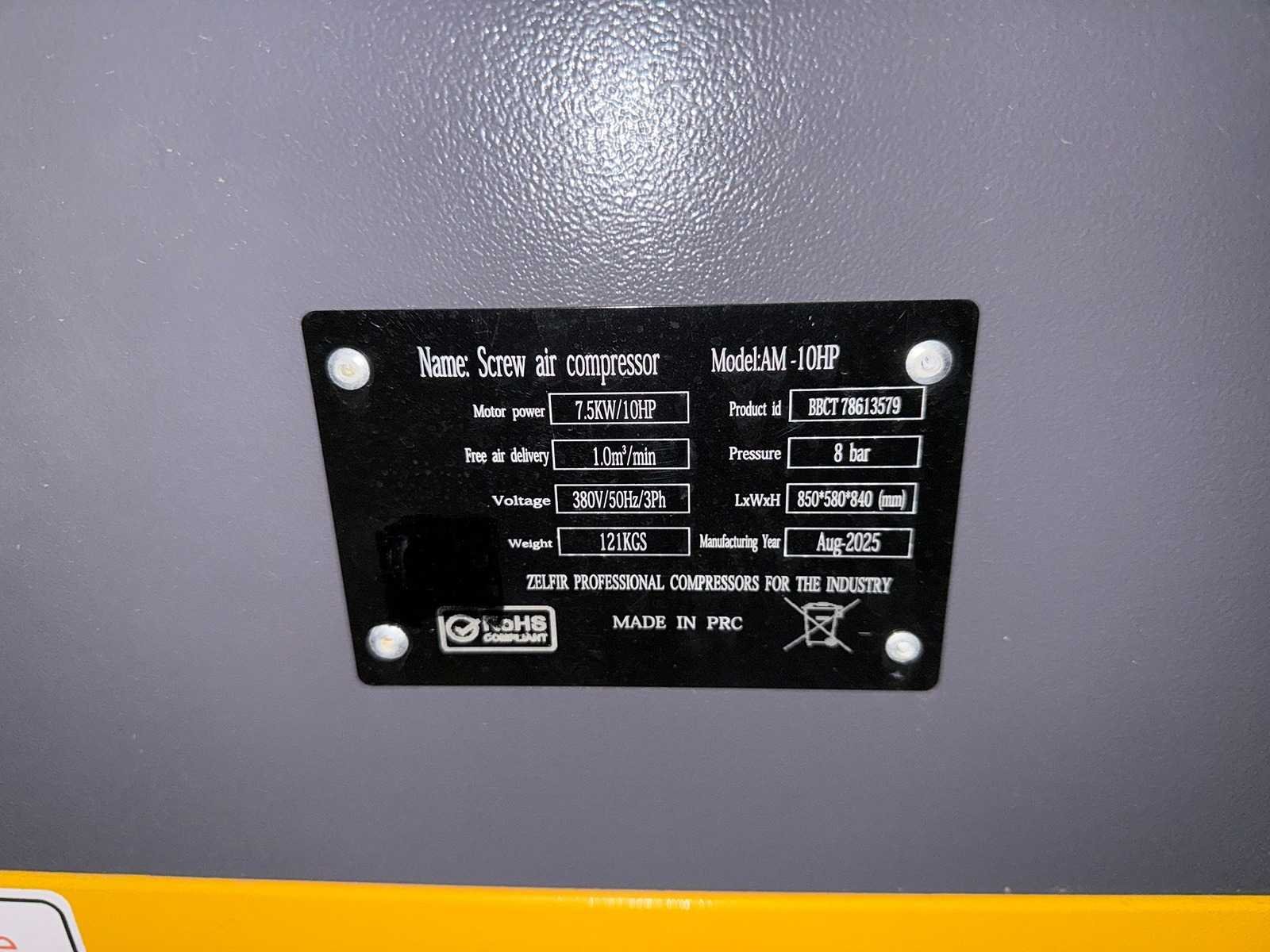 Nieuw Zelfir schroefcompressor Perfecte werking Merk: Zelfir Type: AM-10 HP Bouwjaar: 2025 Serienummer: 3579 Capaciteit.: 8-10bar Luchtstroom: 1000l/min Vermogen: 7.5kW Afgelezen urenstand: 0 Luchtdroger: true Aansluiting: 400V Eigen gewicht: 121kg Totale afmeting L: 850mm Totale afmeting Breedte: 600mm Totale afmeting Hoogte: 850mm Leveringsvoorwaarden: Geladen op vrachtwagen
