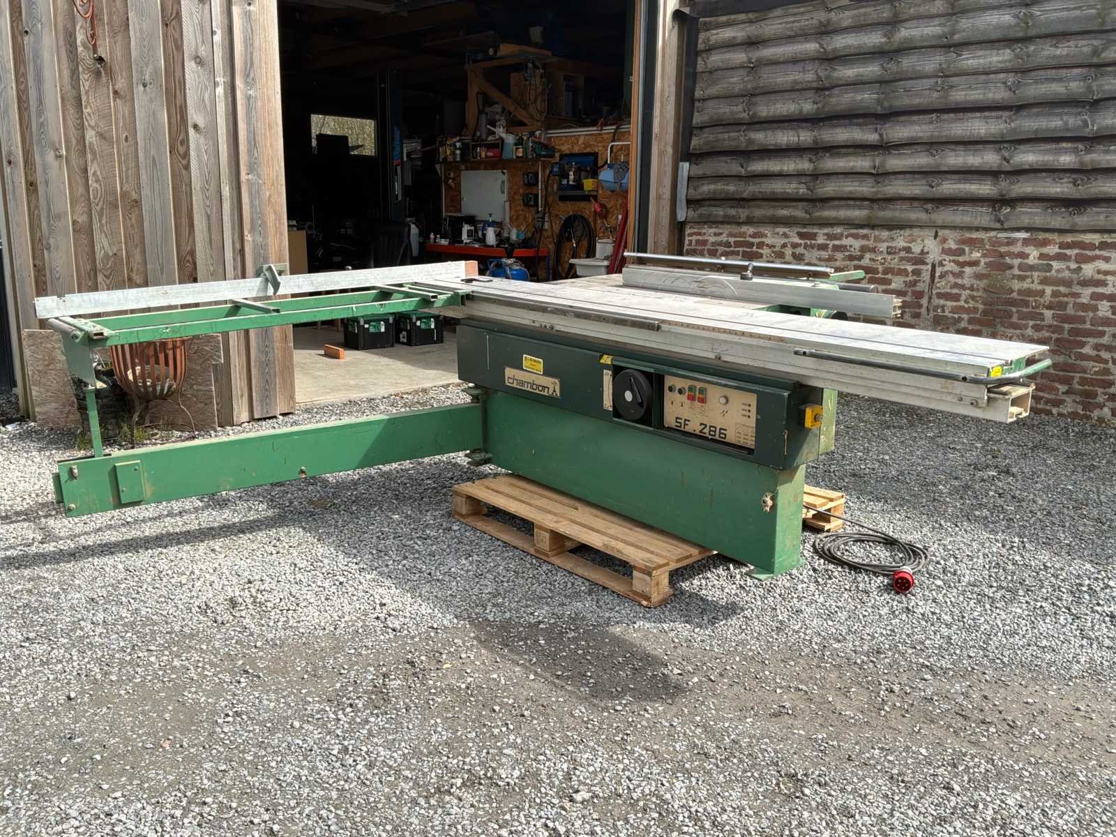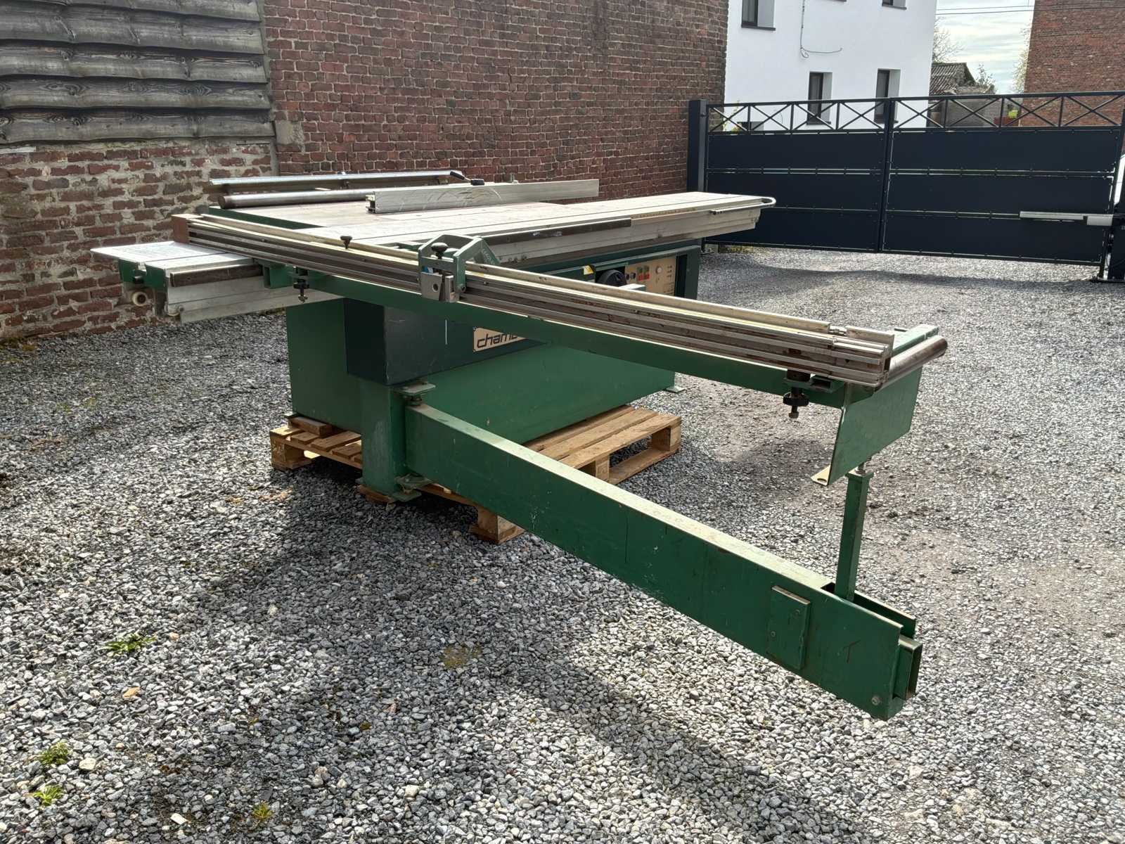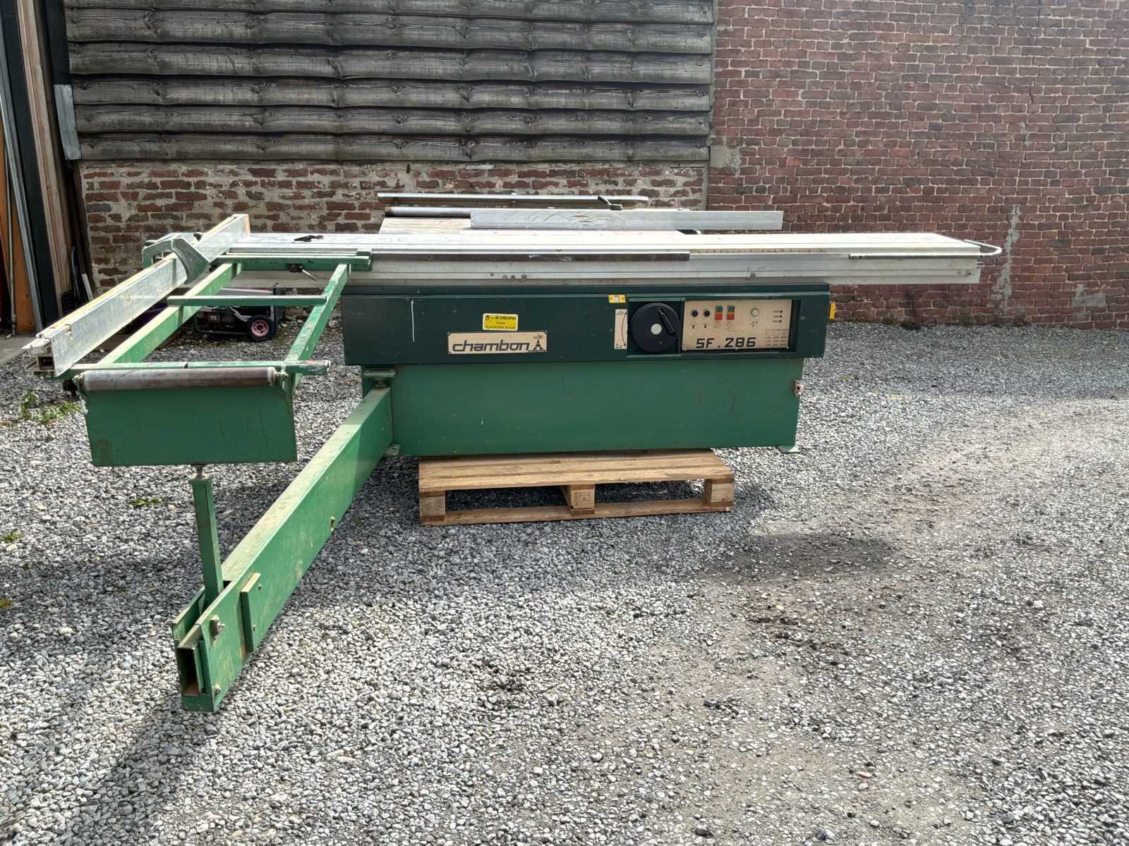 Chambon SF 286 professionele schuiftafelzaag werkt in goede staat. Robuuste en betrouwbare machine, ideaal voor timmerwerk, meubelmaken of houtwerkplaats. ✔️ Schuiftafel voor het snijden van panelen ✔️ Kantelblad (versteksnede) ✔️ Puntenmachine (voorgesneden voor melaminepanelen) ✔️ Meerdere toerentallen (3000 / 4000 / 5000 tpm) ✔️ Riphek en snijliniaal Merk: Chambon Type: SF 286 Zaagblad Ø: 300mm Zaaghoogte: 100mm Tafel afmeting l: 3000mm Tafel afmeting b: 1000mm Motorvermogen (kW): 5.5kW Aansluiting: 380V Machinegewicht: 900kg