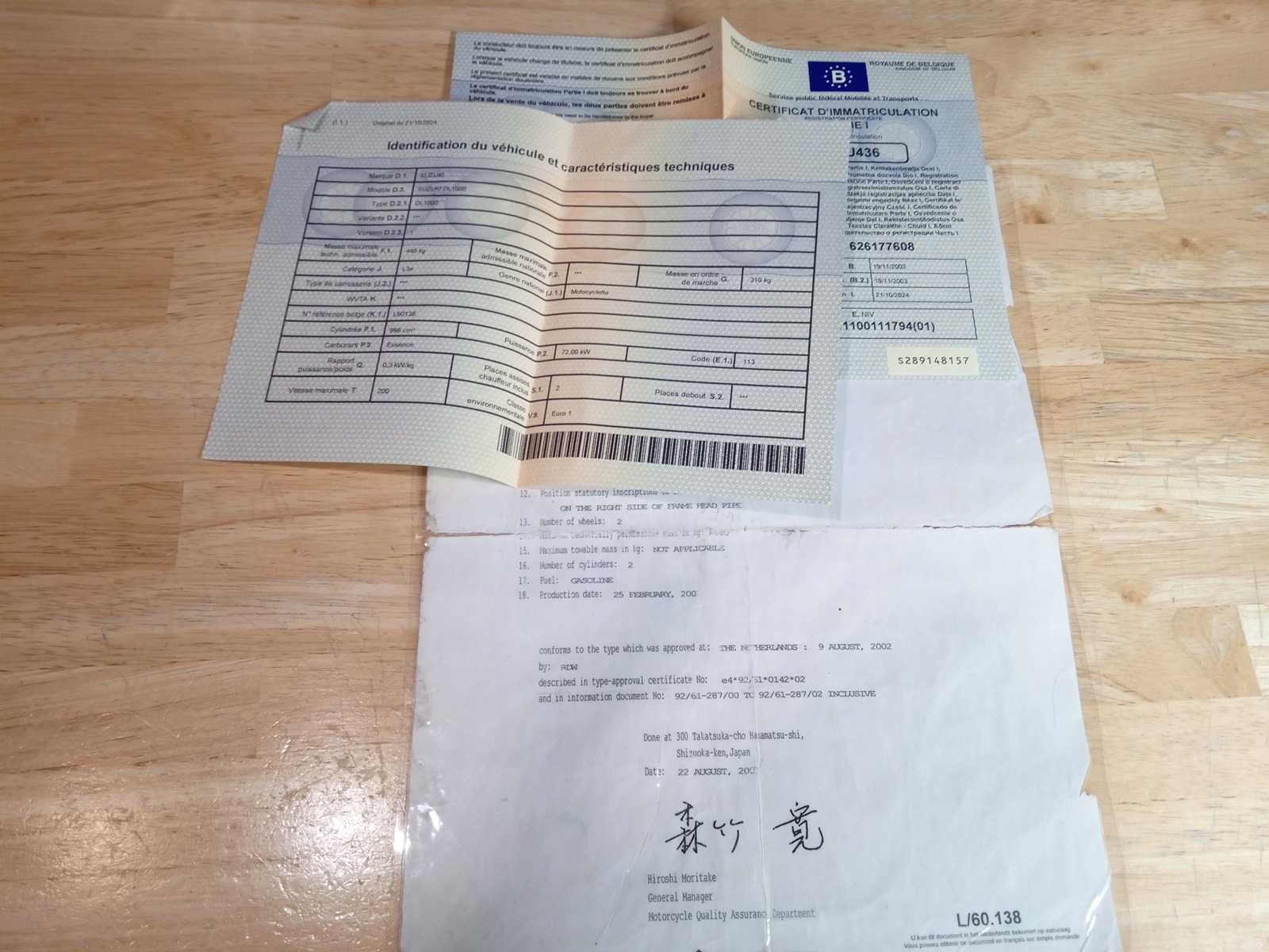 Inschrijvingsbewijs deel 1 en 2 aanwezig, gelijkvormigheidsattest aanwezig kilometerstand niet afleesbaar Merk: suzuki Model: DL 1000 Chassisnummer: JS1BS111100111794 Cilinderinhoud: 1000cc Datum eerste toelating: 19/11/2003 Vermogen (kW): 72kW Aantal sleutels: 2 Boorddocumenten aanwezig?: true Startinformatie: Start niet, accu te zwak Bouwjaar: 2003