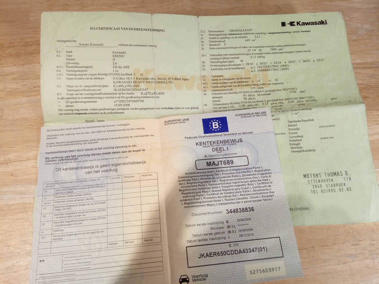 Inschrijvingsbewijs deel 1 aanwezig, gelijkvormigheidsattest aanwezig . Merk: kawasaki Model: er6 n Chassisnummer: JKAER650CDDA43347 Cilinderinhoud: 650cc Datum eerste toelating: 26/06/2009 Vermogen (kW): 25kW Afgelezen kilometerstand: 22000km Aantal sleutels: 1 Boorddocumenten aanwezig?: true Startinformatie: JA Bouwjaar: 2009