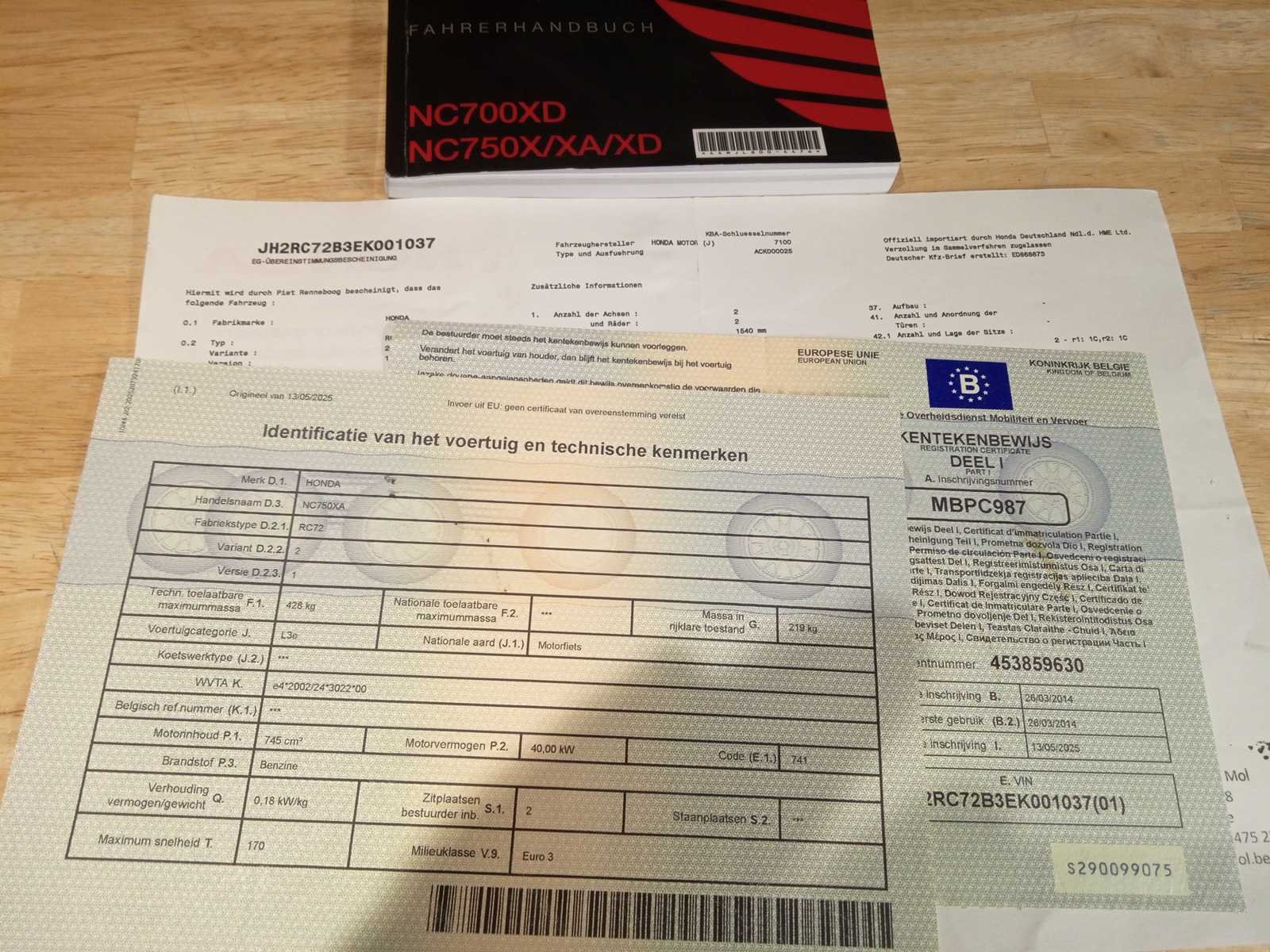 Inschrijvingsbewijs deel 1 en deel 2 aanwezig, gelijkvormigheidsattest aanwezig . Opmerking Ongeval schade . Merk: HONDA Model: NC 750X Chassisnummer: JH2RC72B3EK001037 Cilinderinhoud: 750cc Datum eerste toelating: 26/03/2014 Vermogen (kW): 40kW Afgelezen kilometerstand: 23200km Aantal sleutels: 1 Boorddocumenten aanwezig?: true Startinformatie: JA Bouwjaar: 2014