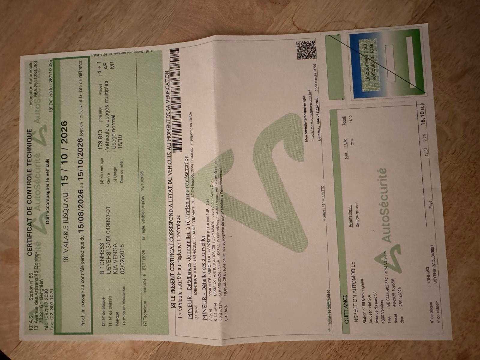 Deze wagen start en rijdt zonder problemen. Documenten aanwezig, zie foto’s voor verdere details. Merk: Kia Model: Venga Bouwjaar: 2015 Afgelezen kilometerstand: 182666km Cilinderinhoud: 1396cc Vermogen (kW): 66kW Brandstof: diesel Chassisnummer: U5YEH813ADL049897 Datum eerste toelating: 02/02/2015 Aantal zitplaatsen: 5 Kleur: Wit Transmissie: Handgeschakeld Emissieklasse: Euro 5 Nationaliteit documenten: België Start en rijdt: Ja Vavato voert geen technische keuring uit.: true Inschrijvingsbewijs - deel 1 : Aanwezig Inschrijvingsbewijs - deel 2: Aanwezig